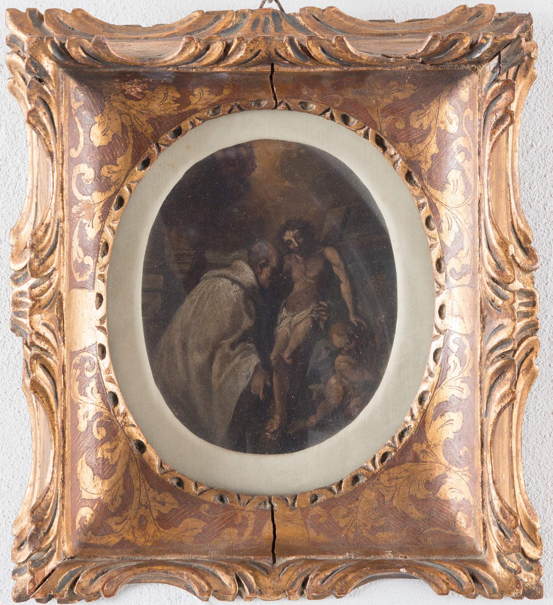 Maestro del XVIII secolo "Cristo con santo". Olio su tavola. Cm 17x13,5.