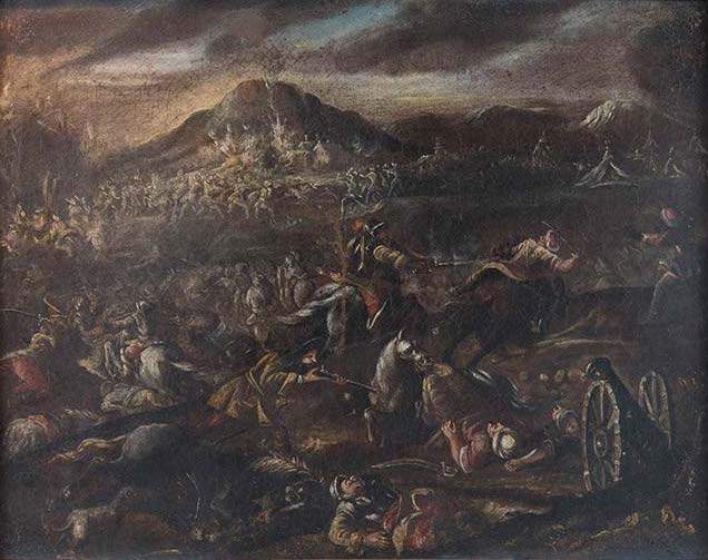 Maestro del XVII secolo "Scena di battaglia". Olio su tela. Cm 53x67,5.