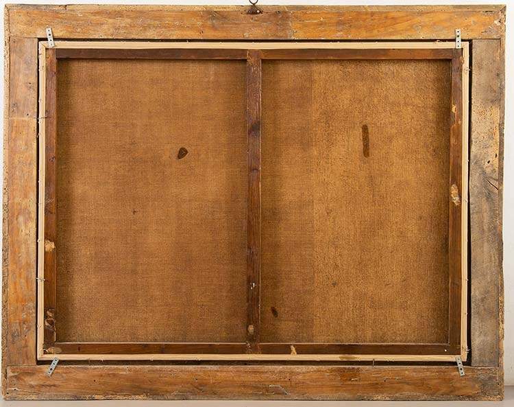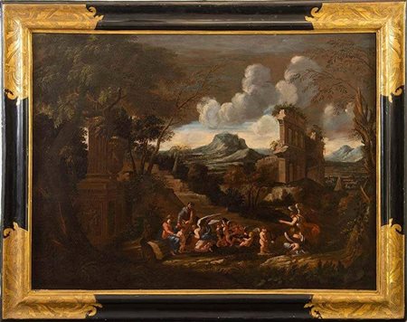 Maestro dell'Italia Centrale del XVII secolo "Paesaggio con natività e angeli". Olio su tela. Cm 100x135.