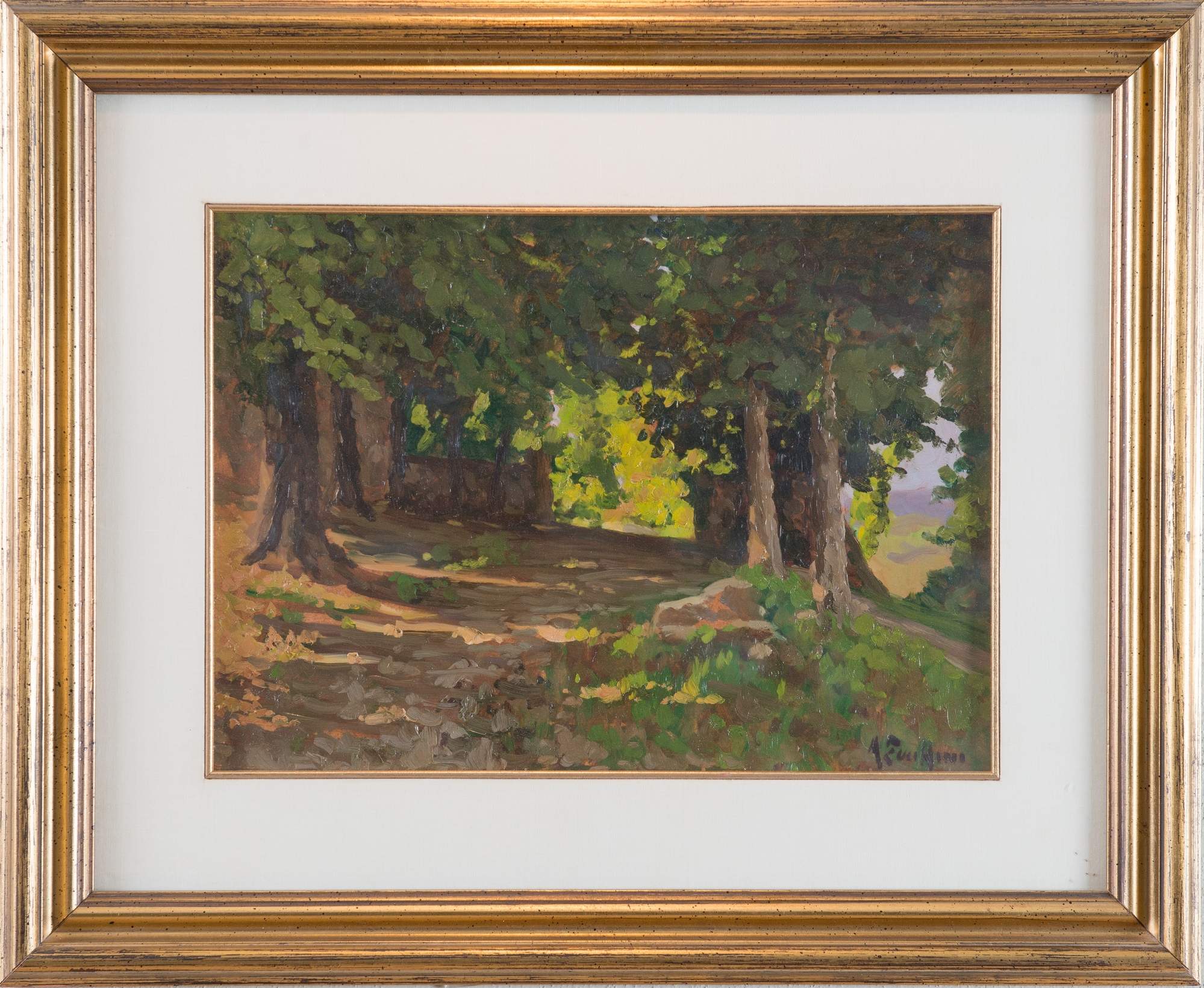 AGOSTINO ZUCCHINI (Fiesso di Budrio 1894 - Bologna 1972) “Paesaggio boschivo”. Olio su faesite. Cm 30x41,5. Opera firmata in basso a destra A. Zucchini.