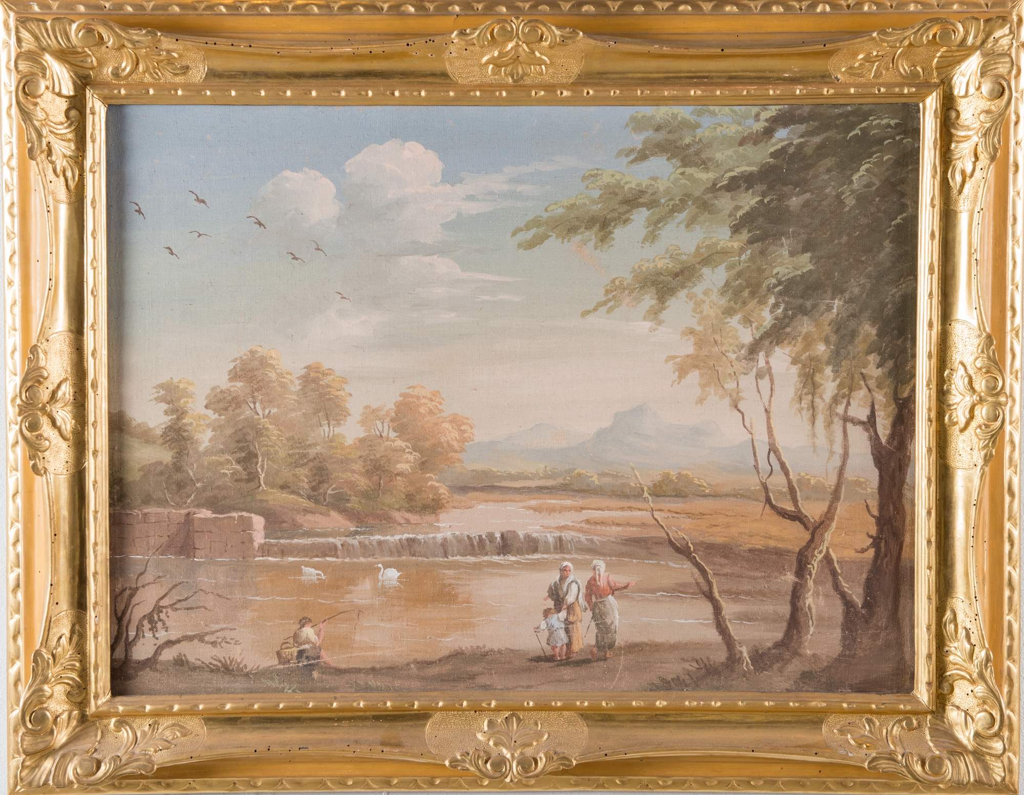 Pittore anonimo del XX secolo. “Veduta”. Tempera su tela, in stile del XVIII secolo. Cm 56x75,5.