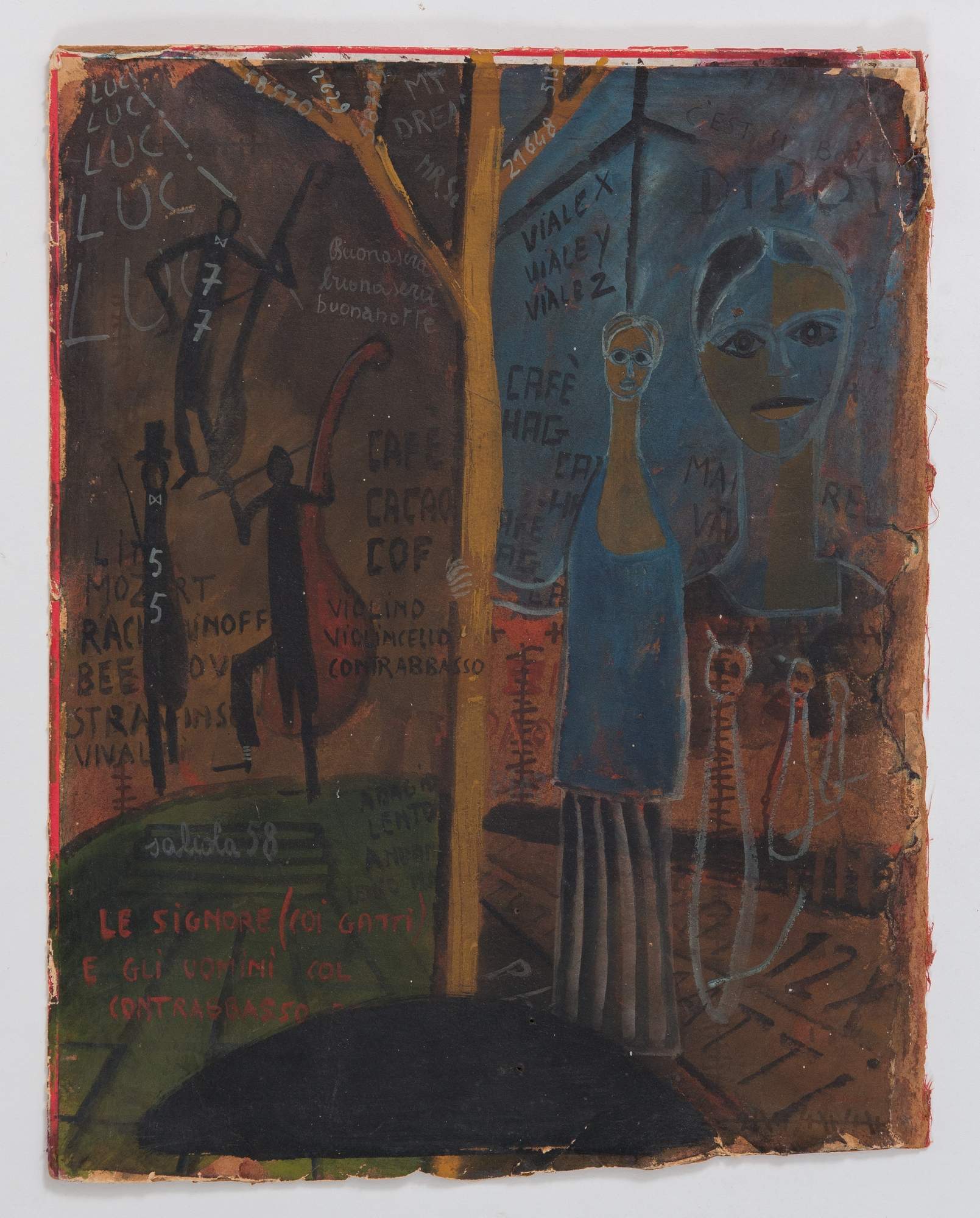 ANTONIO SALIOLA (Bologna 1939) "Le signore coi gatti e gli uomini con il contrabbasso", 1958. Tecnica mista su carta applicata su cartone. Cm 30x23,5. Opera firmata e datata in basso a destra Antonio Saliola 58.