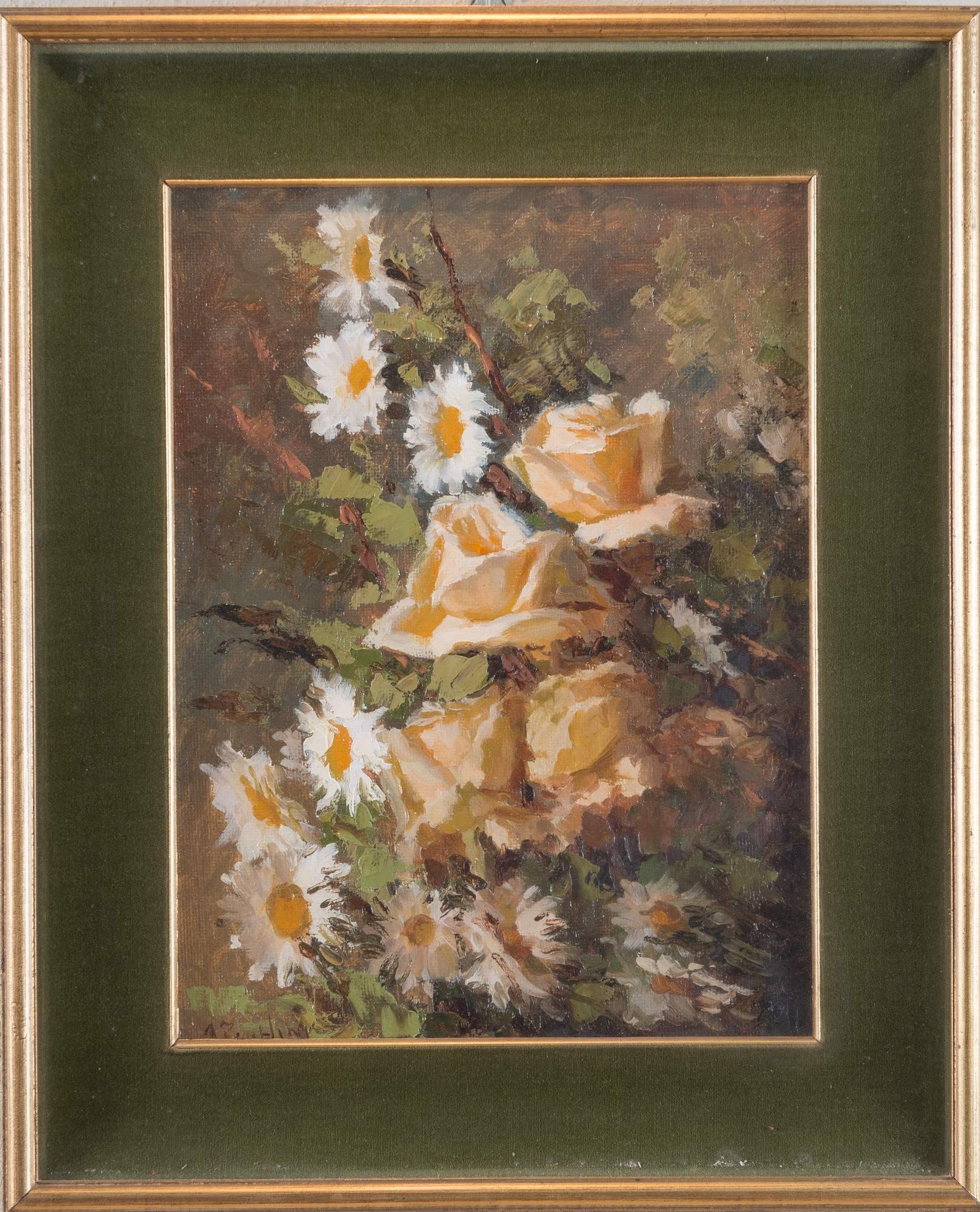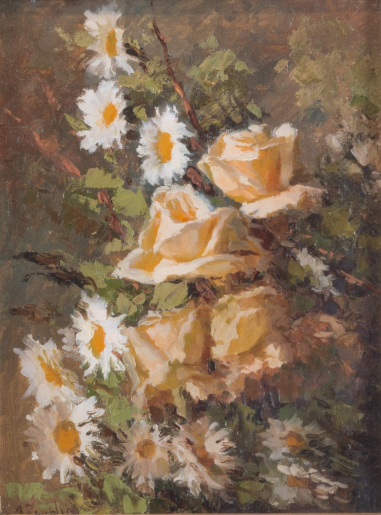 AGOSTINO ZUCCHINI (Fiesso di Budrio 1894 - Bologna 1972) “Rose e margherite", 1963. Olio su tela. Cm 40x30. Opera firmata in basso a sinistra A. Zucchini.