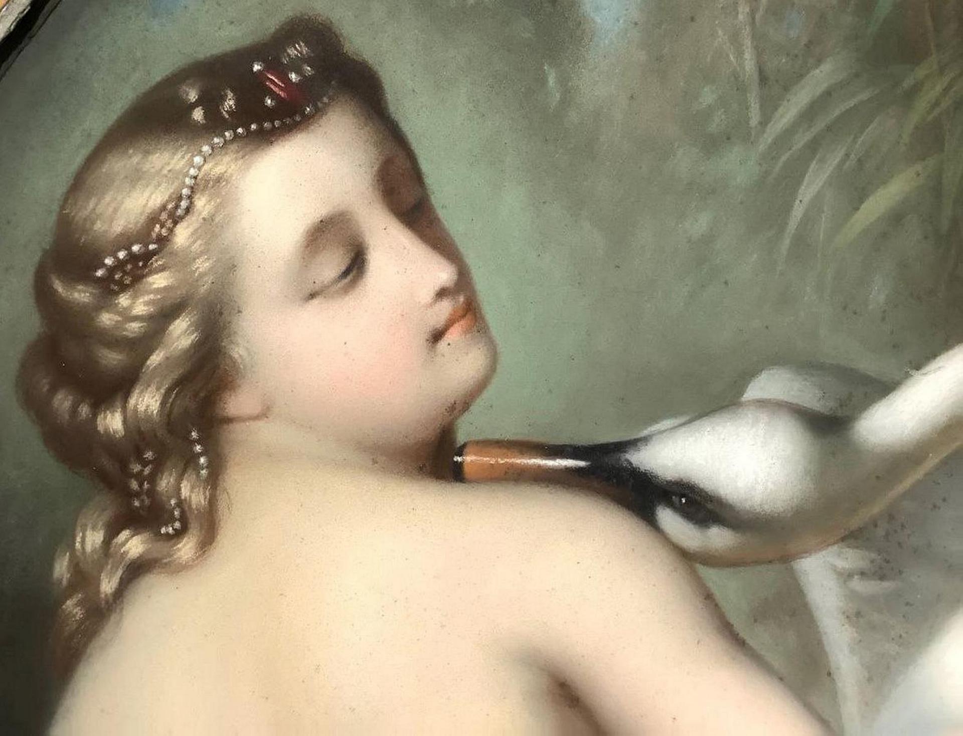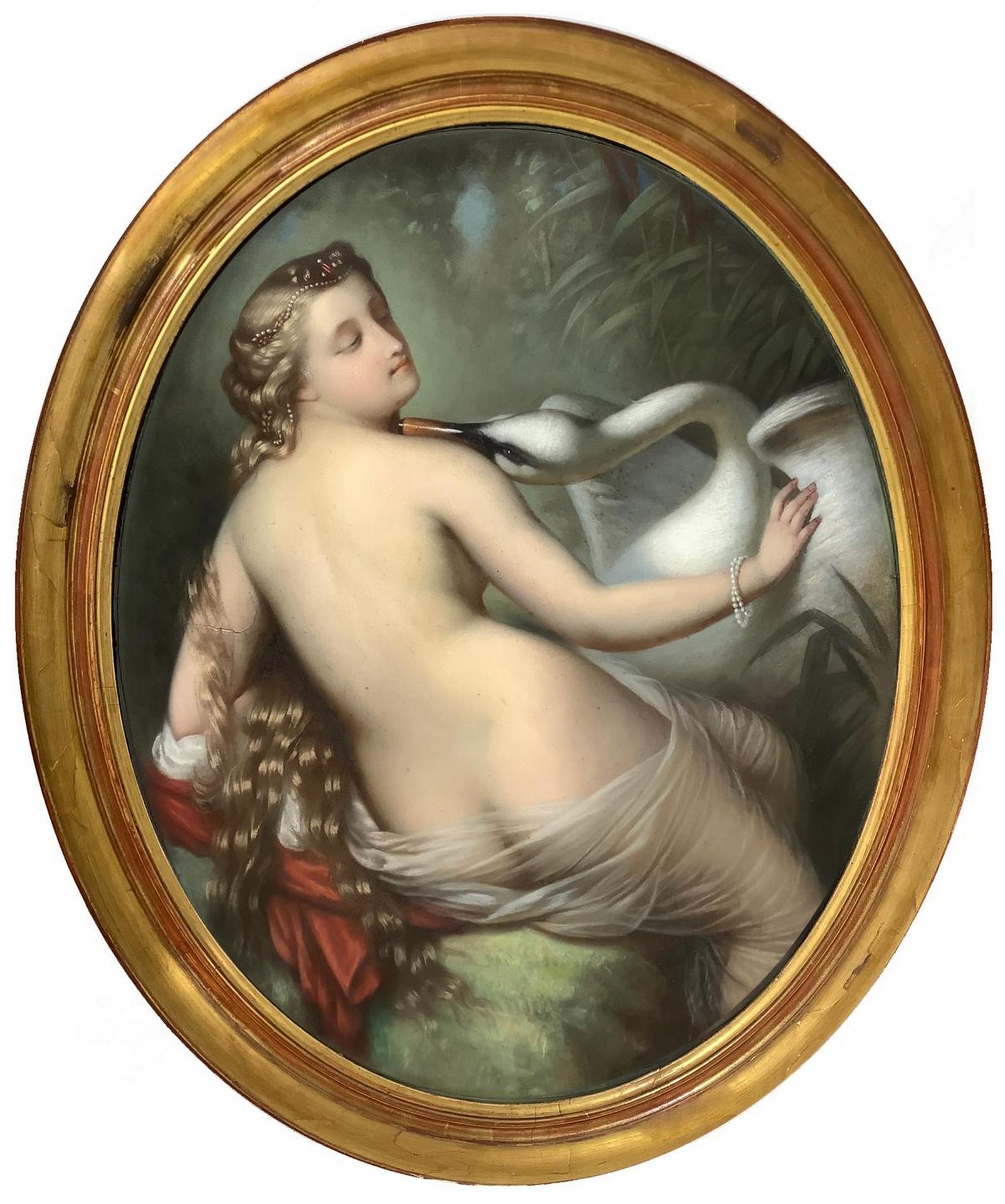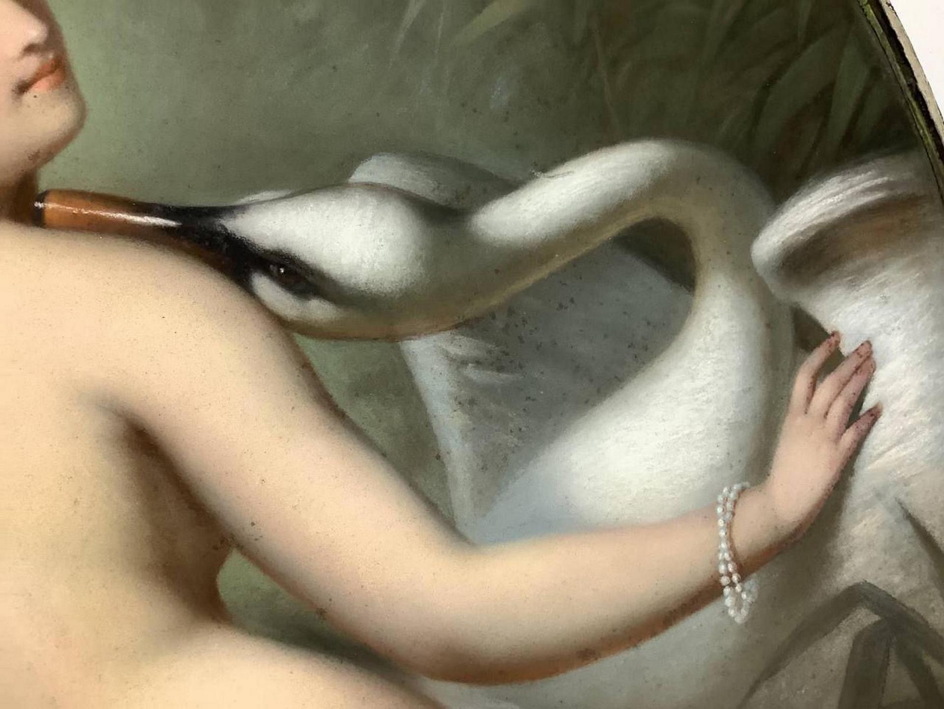 Pastello ovale su cartoncino raffigurante Leda e il cigno, XIX secolo. Cm...