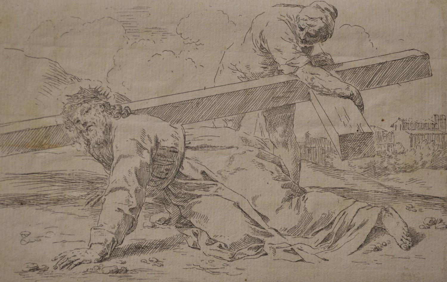 Simone Cantarini CRISTO CADUTO SOTTO LA CROCE acquaforte, foglio cm 12x19,2...