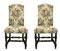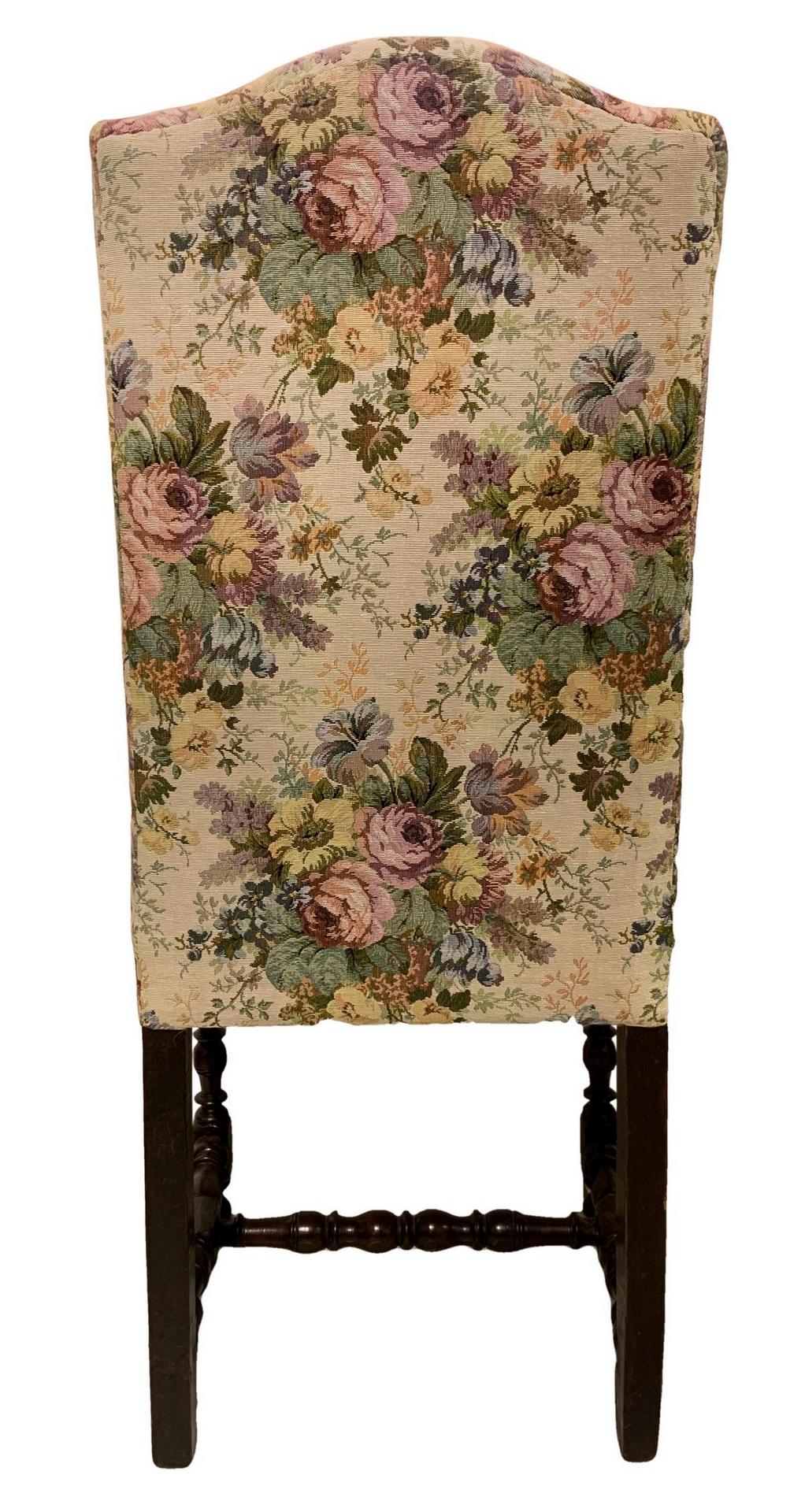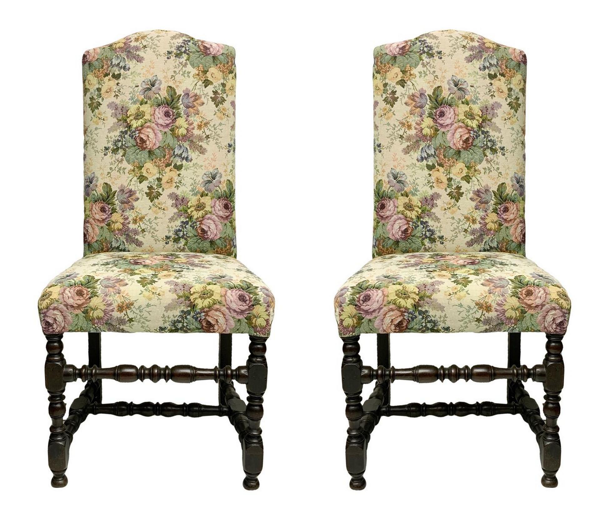 Coppia di seggioloni, Lombardia, Italia, XVIII secolo. Schienale alto mosso nella sommita' . Gambe tornite a rocchetto con piede a cipolla, collegate ad H da un traversa tornita. Seduta e spalliera imbottita con tappezzeria floreale in ottime condizioni. H 144x55x50