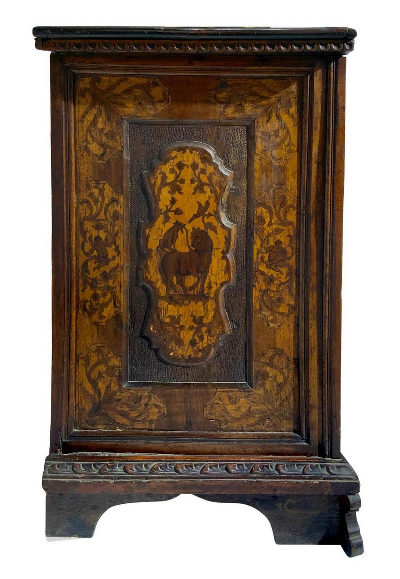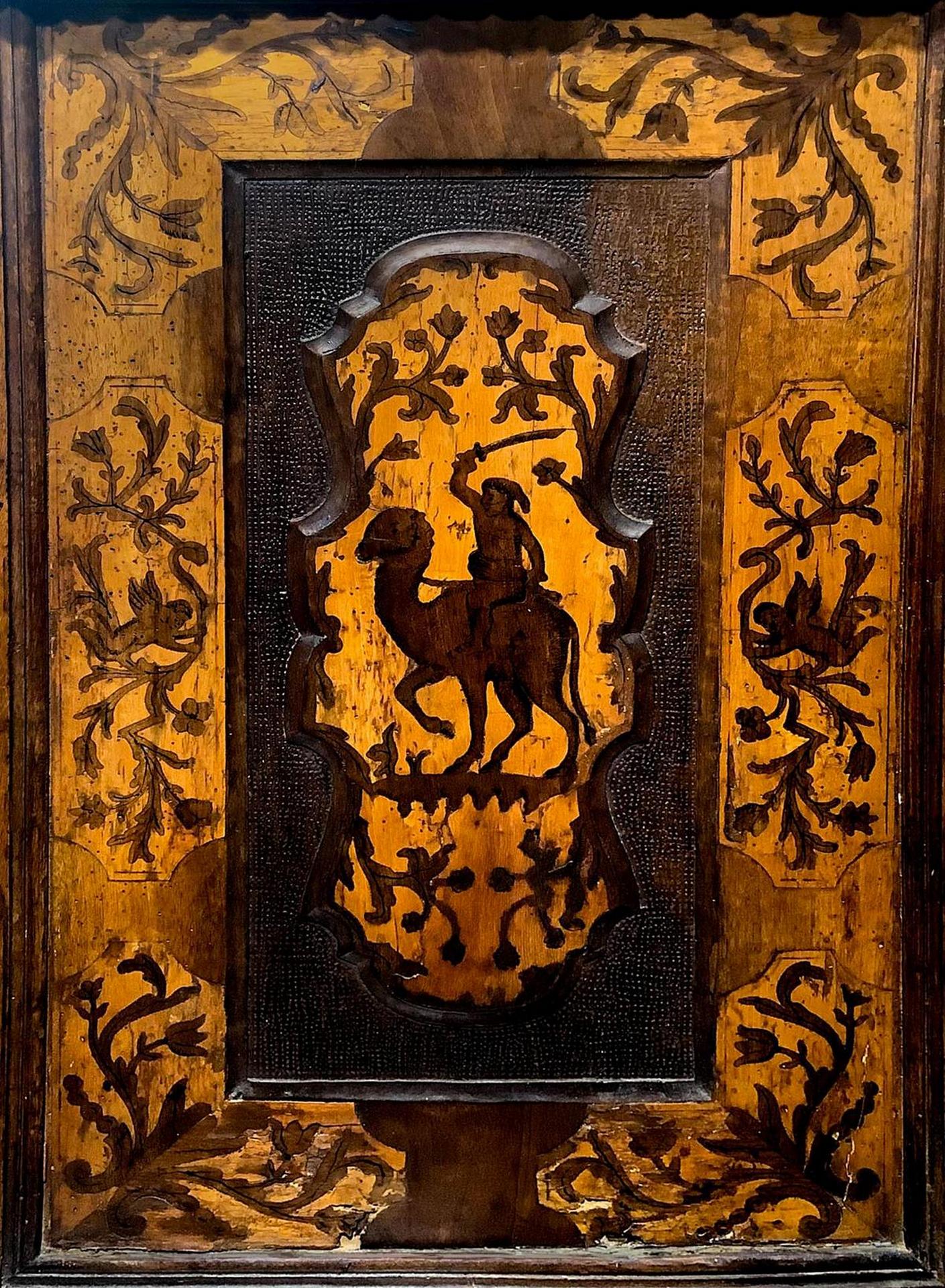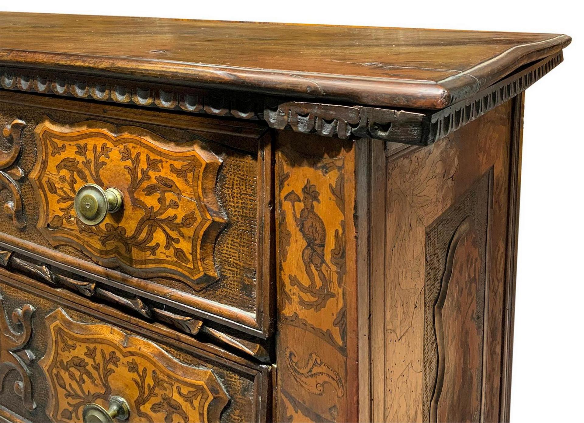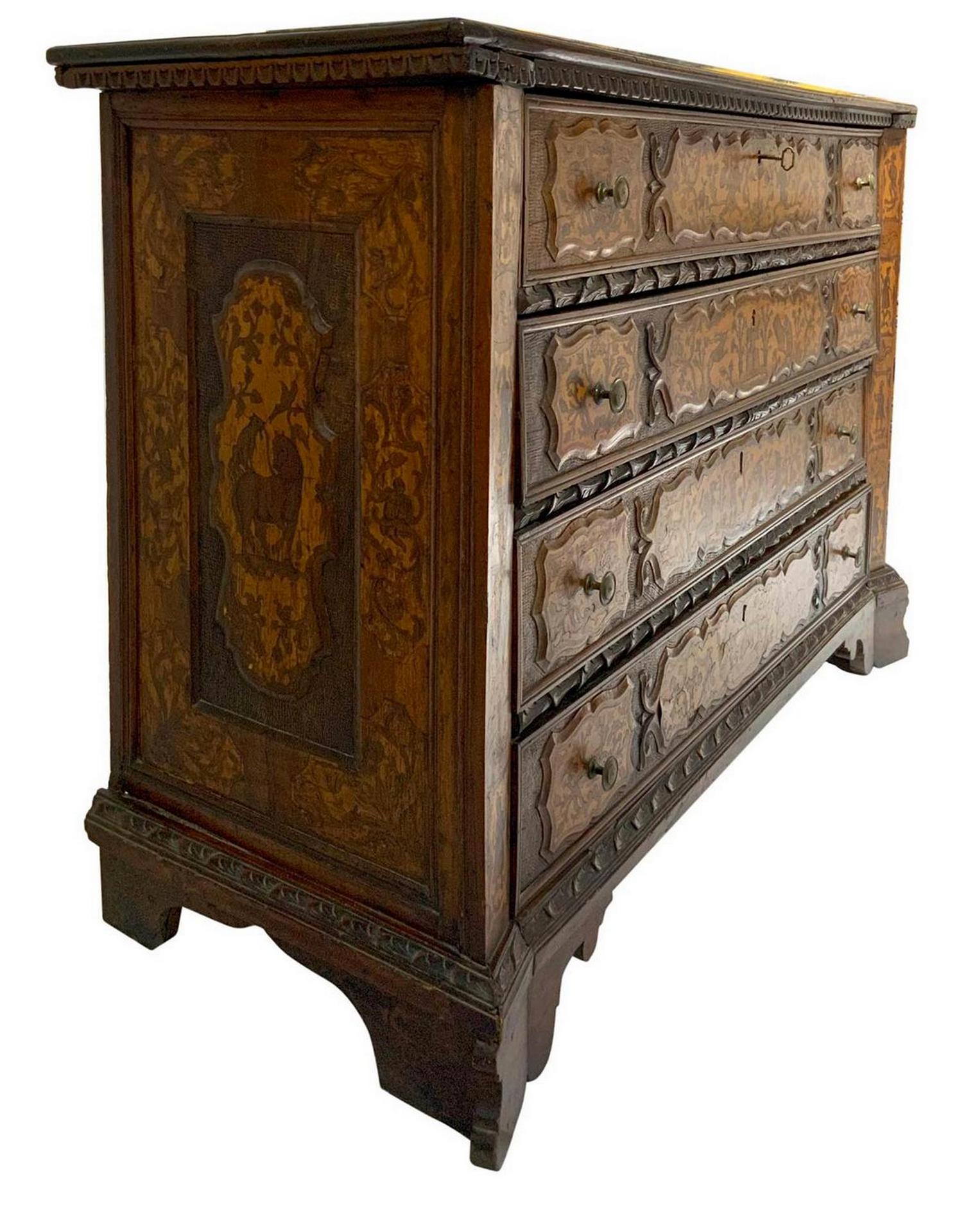 Eccezionale cassettone, provenienza Lombardia, bottega Caniana, metà XVIII secolo, attribuito a Giovan Battista Caniana. Intagliato ed intarsiato in legni chiari di acero e legni scuri di palissandro, raffigurazione di personaggi, angeli, animali e decorazioni floreali a larghe foglie. Quattro cassetti, piedi a mensola. Sul fronte formelle intarsiate raffiguranti personaggi, scene di caccia, volute vegetali e motivi zoomorfi, sotto il bordo del piano, profilo a dentelli. Base dei cassetti sottolineata con intagli a motivi di foglie d'acanto.