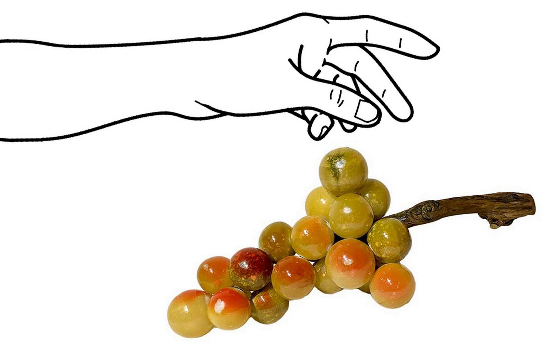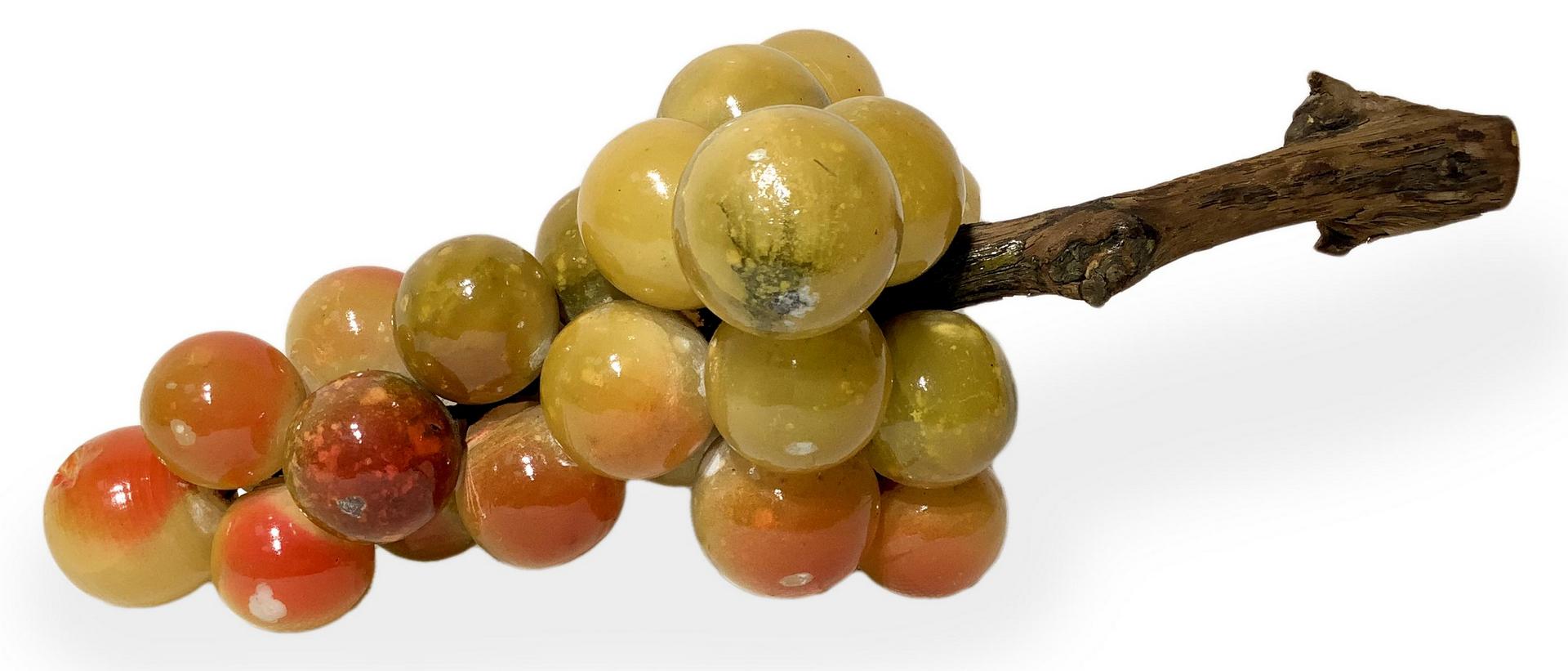 Grappolo d'uva con acini in alabastro, decorazione da tavolo, 1940-1950. Cadute di colore. Cm 36 Cadute di colore.