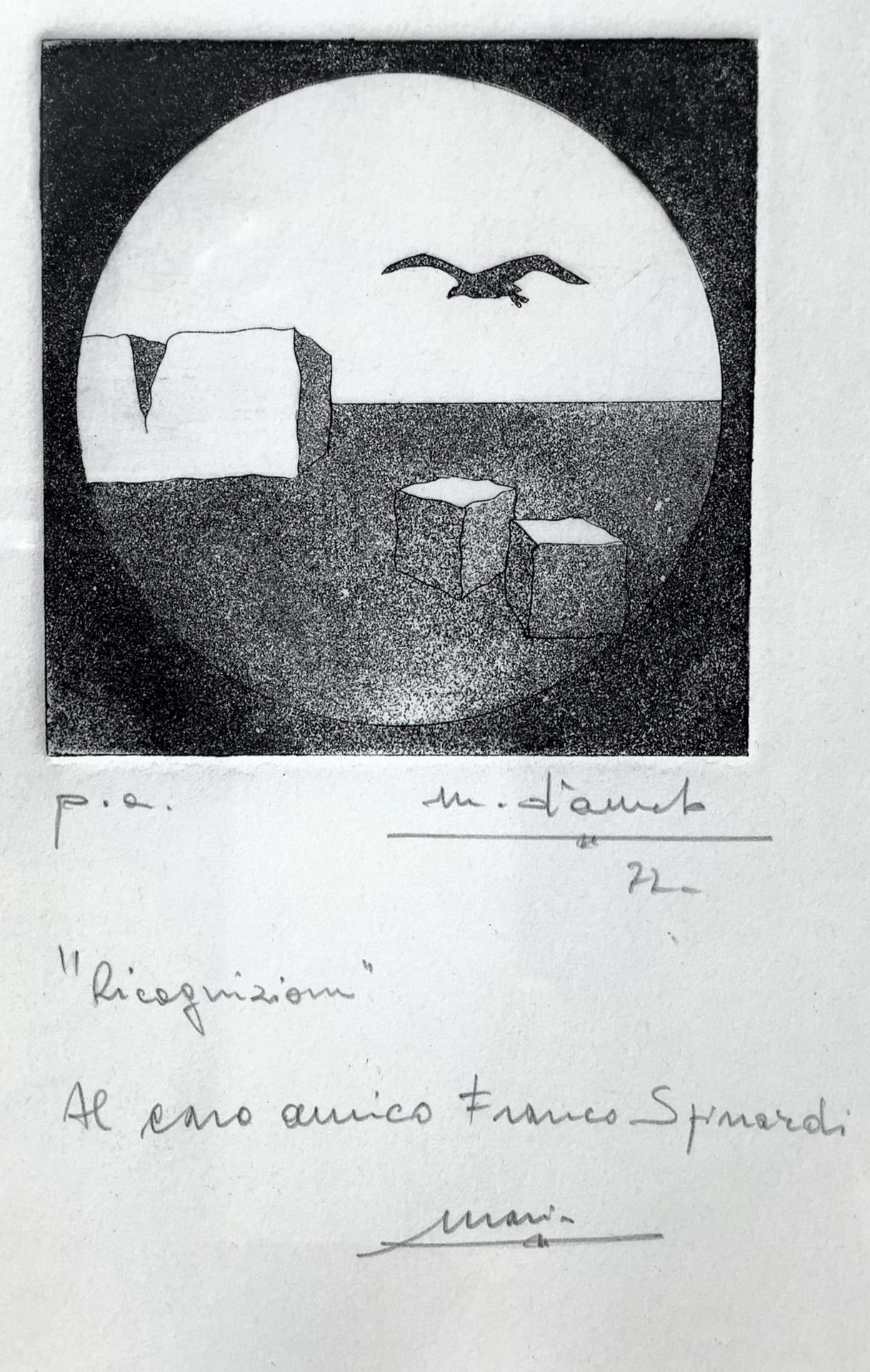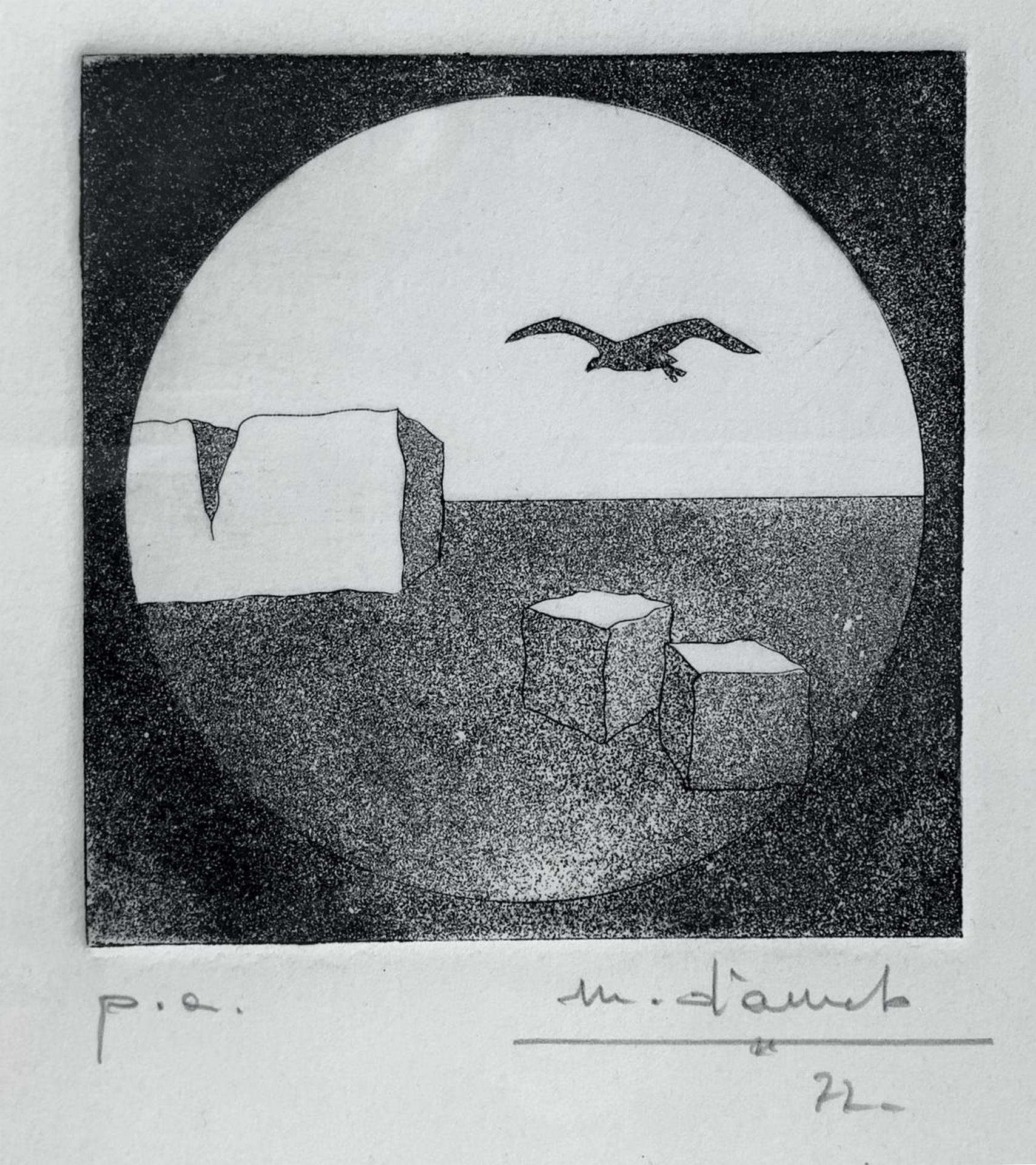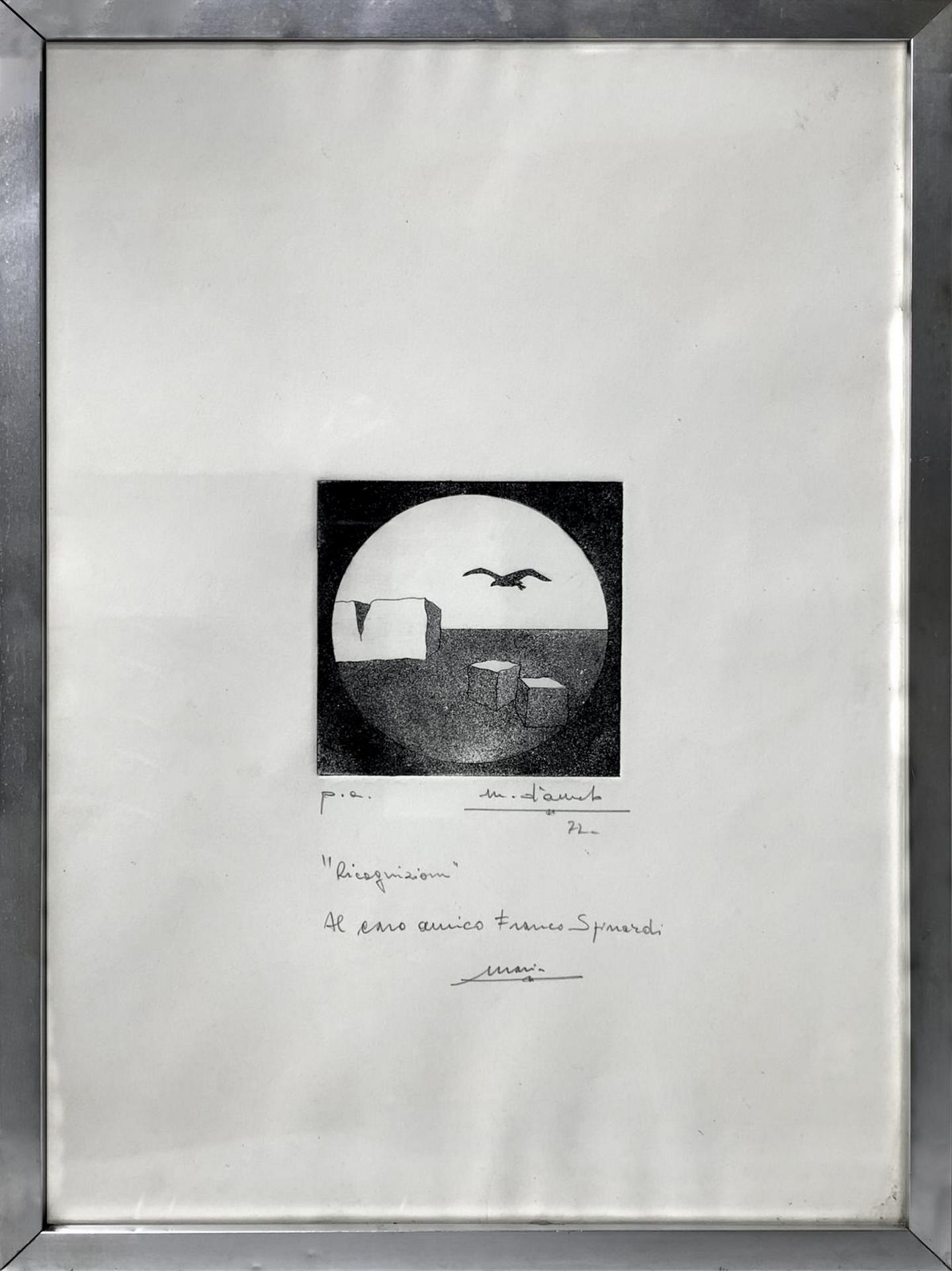 Incisione ad acquaforte raffigurata sfera inserita in un quadrato con scogli e gabbiano. Prova d’artista di Mario D’Amato (Marina di Pisciotta 1946). Firmato e datato in basso a destra M. D’Amato 72. Ricognizione al caro amico Franco Spinardi. Mm 120x120, in cornice cm 52x38