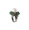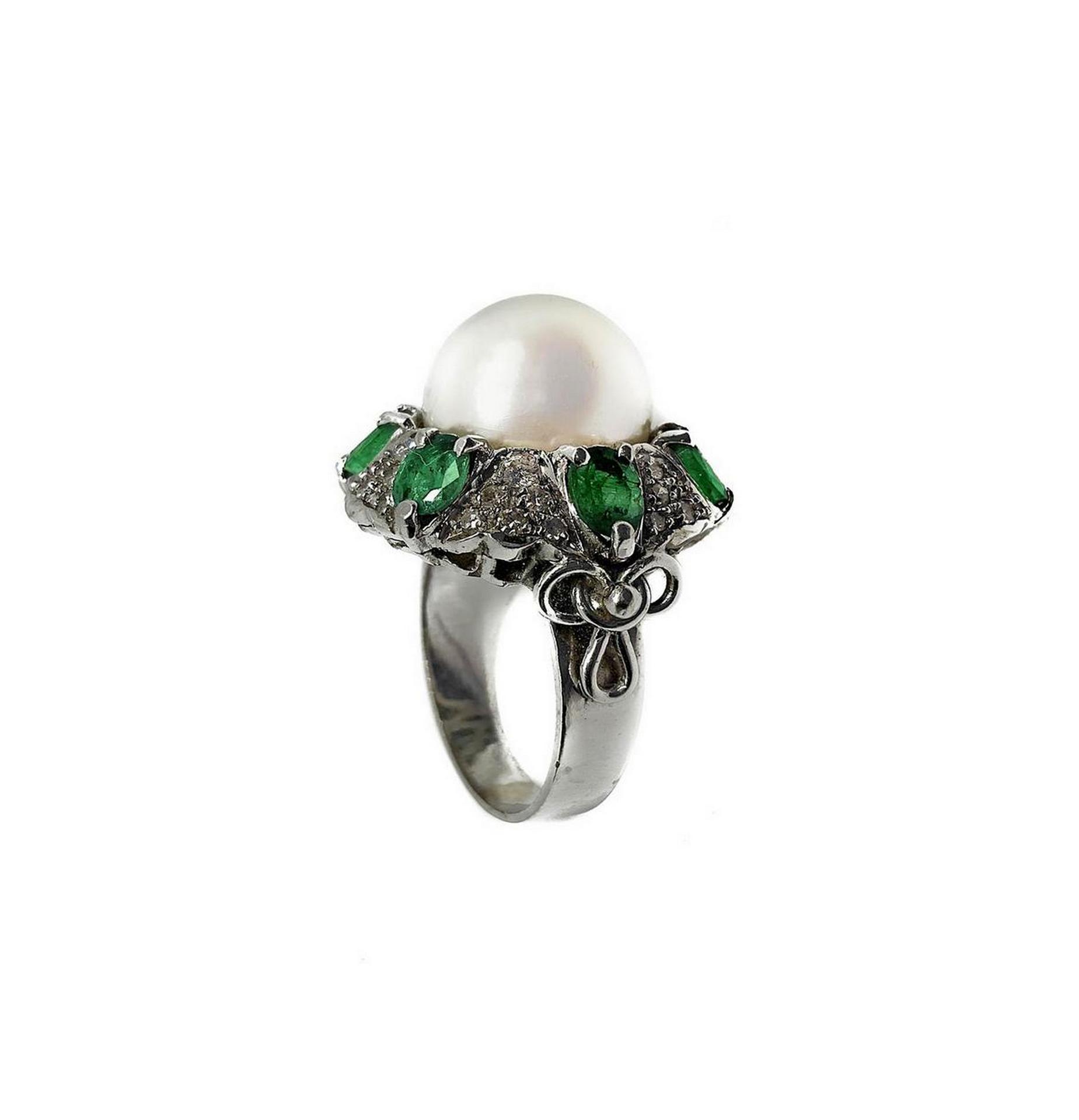 Anello in oro bianco con perla, brillanti e smeraldi. Gr 11.7