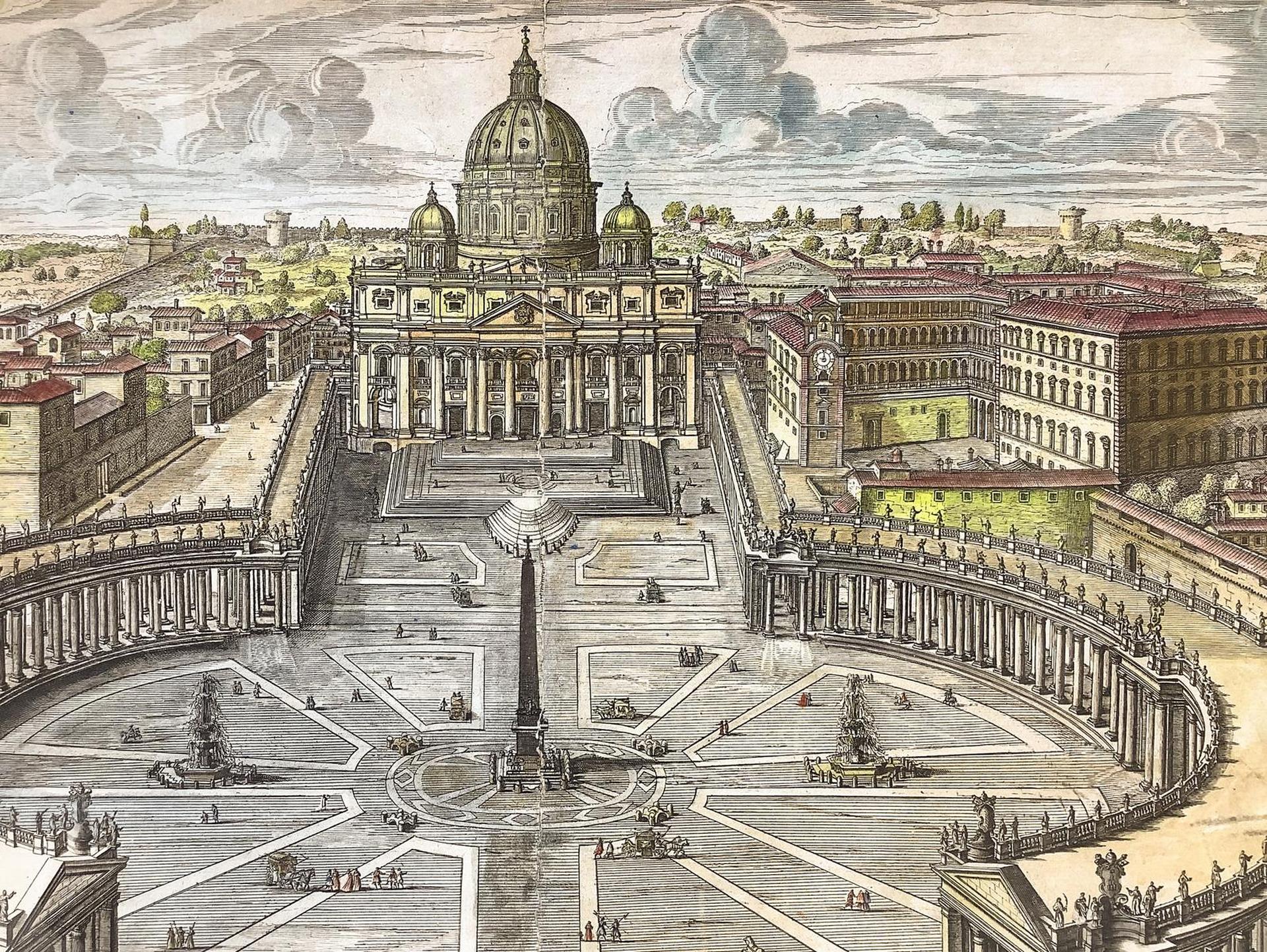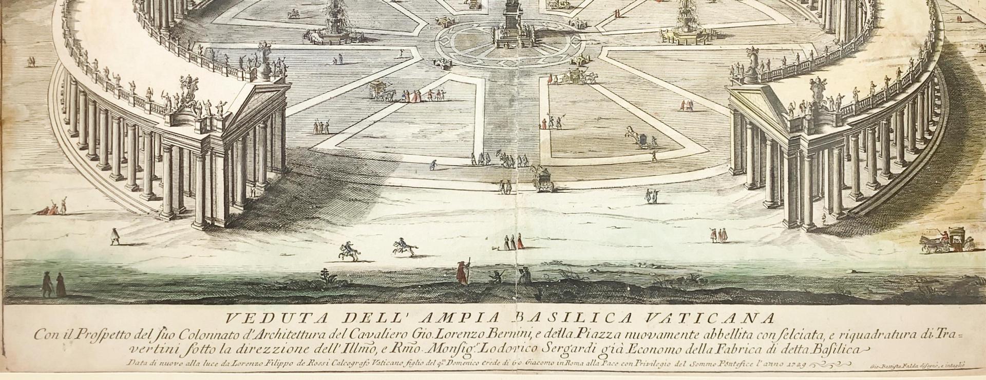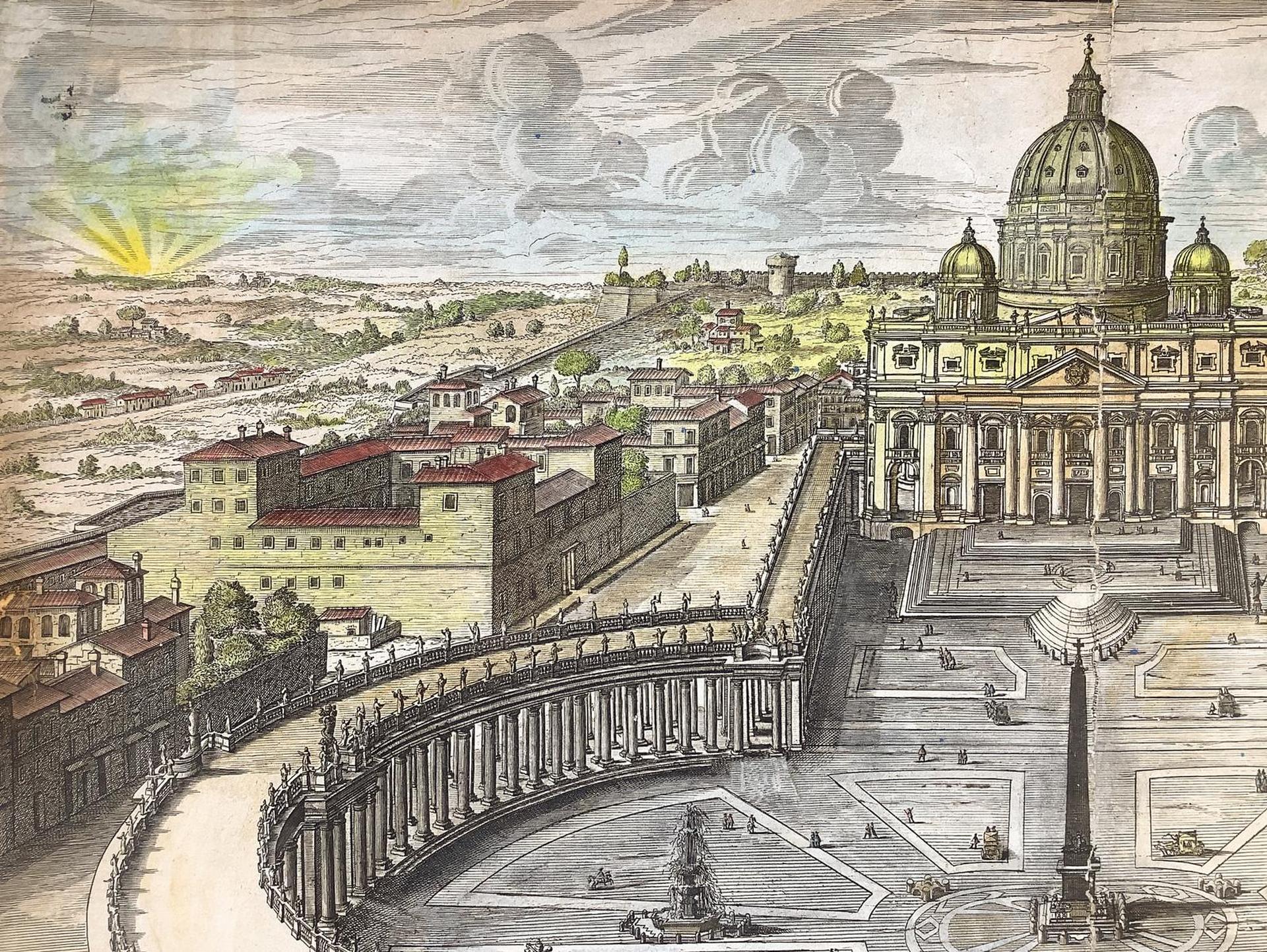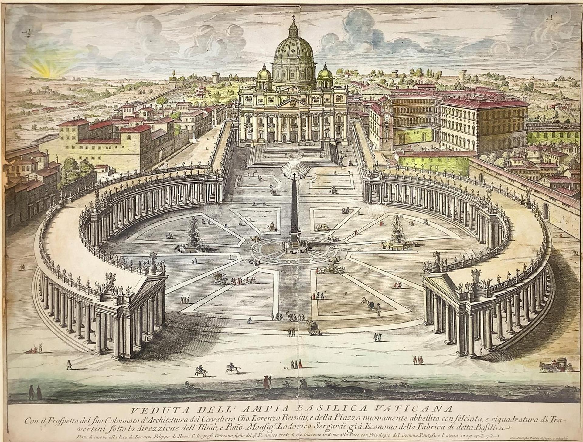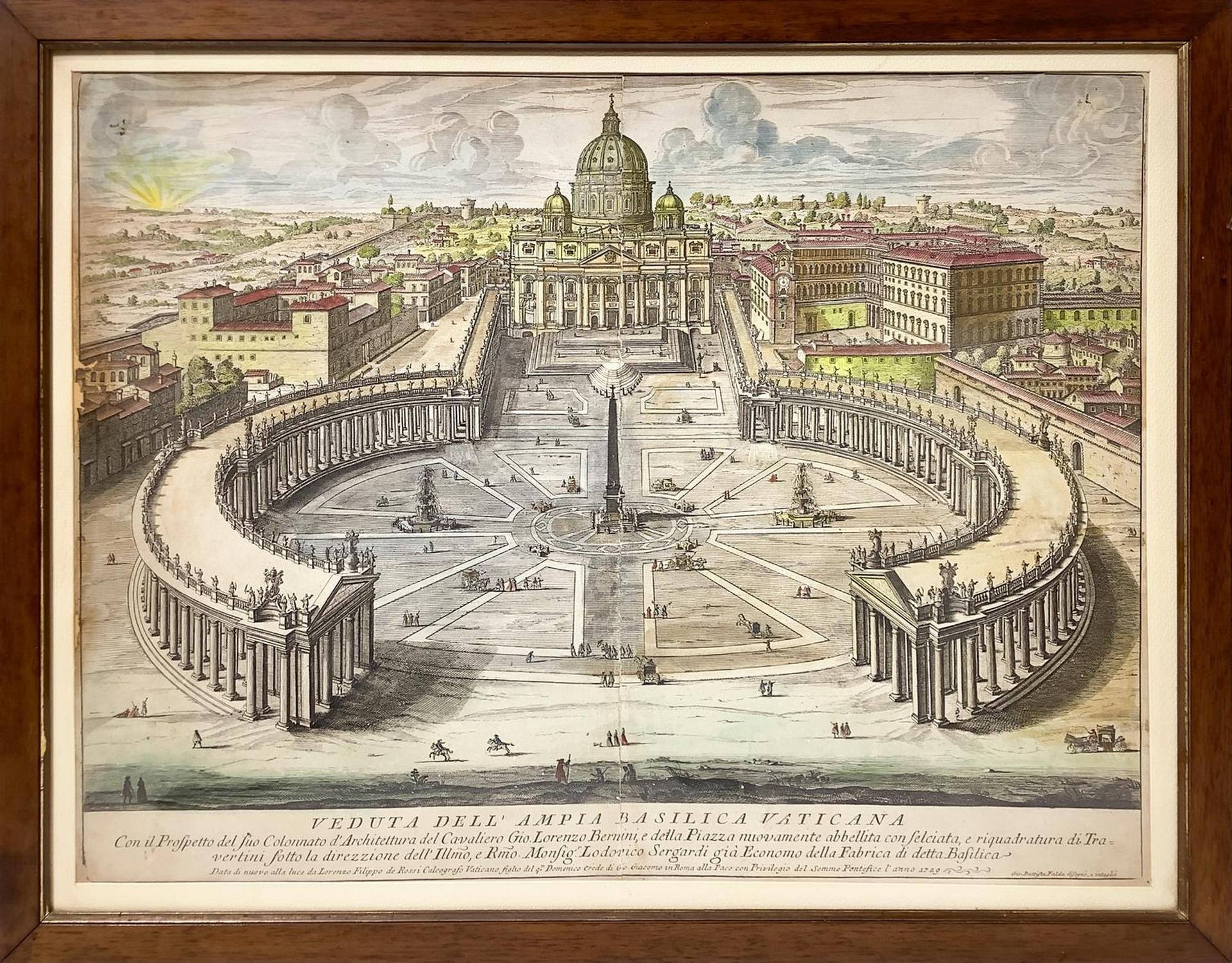 Splendida incisione ad acquaforte acquarellata raffigurante veduta dell’ampia Basilica Vaticana, firmata in basso a destra Giovanni Battista Falda (Valdugia 1643-Roma 1678) datata 1729 in quanto riedita dall’incisore Lorenzo Filippo De Rossi, figlio di Giovanni Giacomo De Rossi, famiglia di famosi incisori. Falda disegno e intaglio. Leggera piegatura sulla parte centrale. Mm 480x633 in cornice cm 56x72