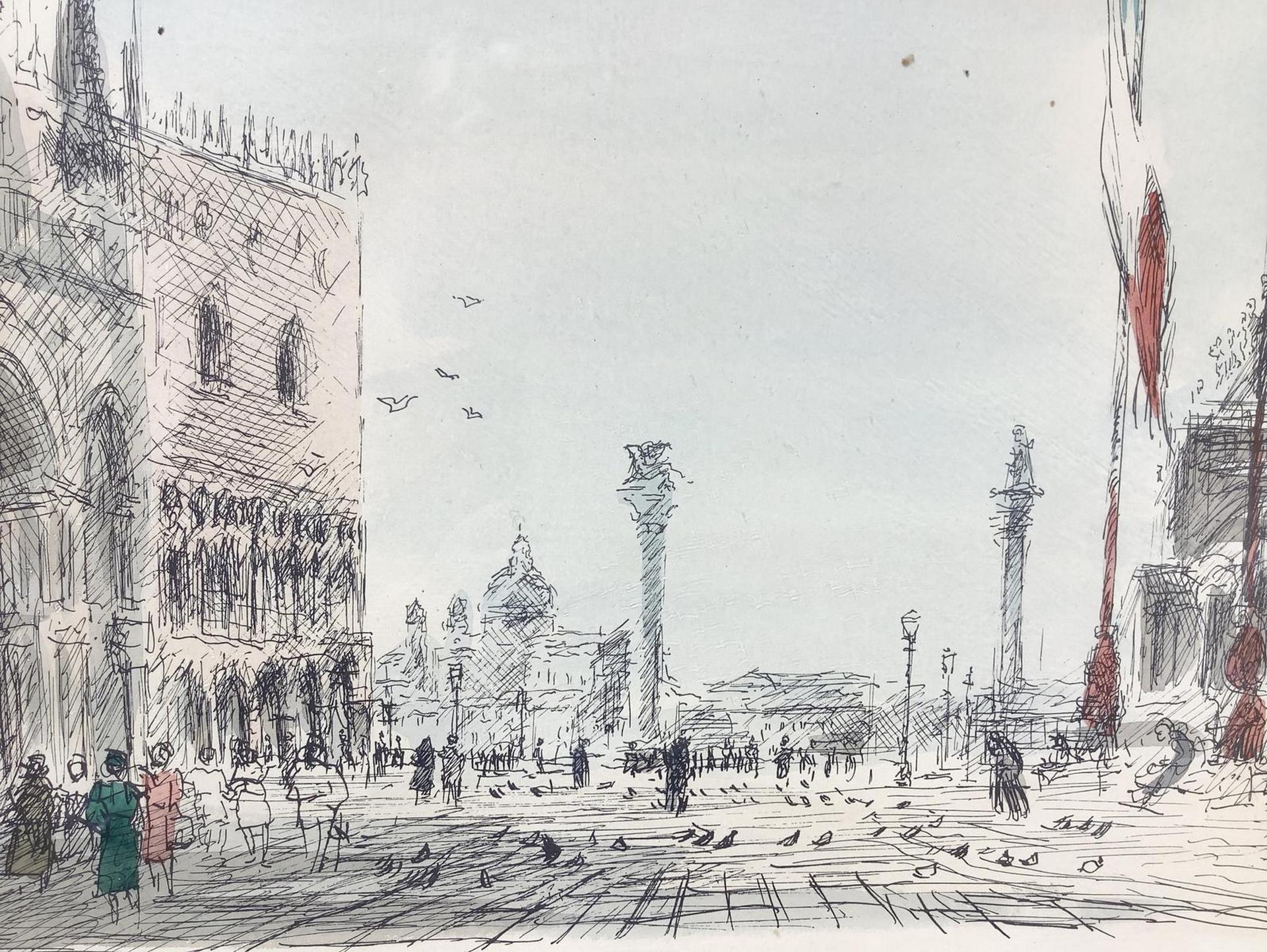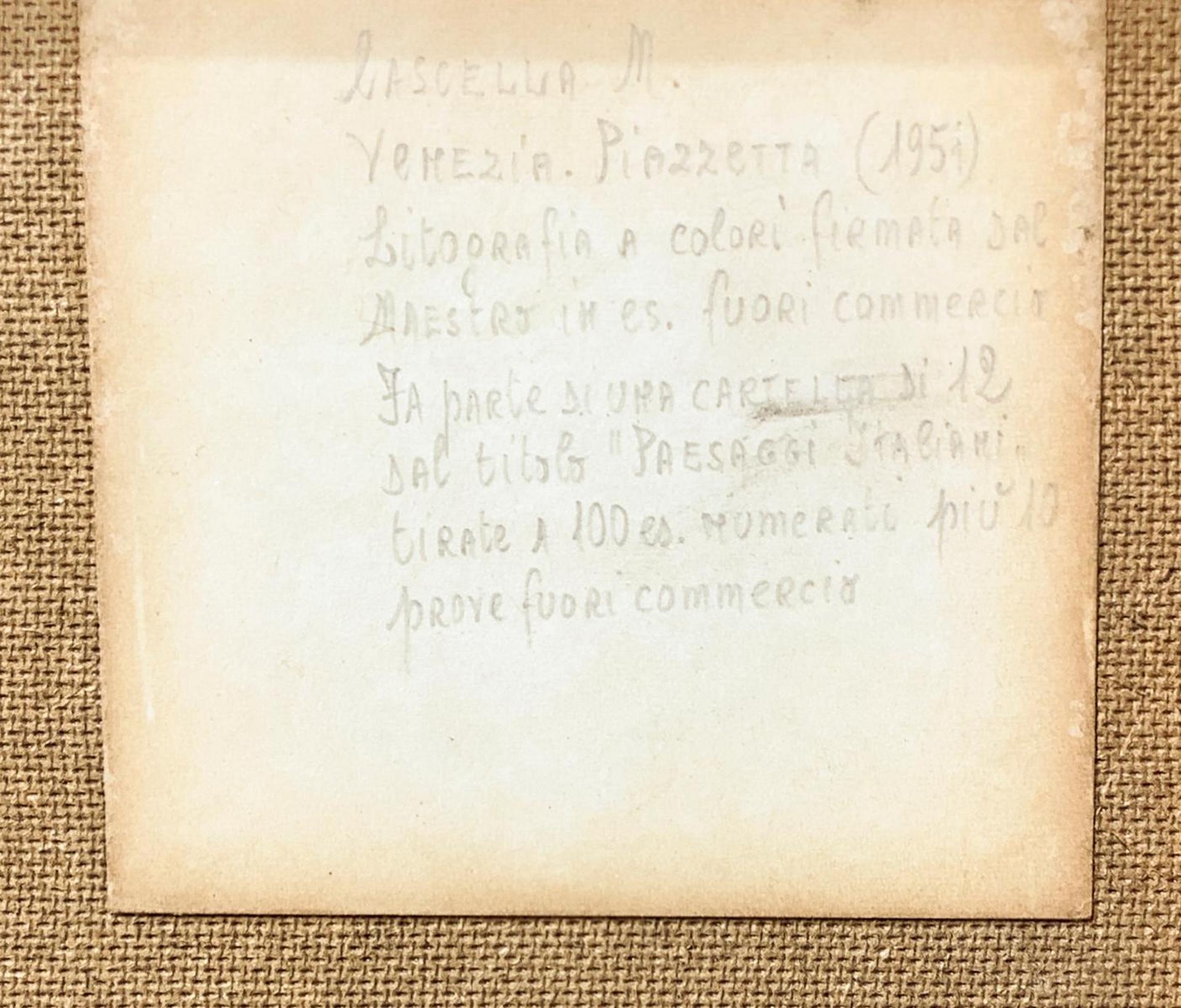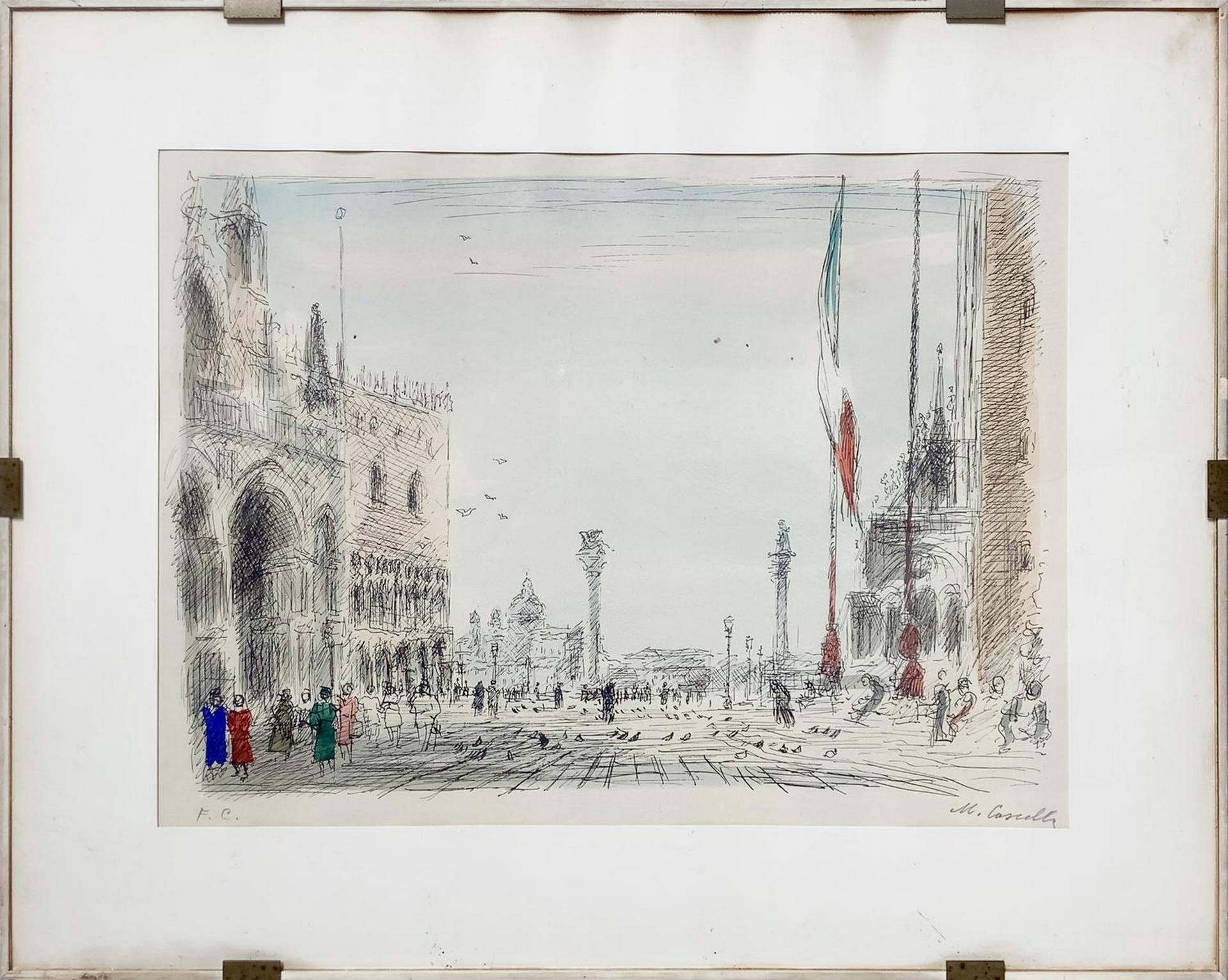 Litografia (fuori commercio) a colori raffigurante Piazza San Marco di Venezia dalla piazzetta dei Leoni 1951, firmato in basso a destra M.Cascella (Ortona 1892-Milano 1989). Fa parte di una cartella di 12 dal titolo “Paesaggi Italianiâ€_x009d_ a tirature di 100 esemplari numerati più 10 prove fuori commercio. Mm 271x371, in cornice cm 40x50
