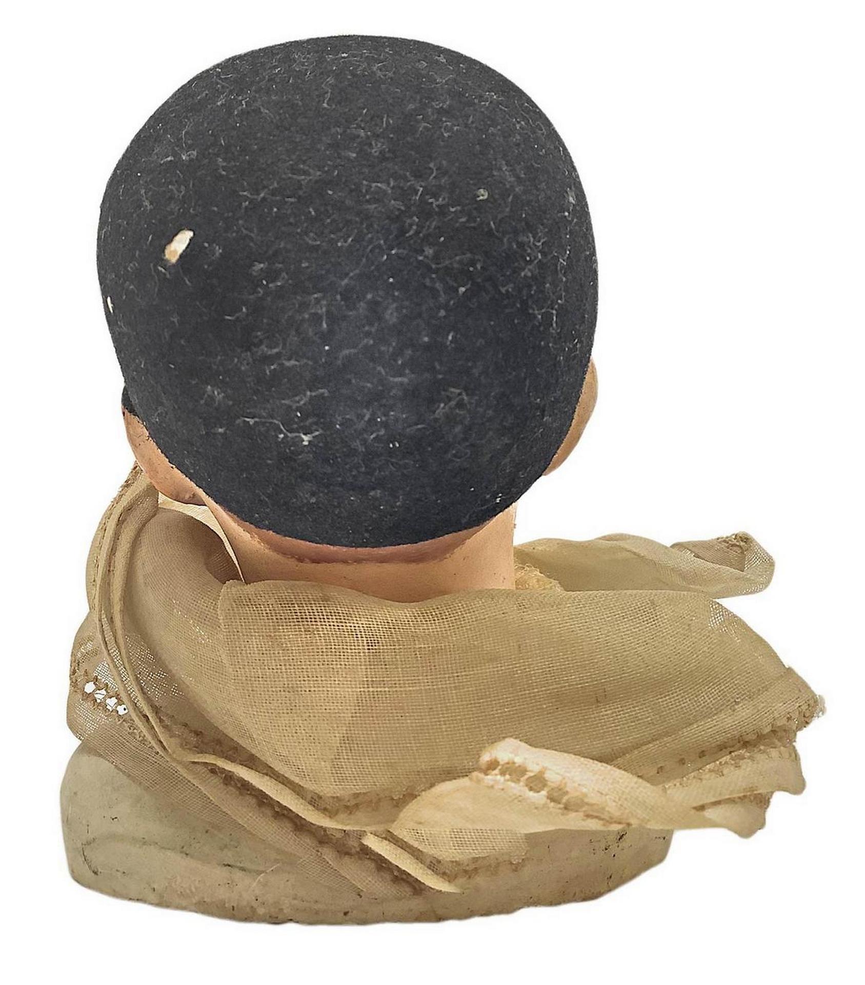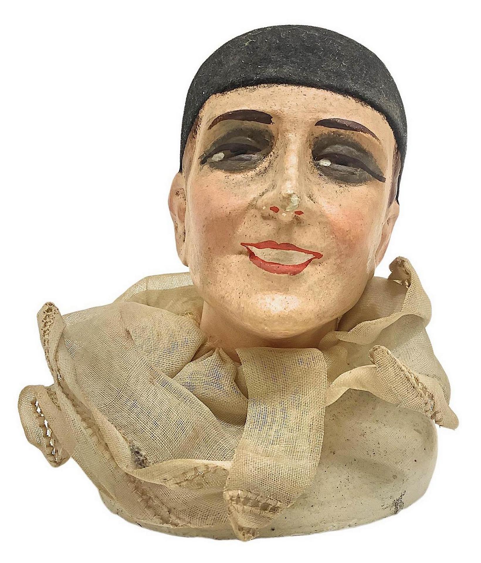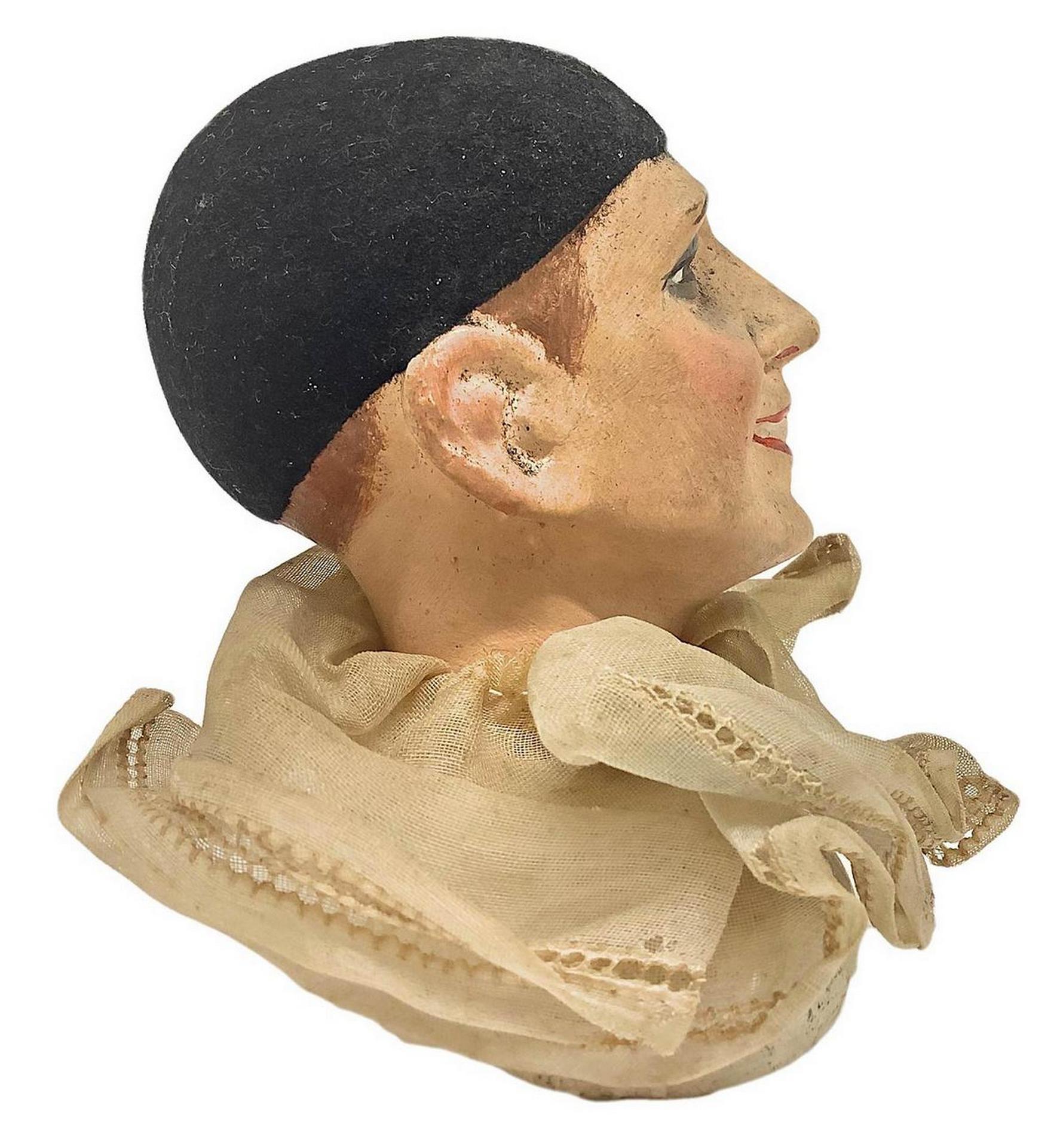 Mezzobusto in gesso policromo raffigurante Pierrot, inizi XX secolo. Con bavero in tulle. H cm 10