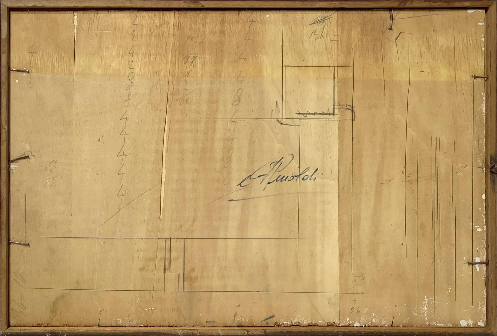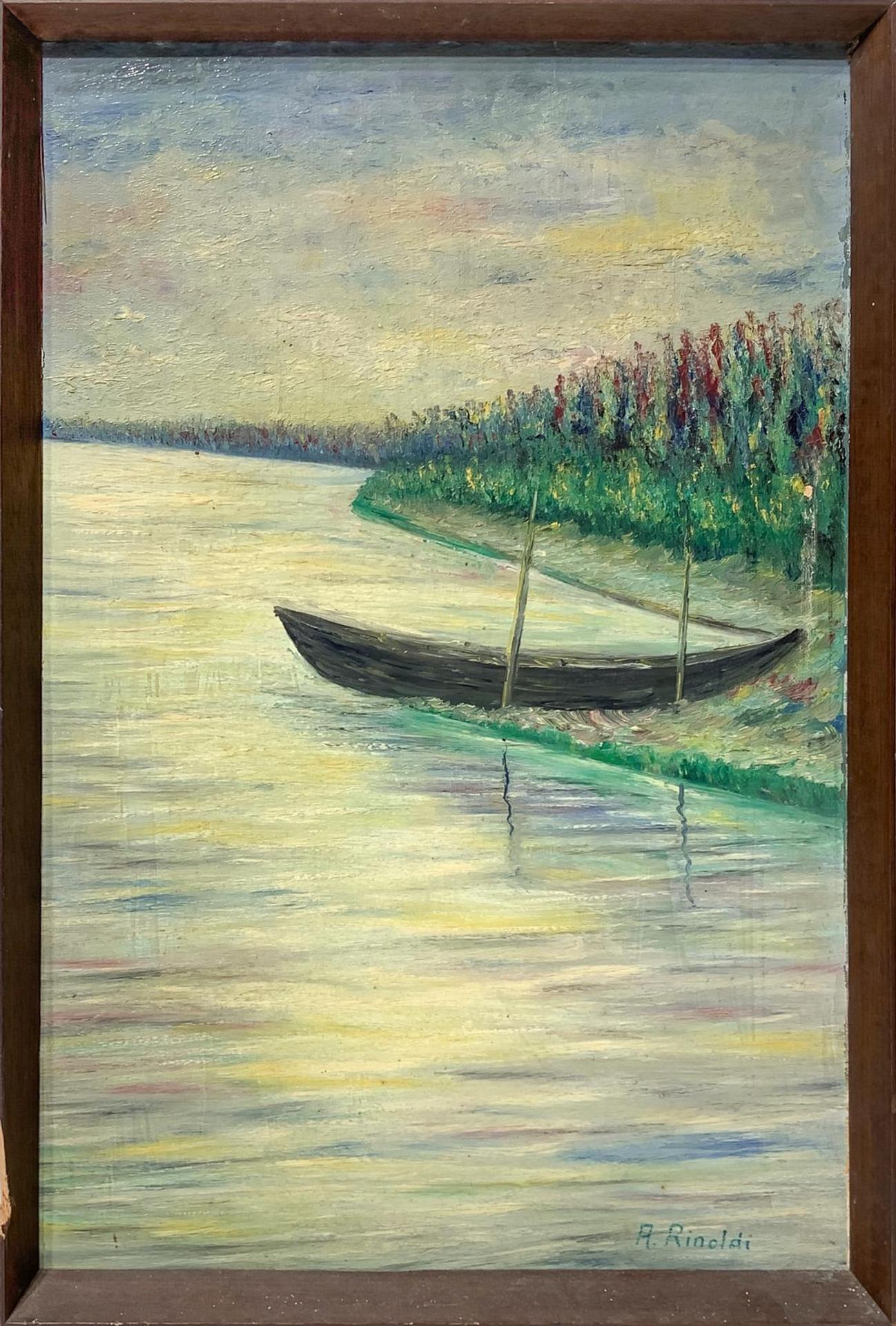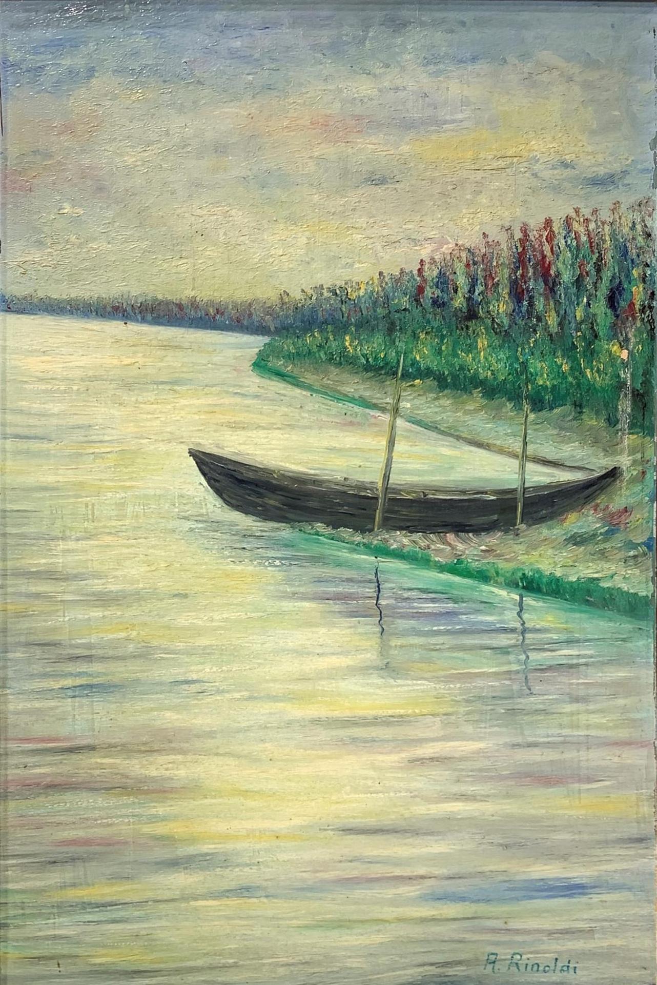 Dipinto ad olio su tela raffigurante paesaggio con barca, firmato in basso a destra A. Rinoldi. Cm 33x51, in cornice cm 34,5x52,5