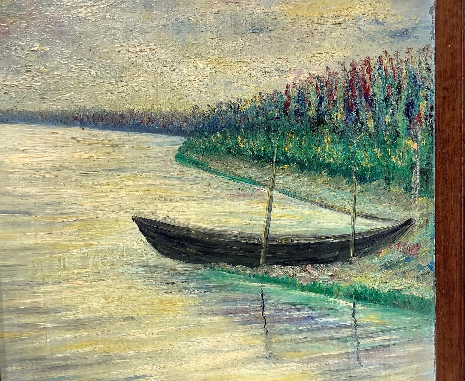 Dipinto ad olio su tela raffigurante paesaggio con barca, firmato in basso a...