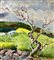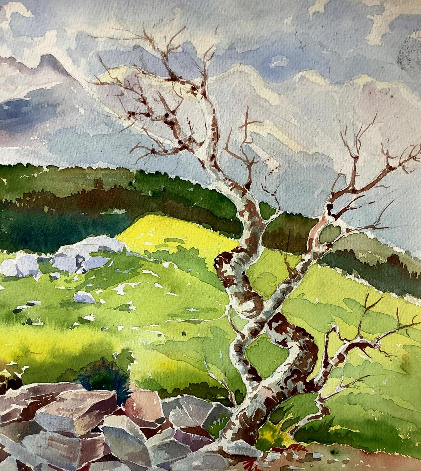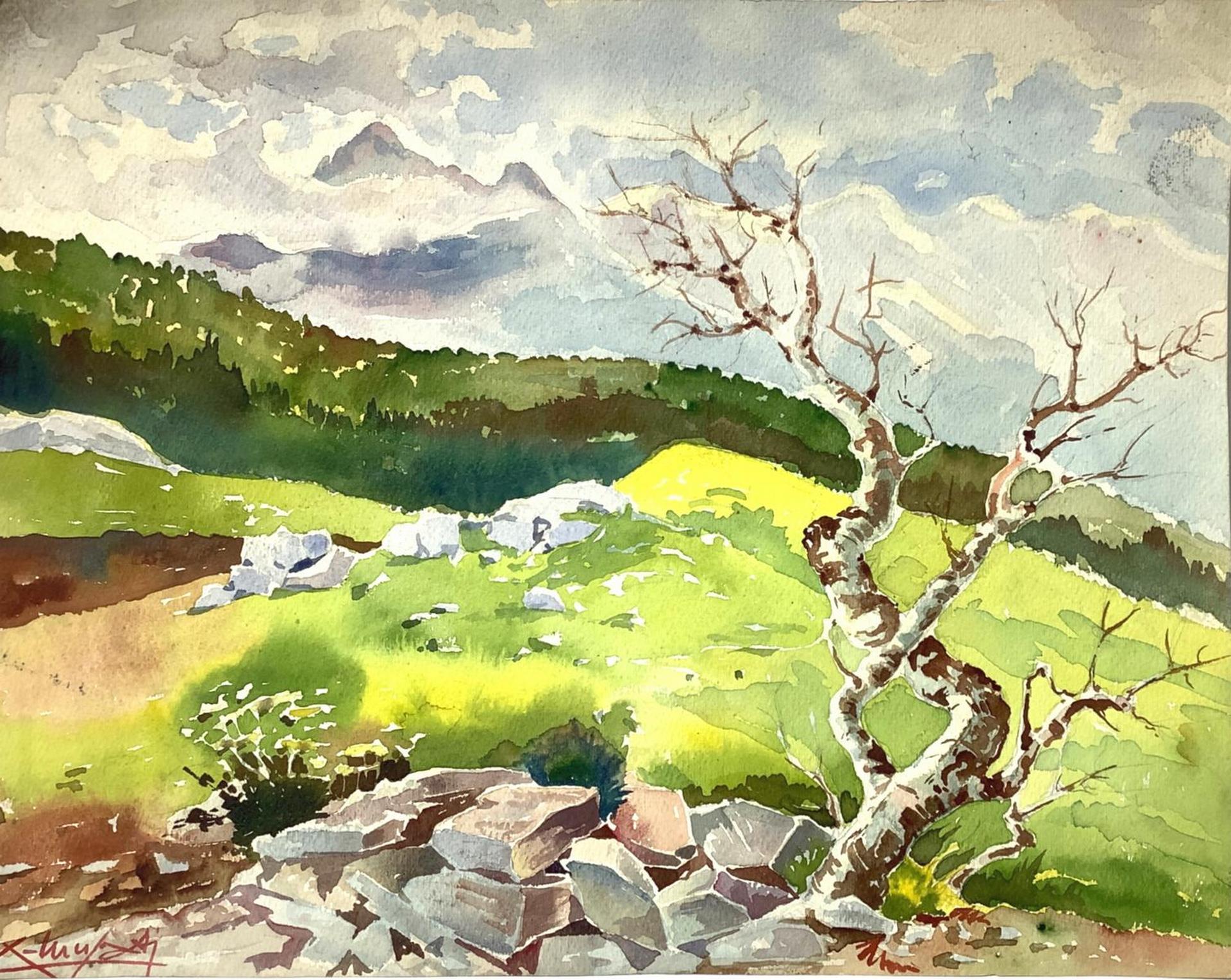 Dipinto ad acquerello su carta, raffigurante paesaggio di montagna con alberi...