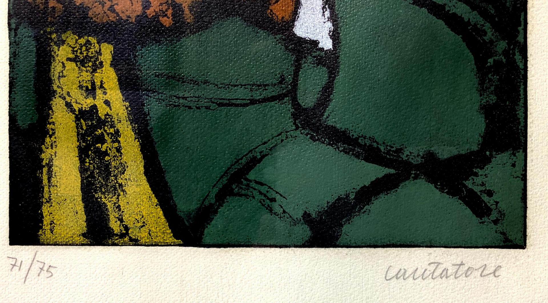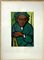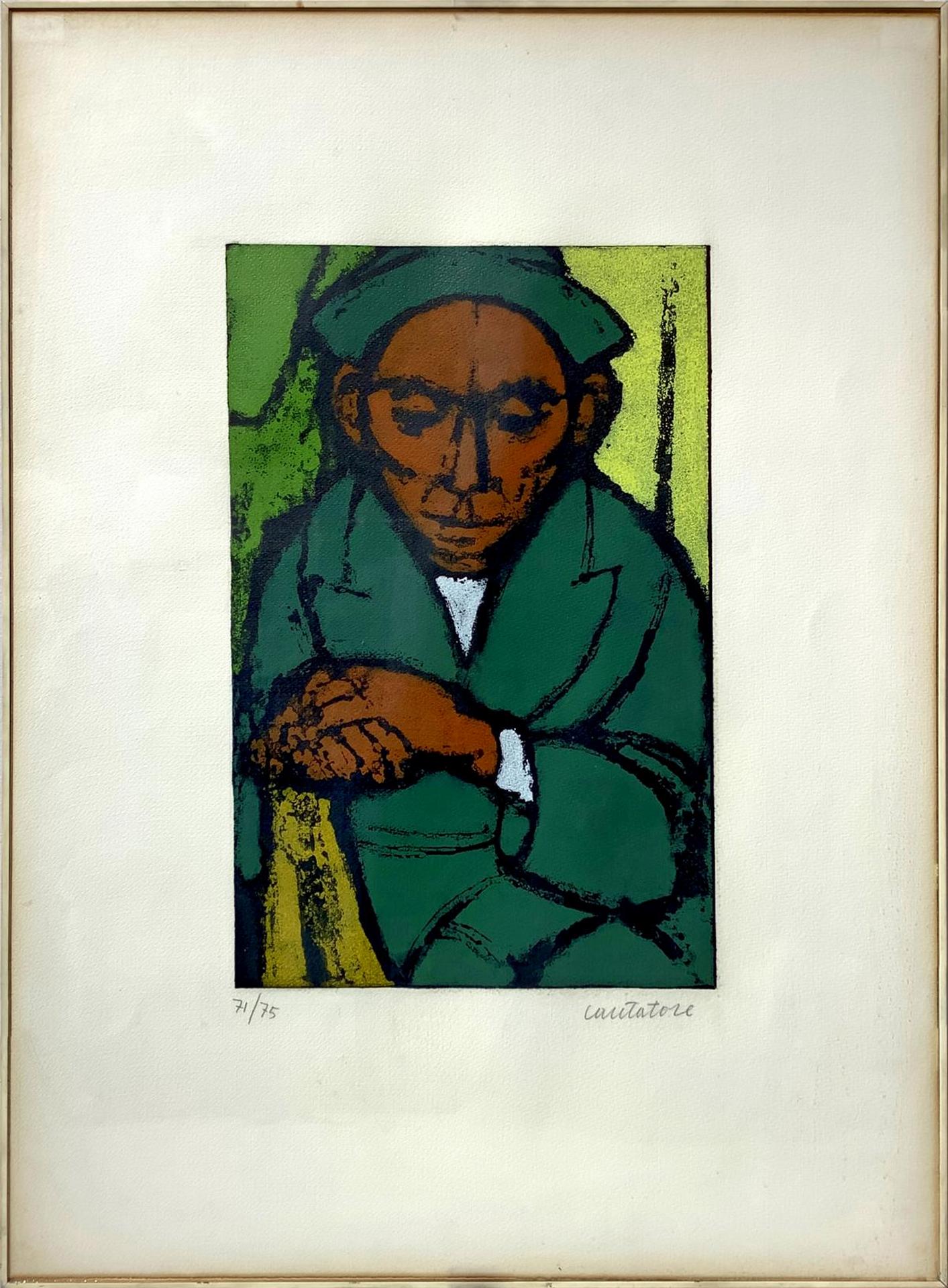 Domenico Cantatore (Ruvo di Puglia 1906 – Parigi 1998). Acquaforte e acquatinta a colori raffigurante Uomo seduto, 71/75, firmato in basso a destra Domenico Cantatore. Mm 400x250, in cornice cm 69x49