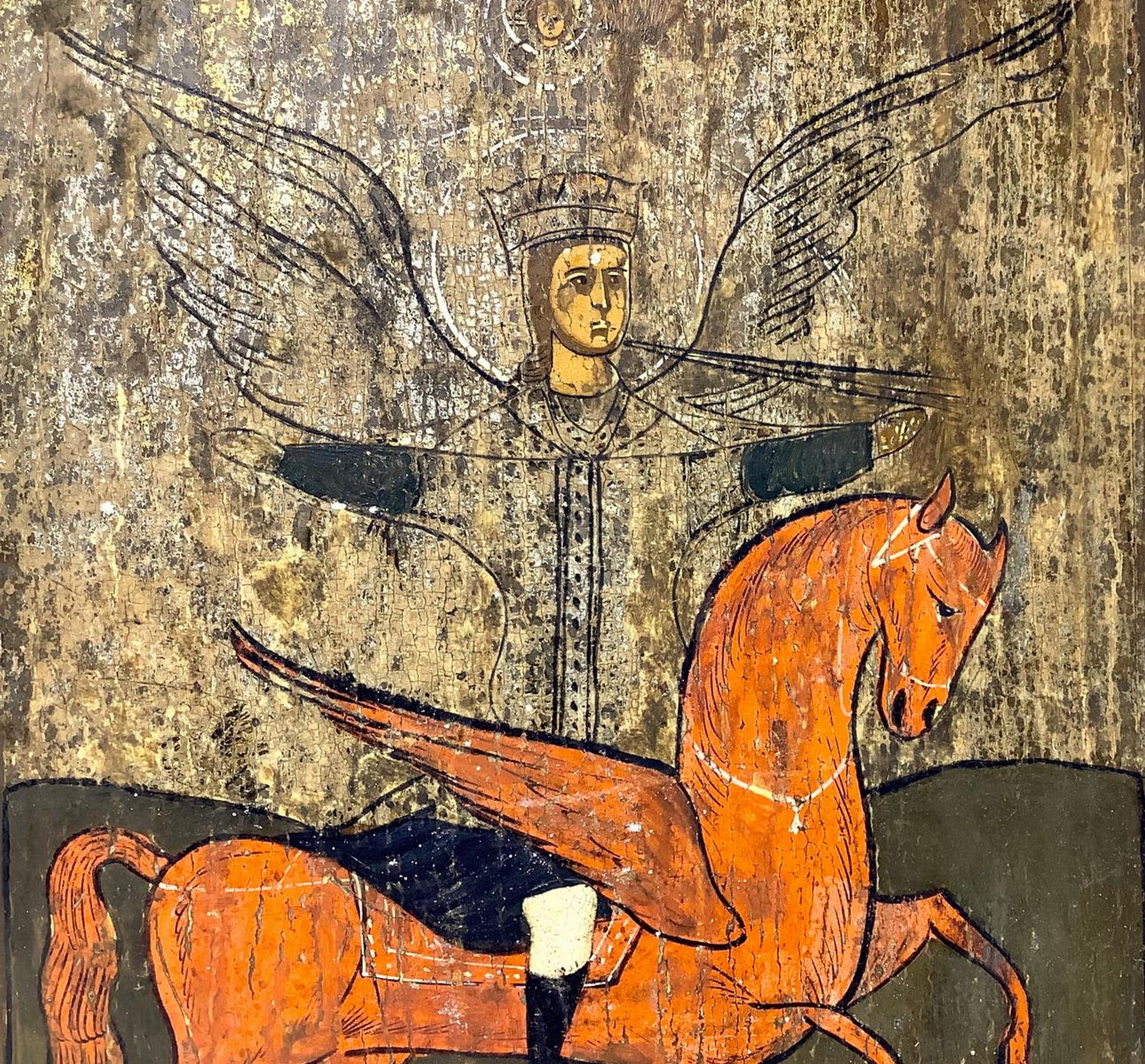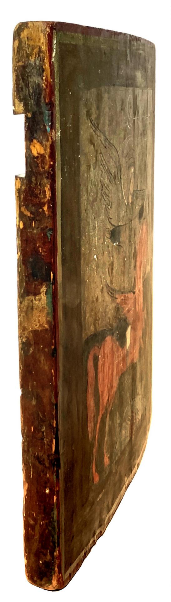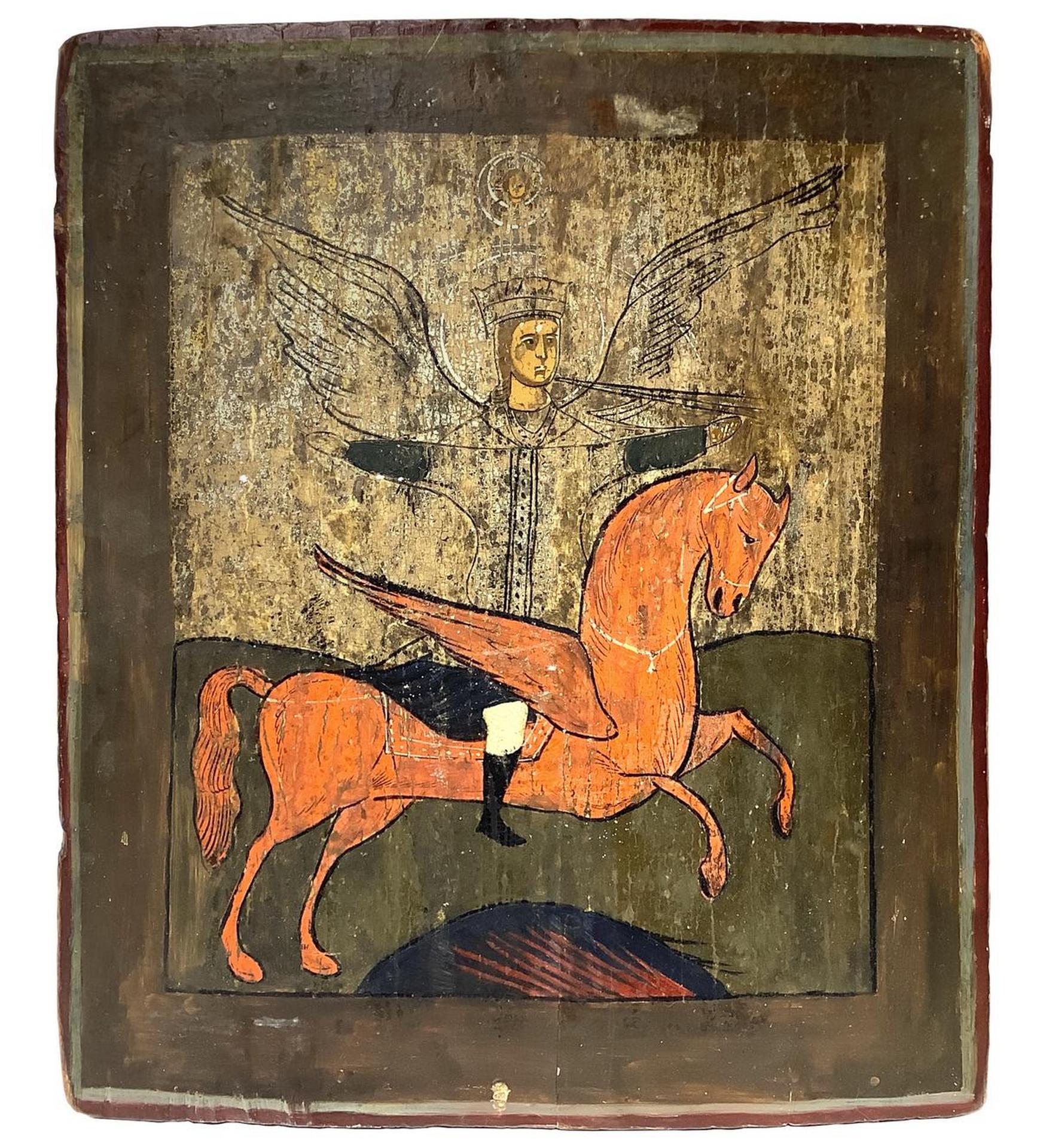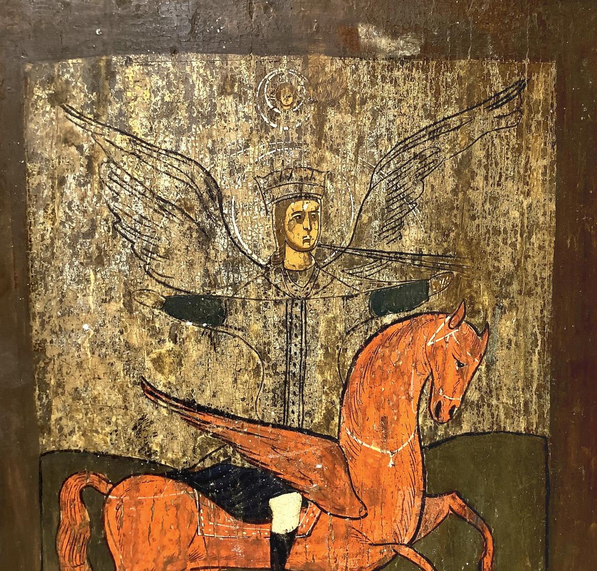Icona russa, tempera su tavola raffigurante L'arcangelo Michele Cavaliere dell’Apocalisse, XIX secolo. Cm 35,5x29