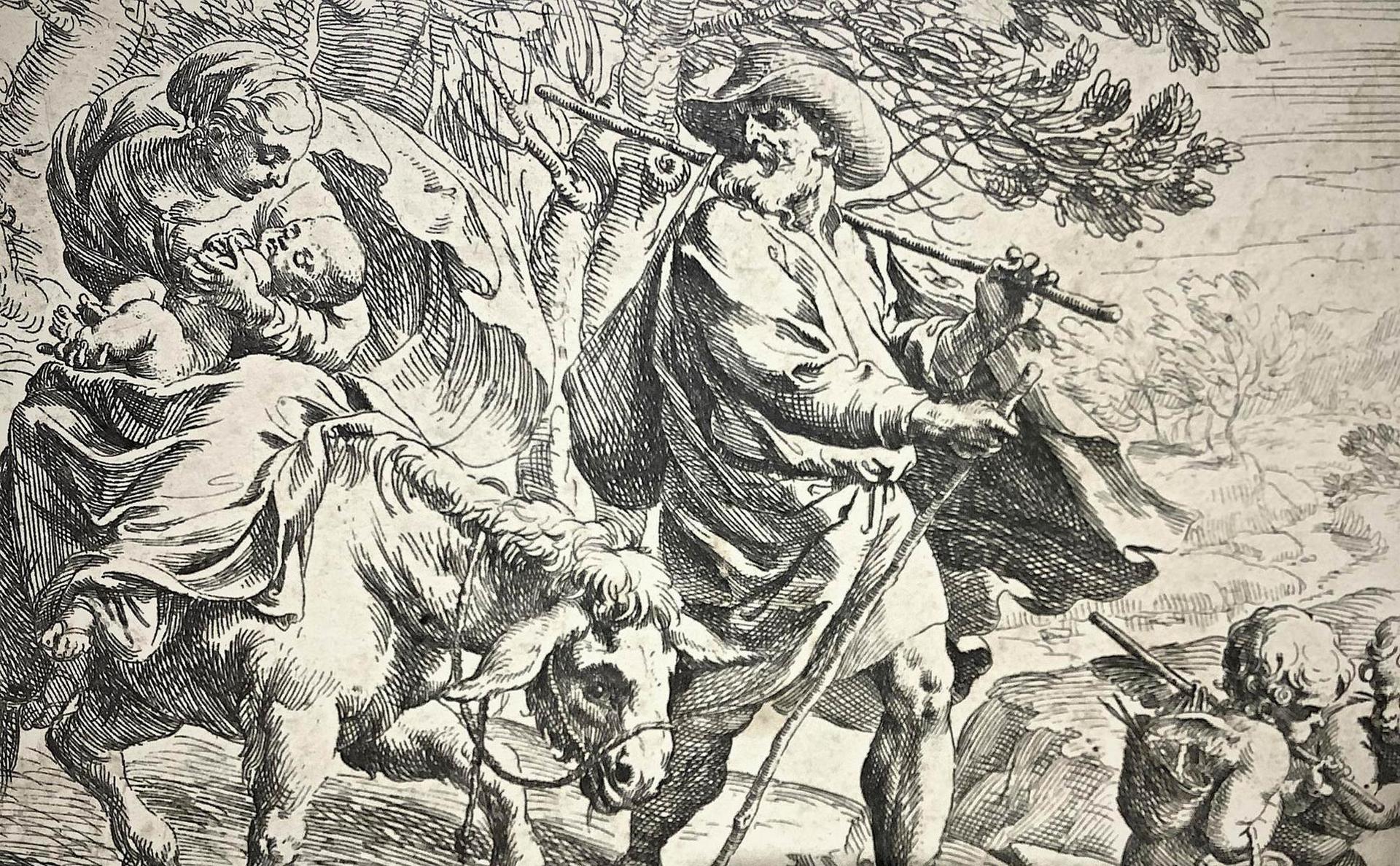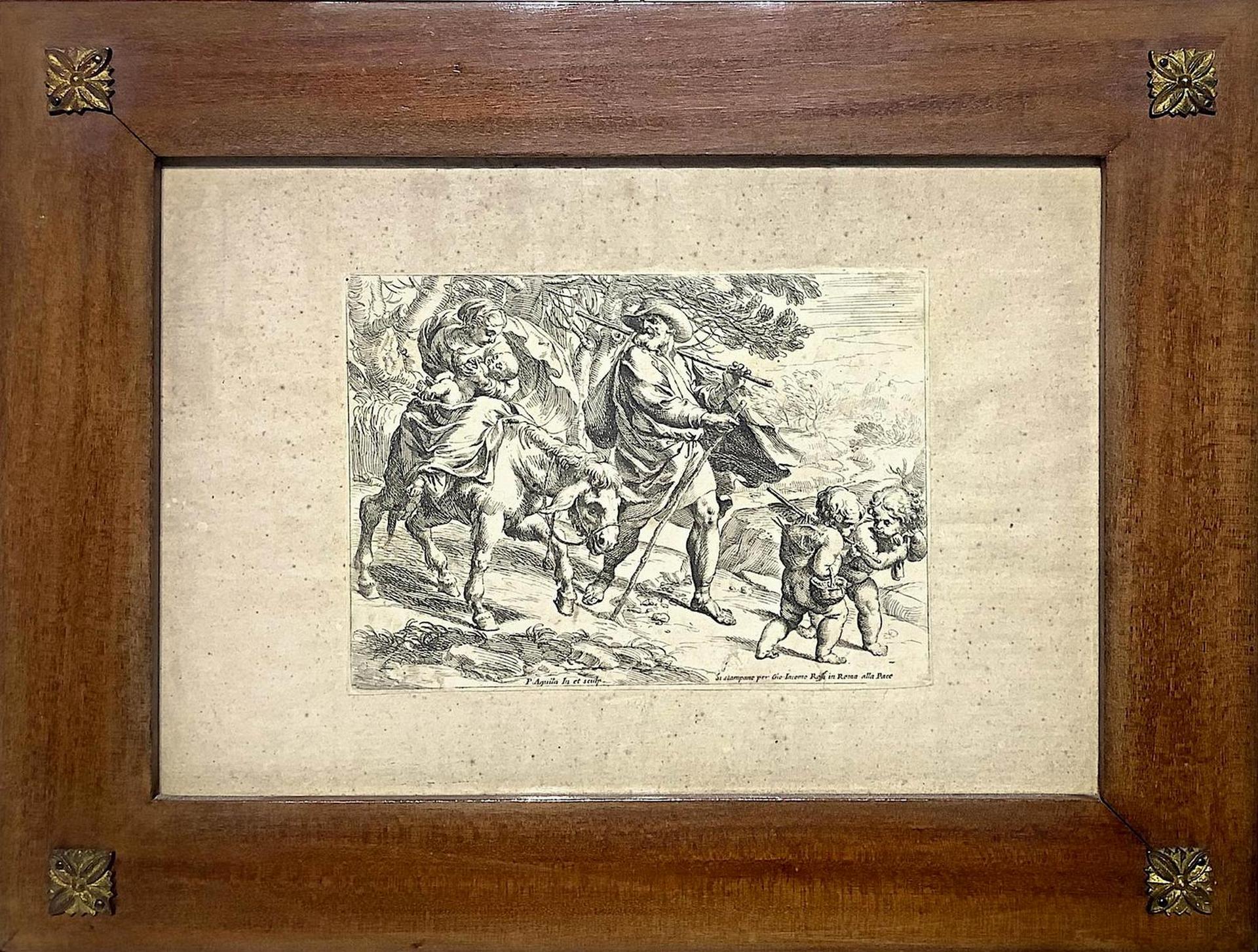 Incisione raffigurante Fuga in Egitto di Pietro Aquila (Marsala 1650- Roma 1692). Incisione all'aquaforte. Mm 140 X181, in cornice noce con inserti in ottone agli angoli CM 30x39,5.