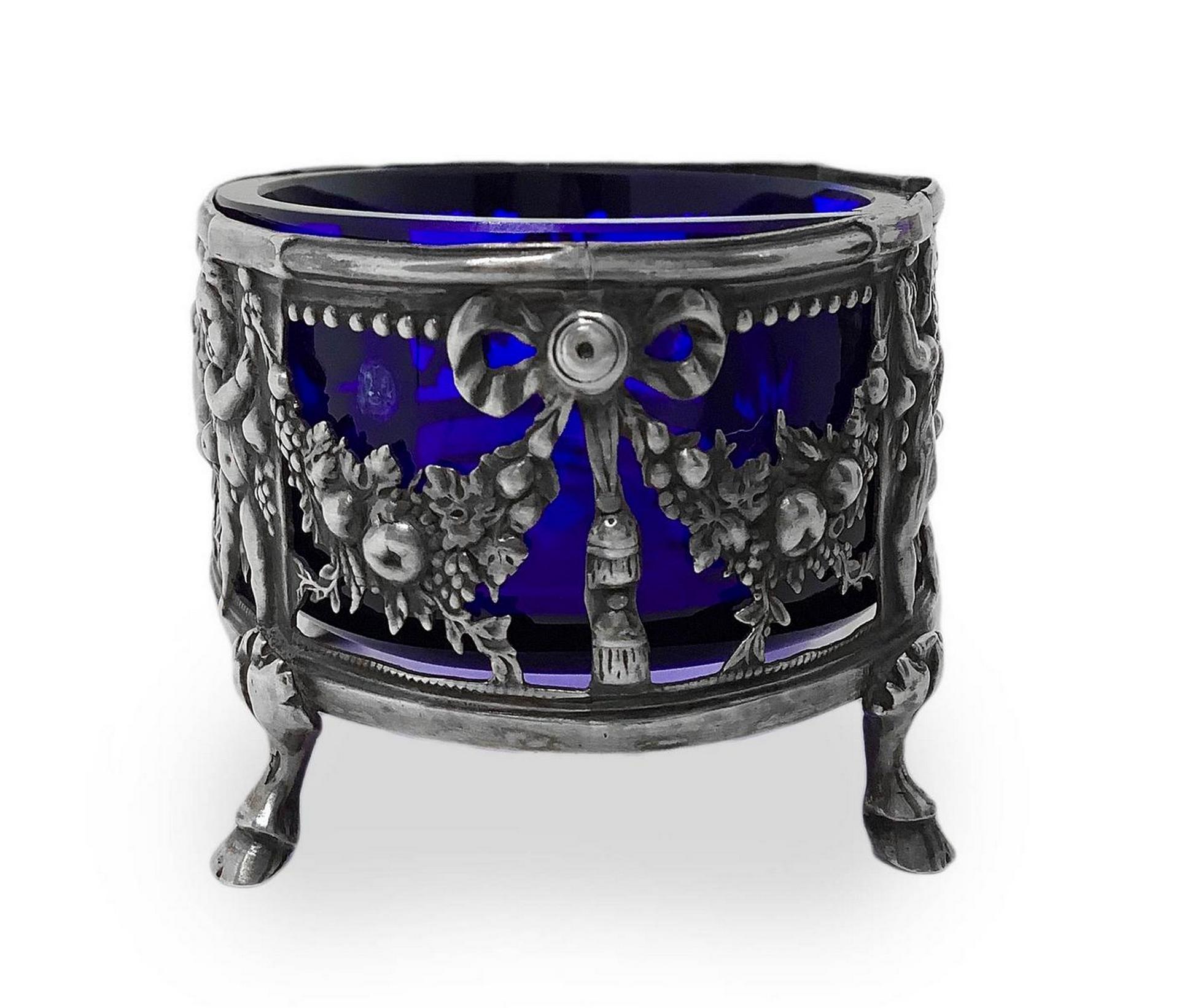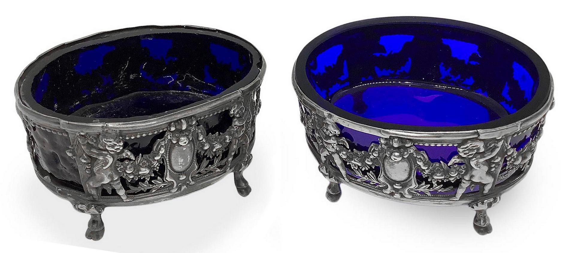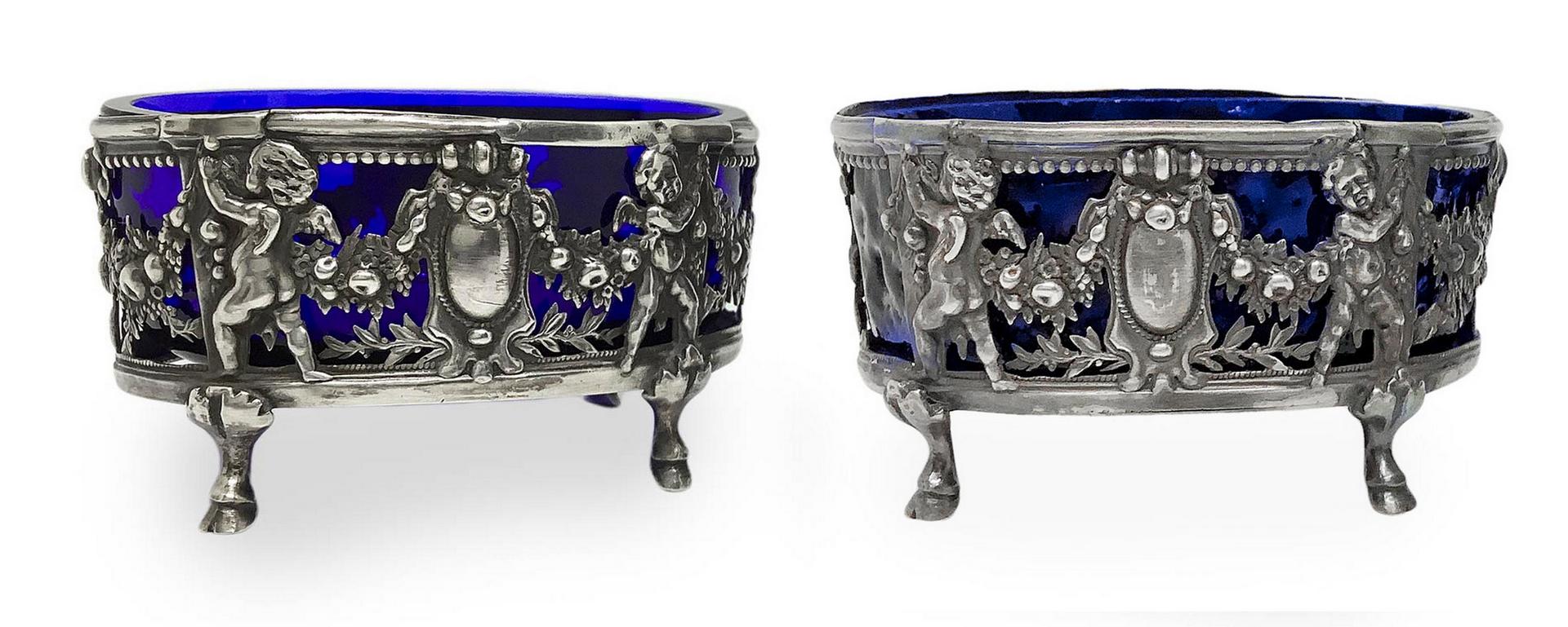 n. 2 saliere in argento con vetri blu e puttini. H cm 4,5x8