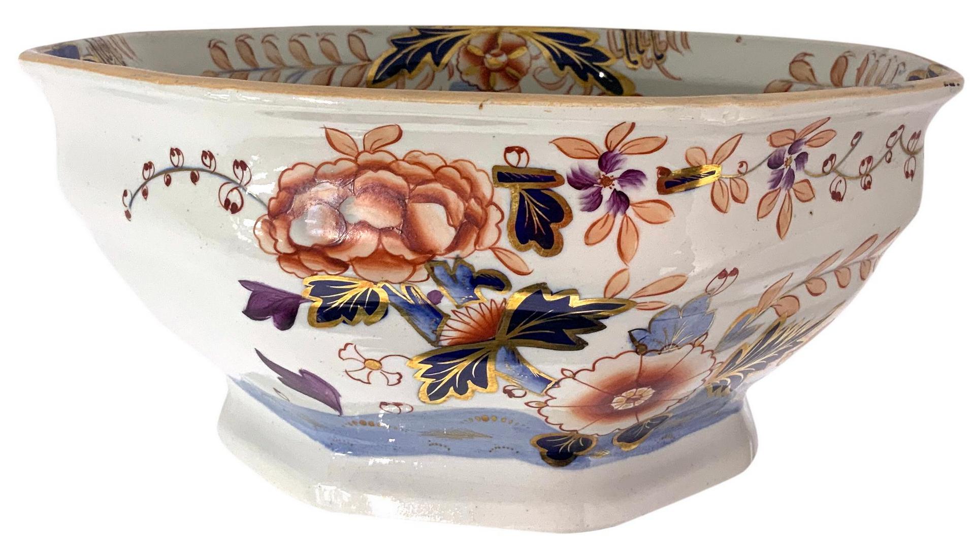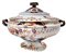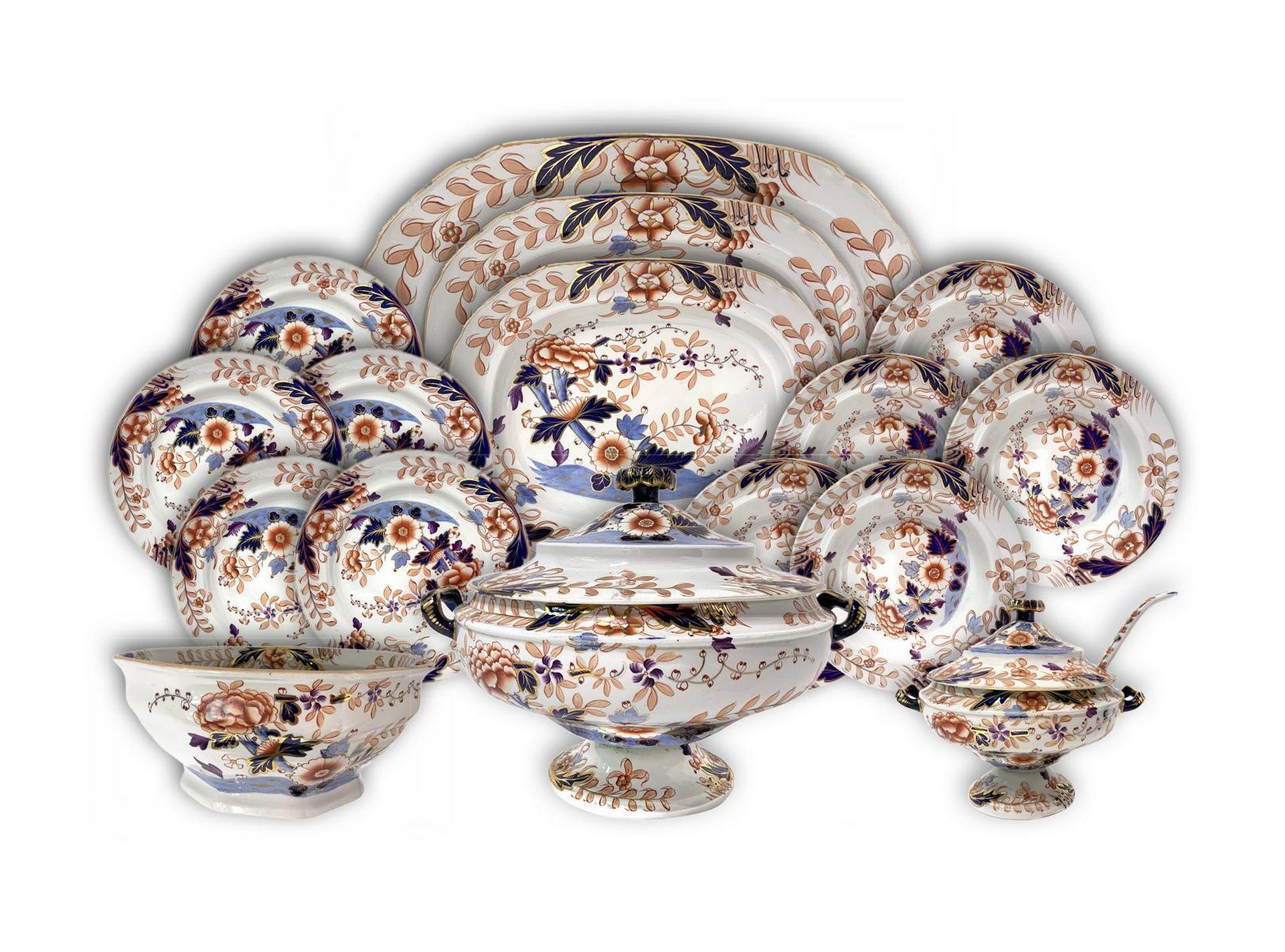 Servizio Davenport Longport Imari China, Servizio di piatti in porcellana, XIX secolo. Composto da 18 piatti piani, 9 piatti fondi, 2 piatti da portata ovali cm 36, 1 piatto da portata grande ovale cm 50, 1 piatto rotondo da portata cm 36, 1 piatto rotondo cm 35, 1 piatto rotondo cm 31, 2 piatti ovali cm 41 Provenienza casa nobiliare, 1 zuppiera, 1 salsiera, 1 insalatiera, 2 mestoli.