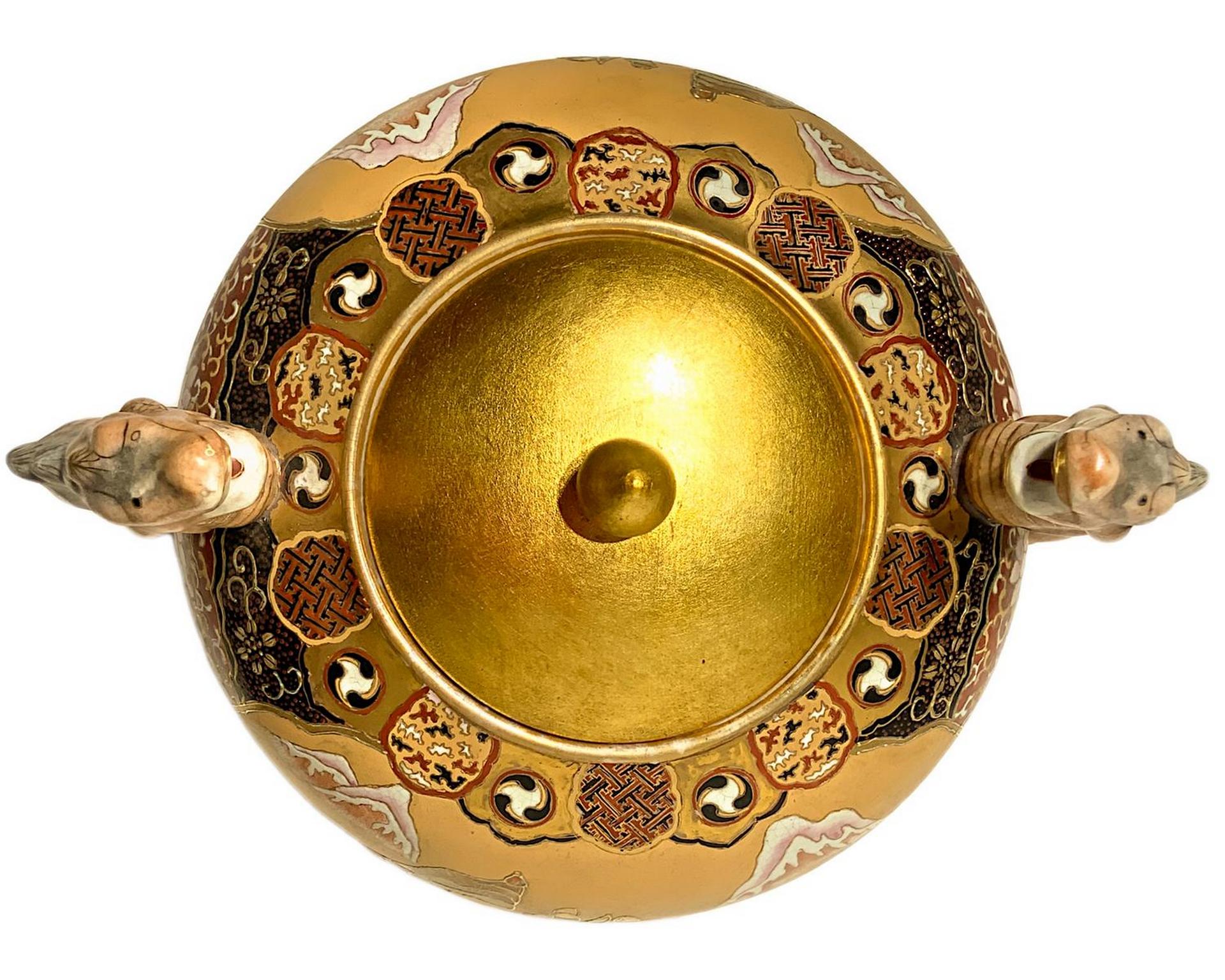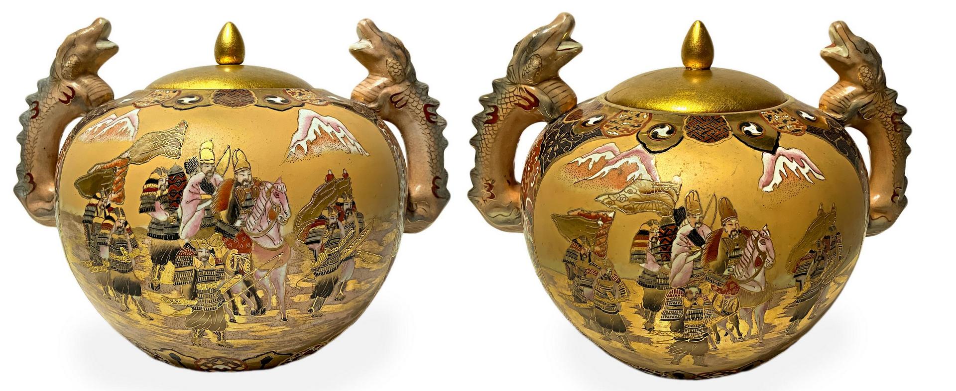 Coppia di potiche in porcellana con decorazioni in smalti e oro raffiguranti Samura, inizi XX secolo. H cm 29. Larghezza cm 40