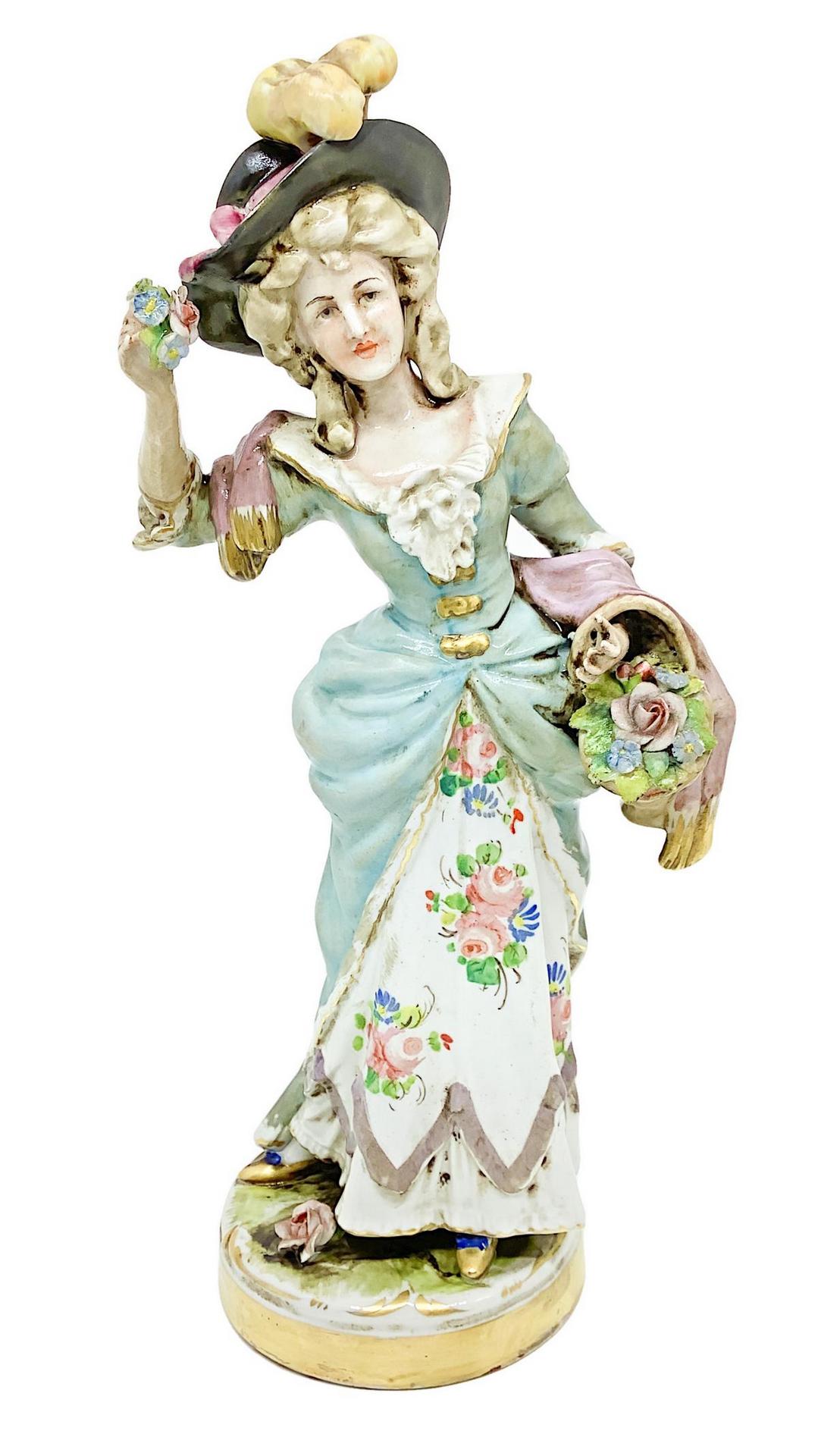 Portacandele in ottone con statuetta in porcellana di Capodimonte raffigurante dama con cesto di fiori, XX secolo. H cm 36.