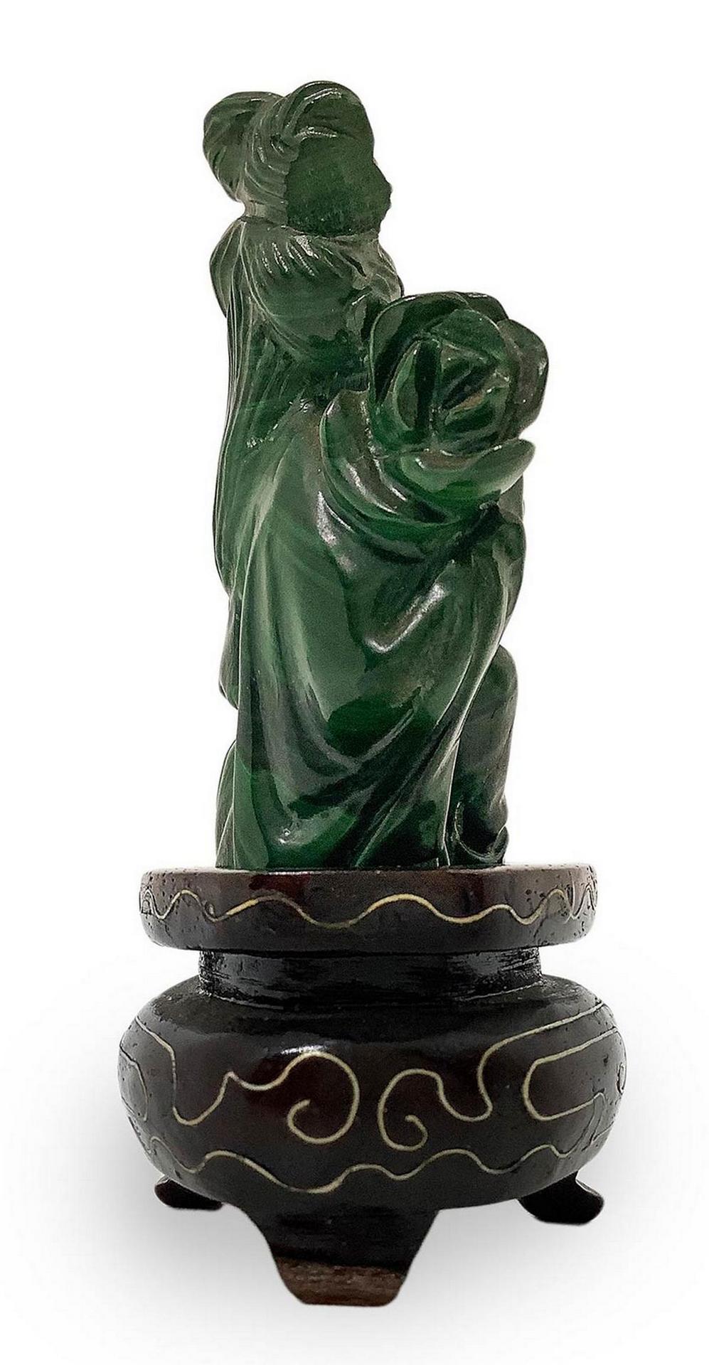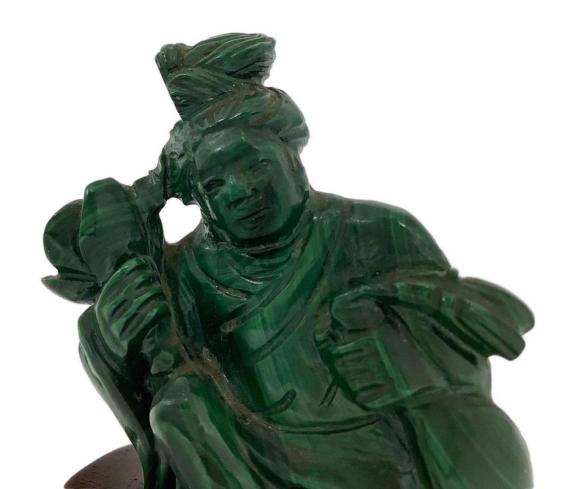 Piccola scultura in malachite raffigurante personaggio cinese con fiore in...