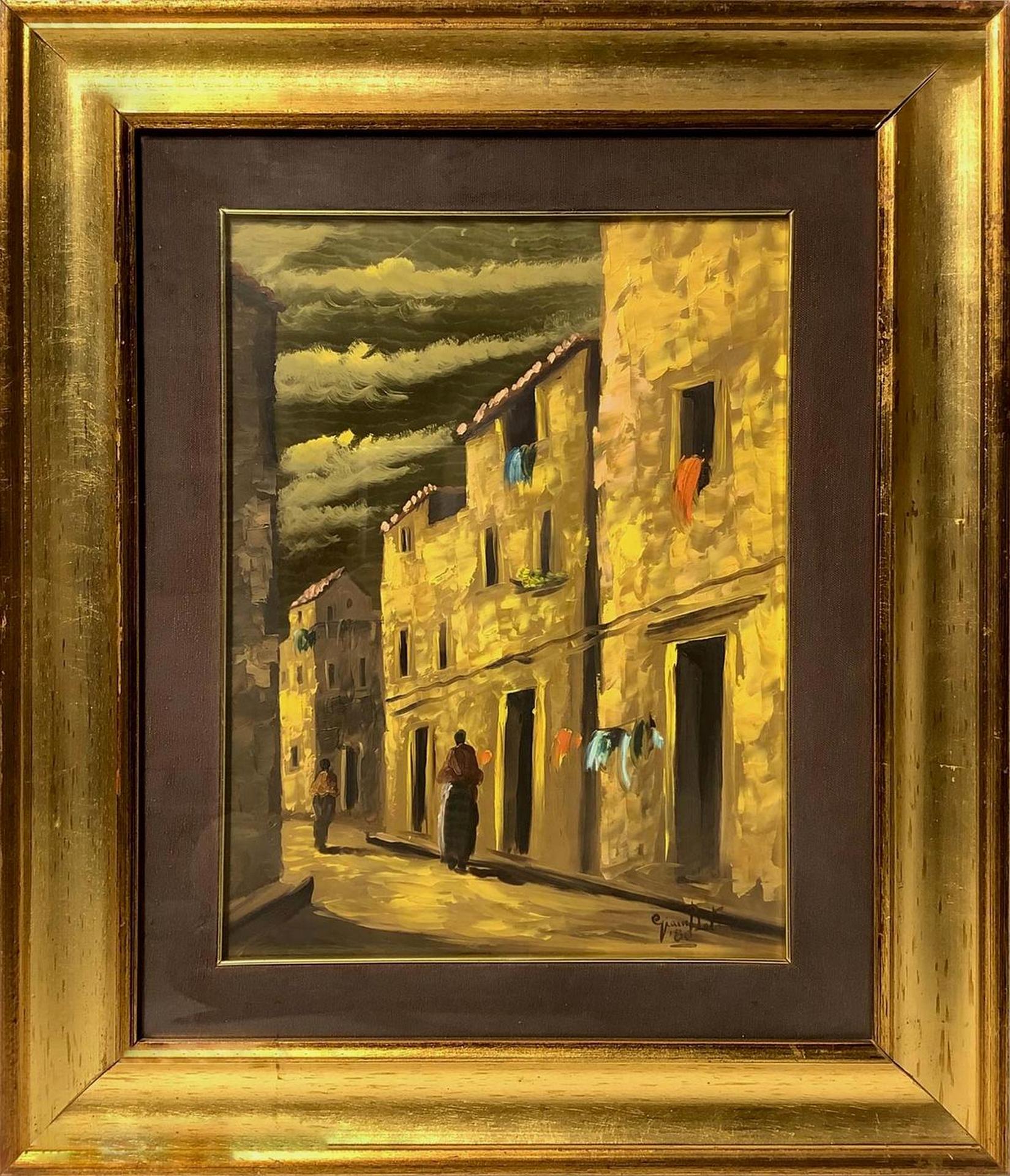 Olio su ottone raffigurante paesaggio “Scorcio di caseâ€_x009d_ firmato e datato in basso a destra Giambeti ’80. Cm 45x33 in cornice cm 70x57