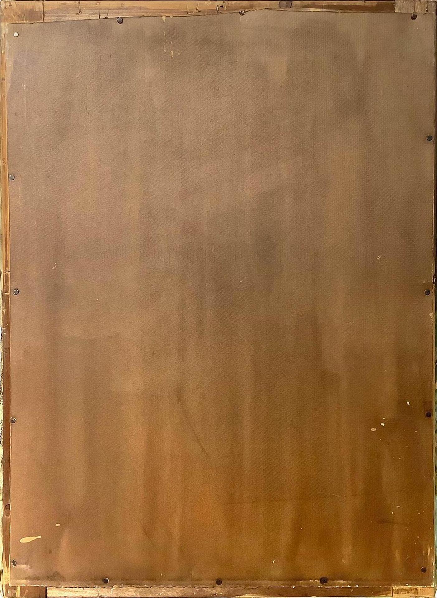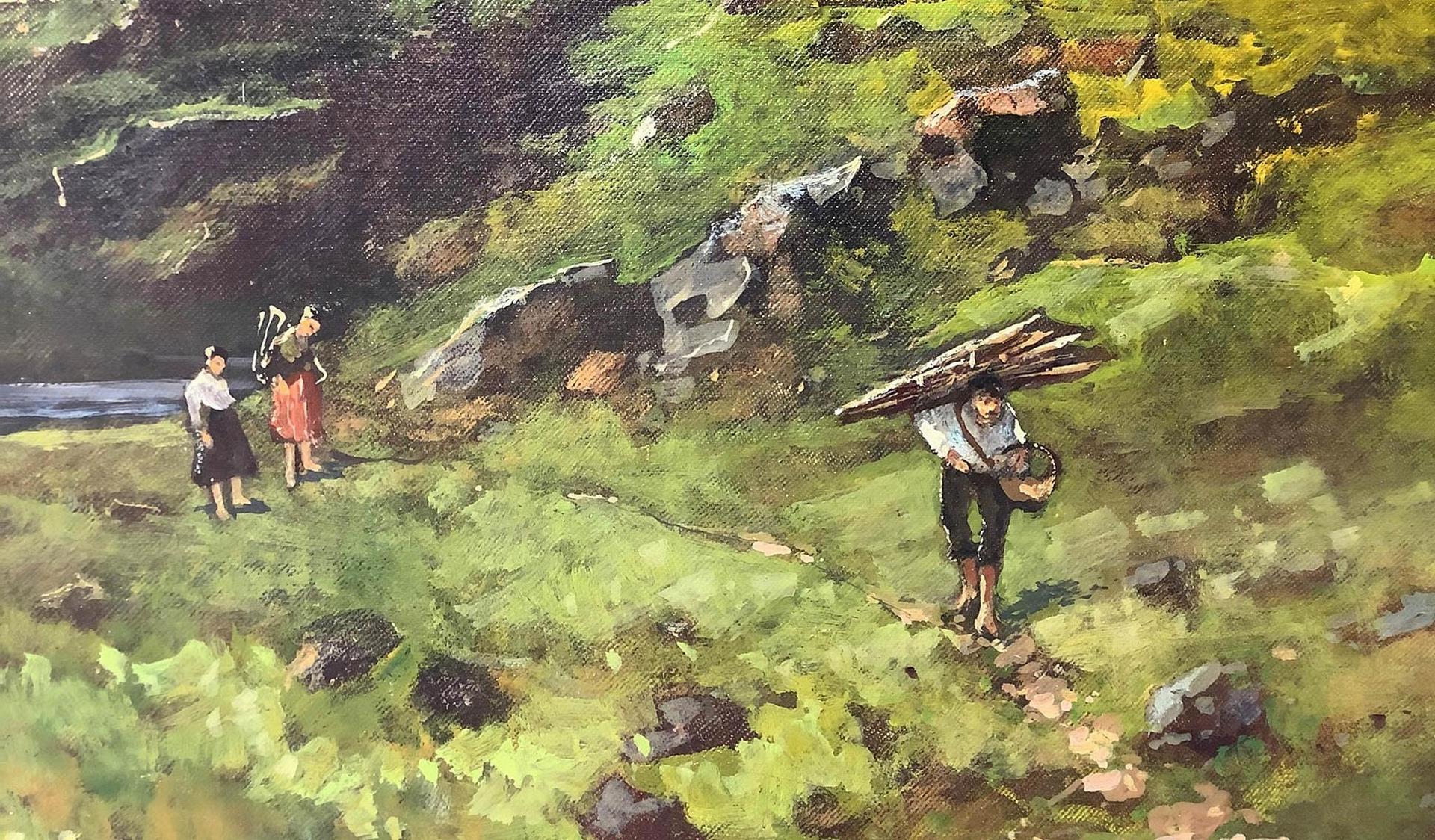Dipinto ad olio su tela raffigurante paesaggio montano con personaggi, inizi...