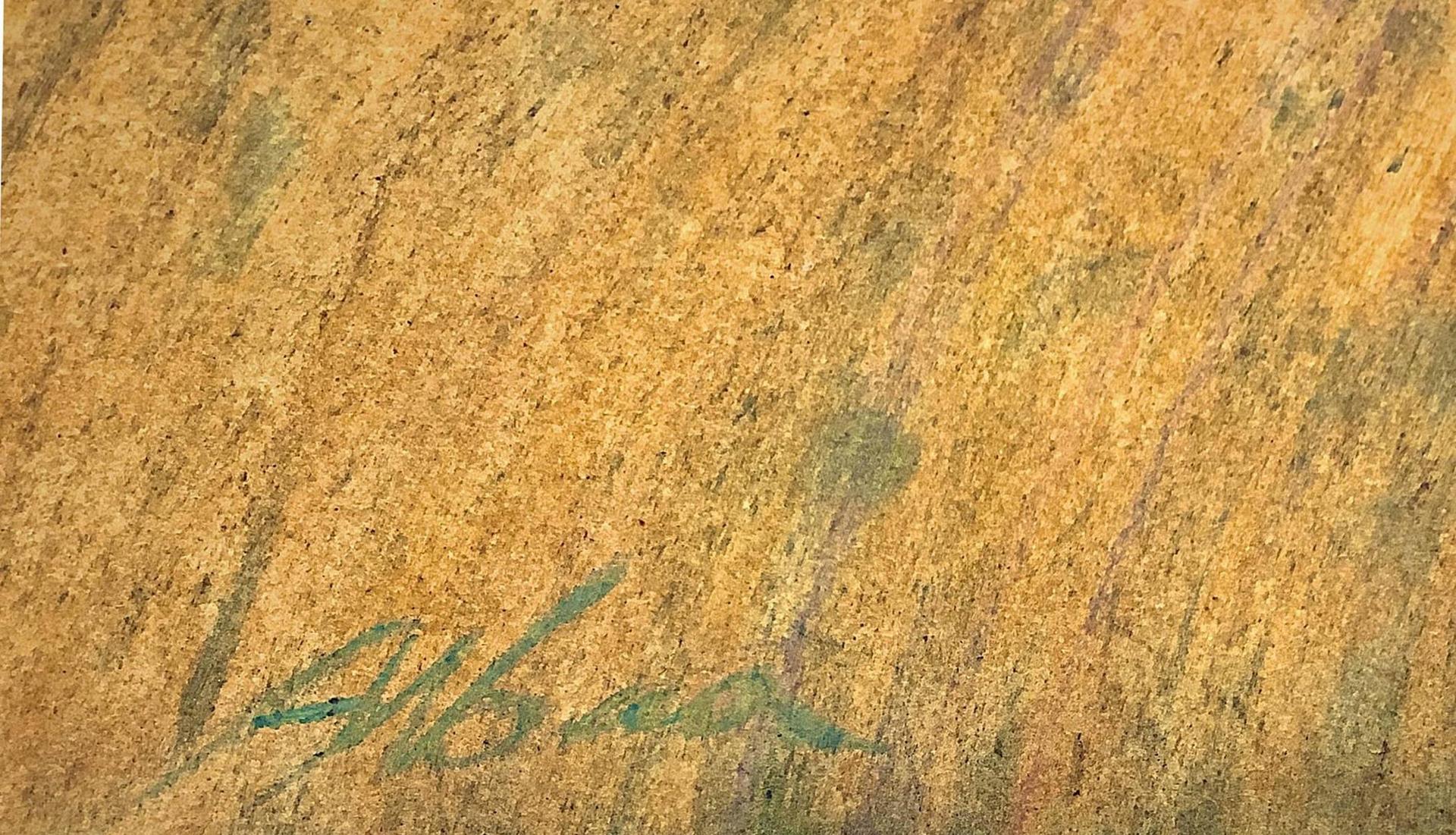 Pastello su cartoncino raffigurante paesaggio con case e alberi. Firmato...