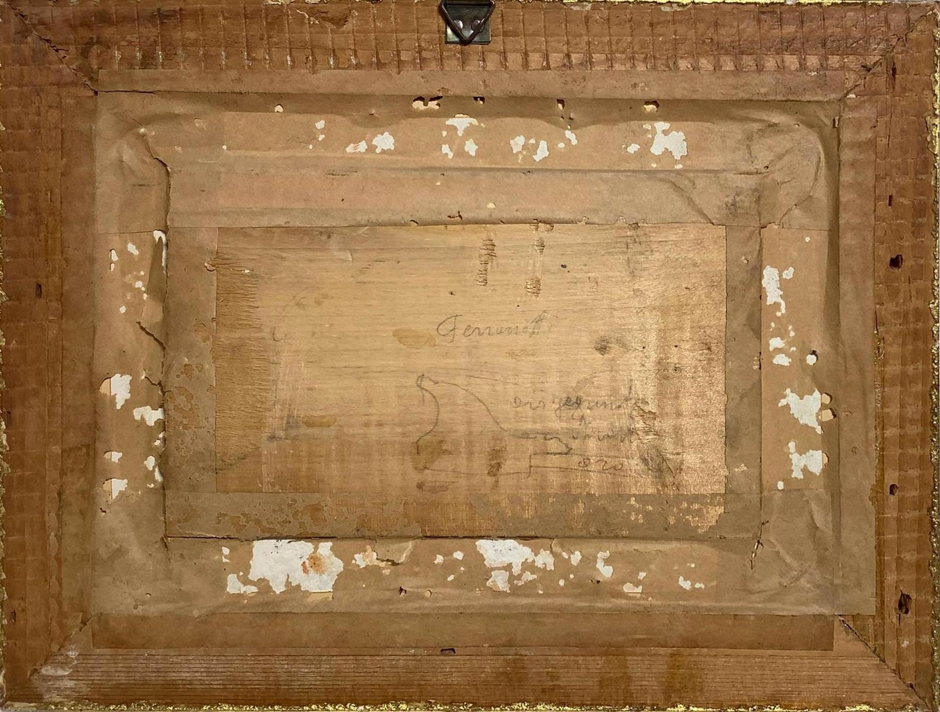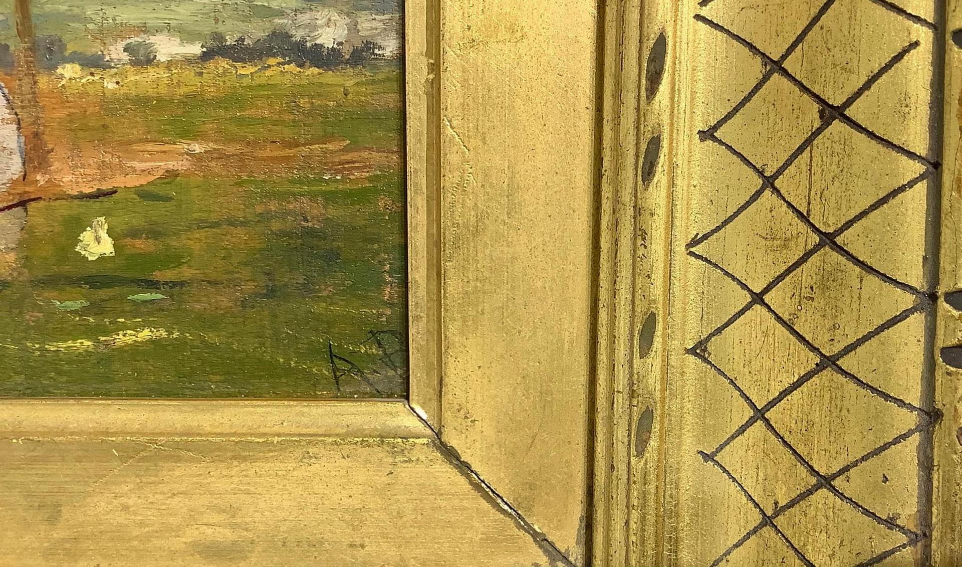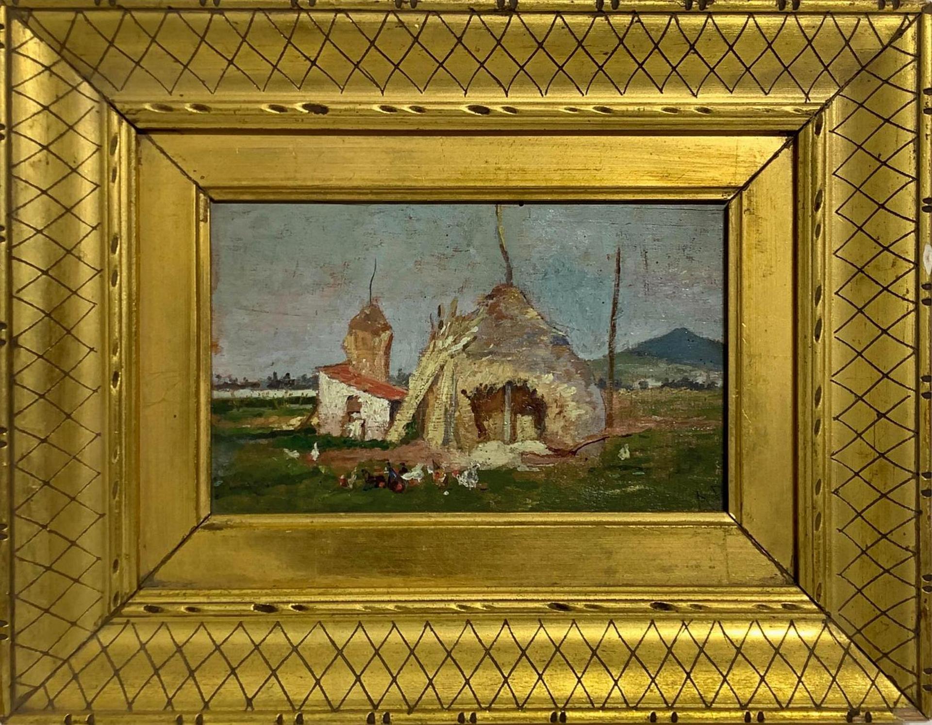 Dipinto ad olio su tavola raffigurante casolare di campagna con aia, XX secolo. In basso a destra monogramma A.B. Cm 12x18. Misure in cornice 23x30.