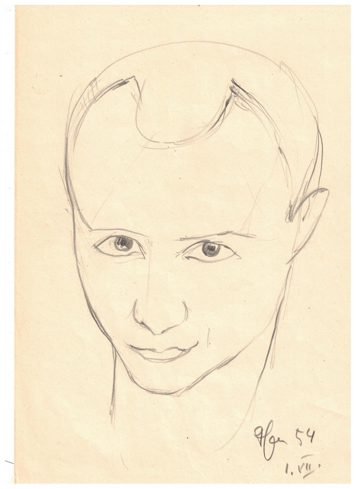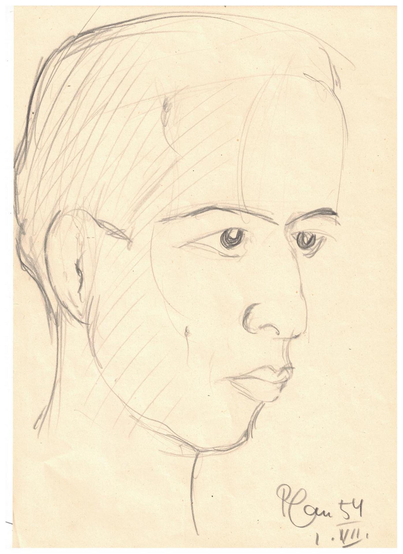 Disegno a matita su carta raffigurante volto di uomo su entrambi i lati, Sigfrido Pfau (Abbazia, 1899 - Roma, 1969). Cm 31x21,8. Firmato in basso a destra 54. I.VII