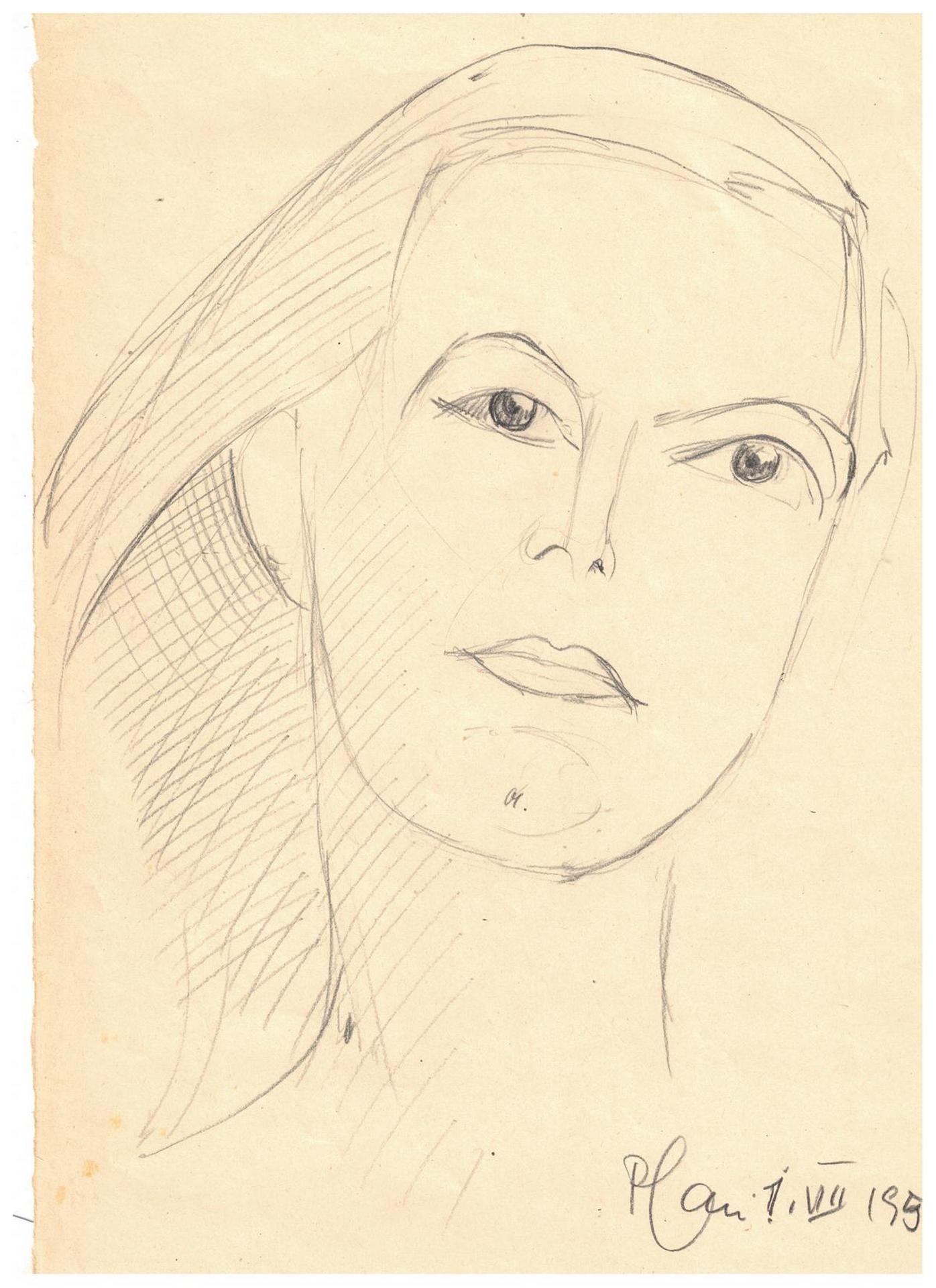 Disegno a matita su carta raffigurante volto di donna, Sigfrido Pfau (Abbazia, 1899 - Roma, 1969). Cm 31x21,8. Firmato in basso a destra 1954. I.VII