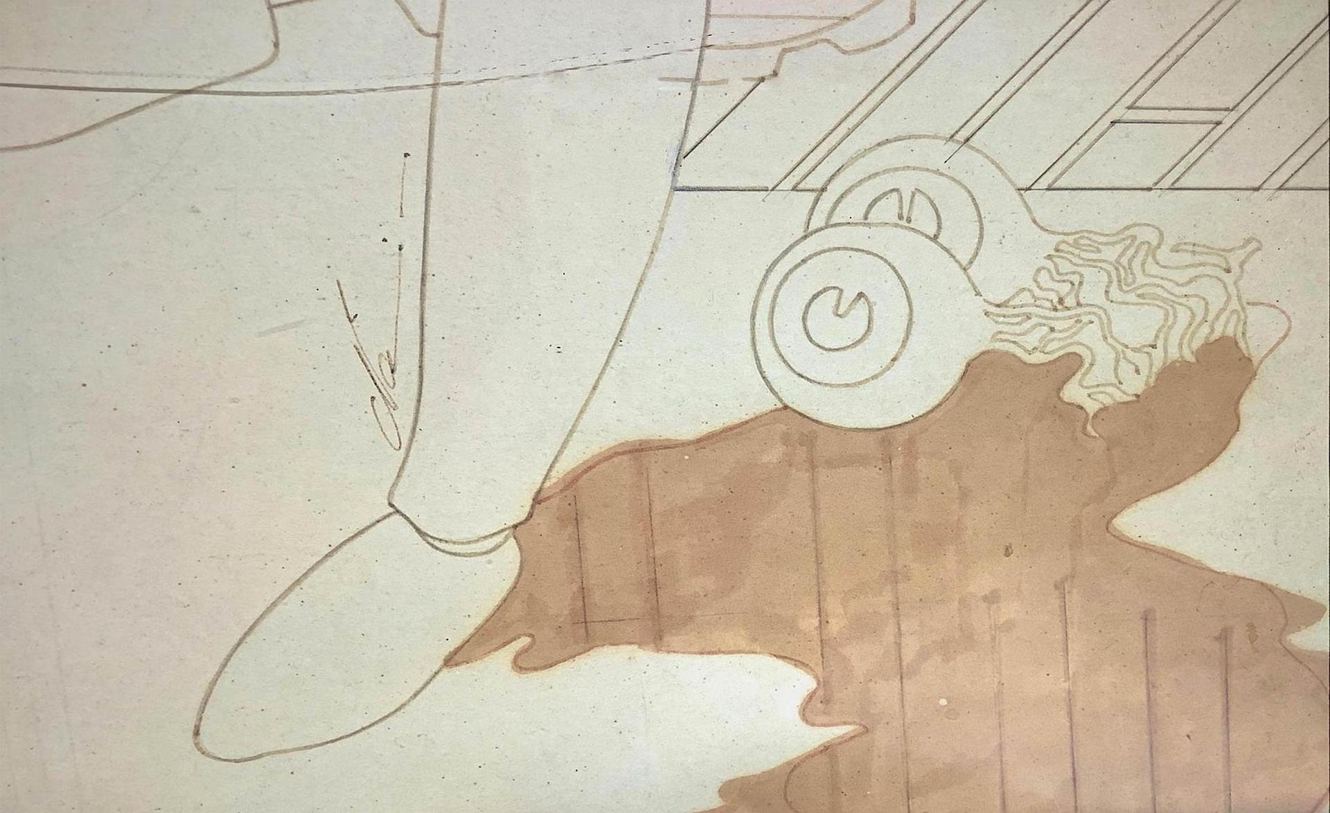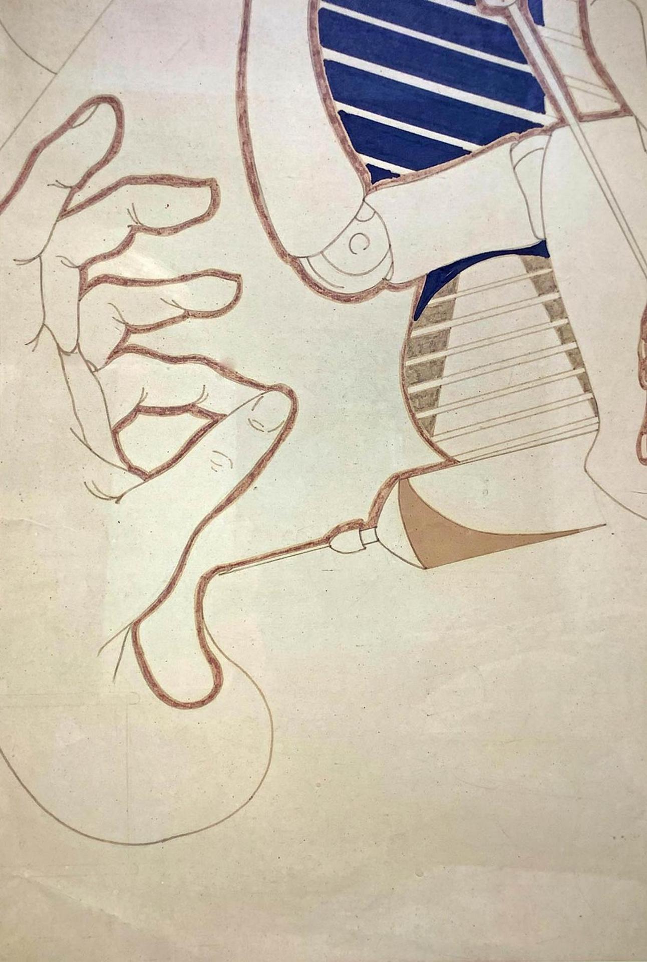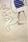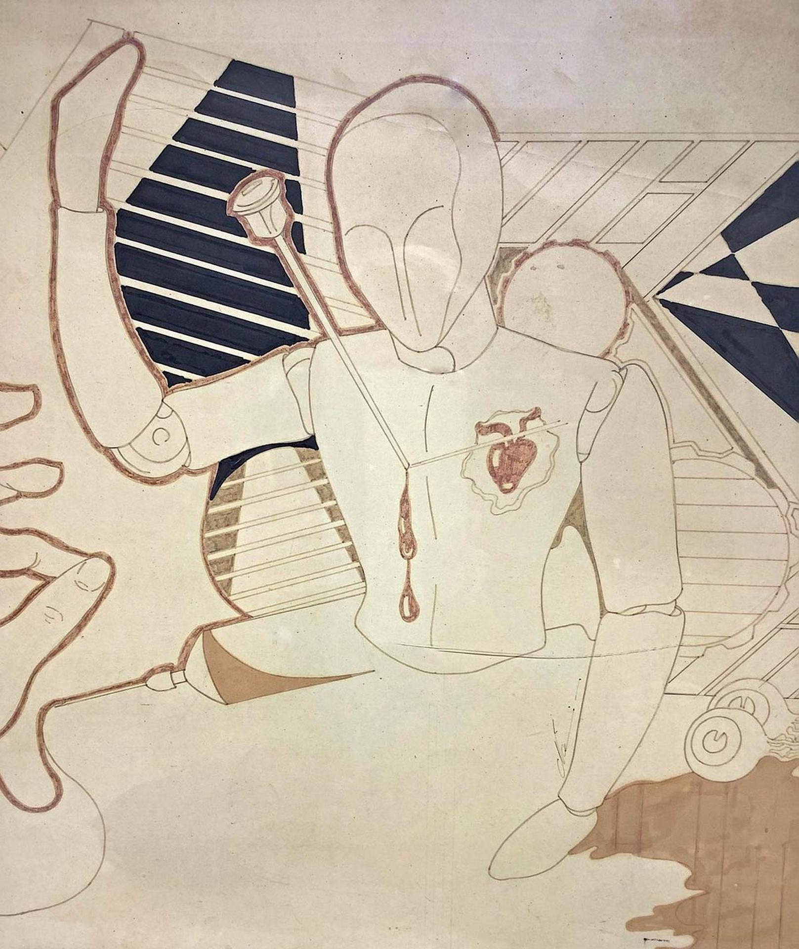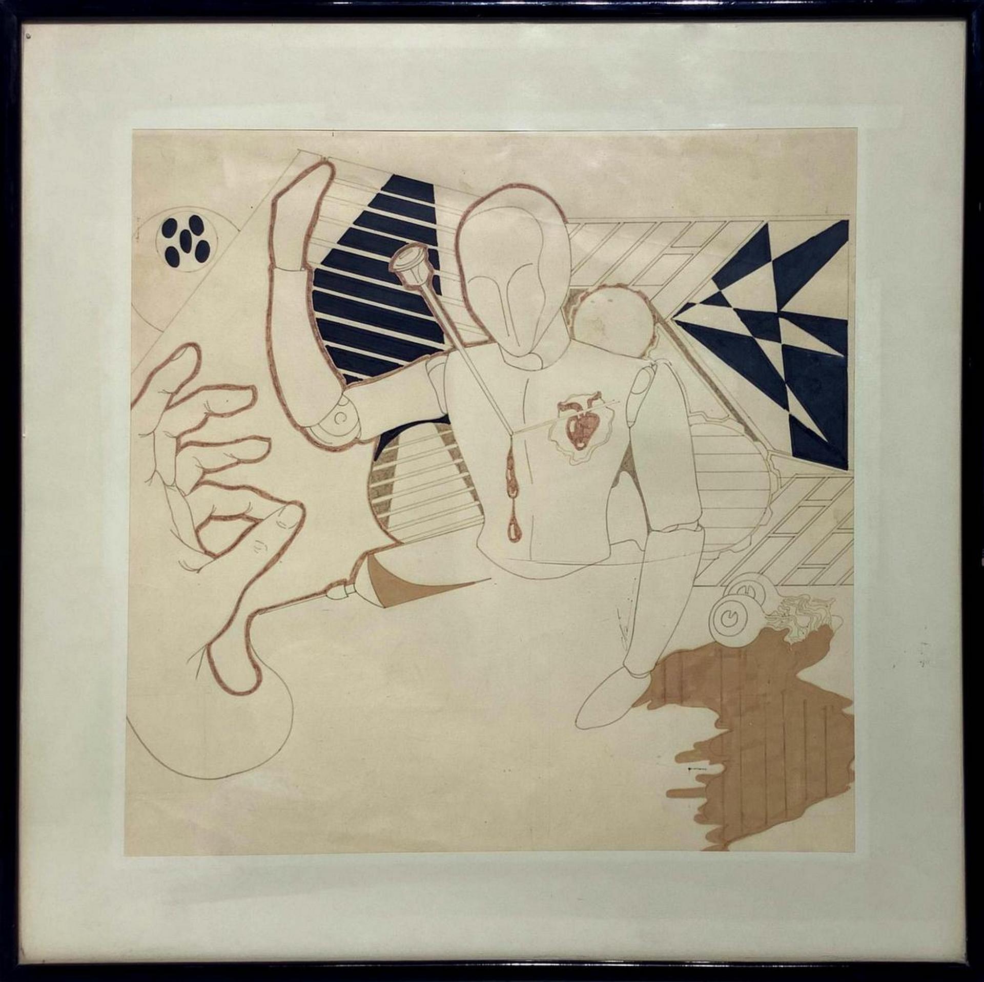 Tecnica mista su cartoncino raffigurante Robot. Cm 45x45. In cornice laccata nera cm 61x61. Firma illeggibile in basso al latere del braccio sinistro.