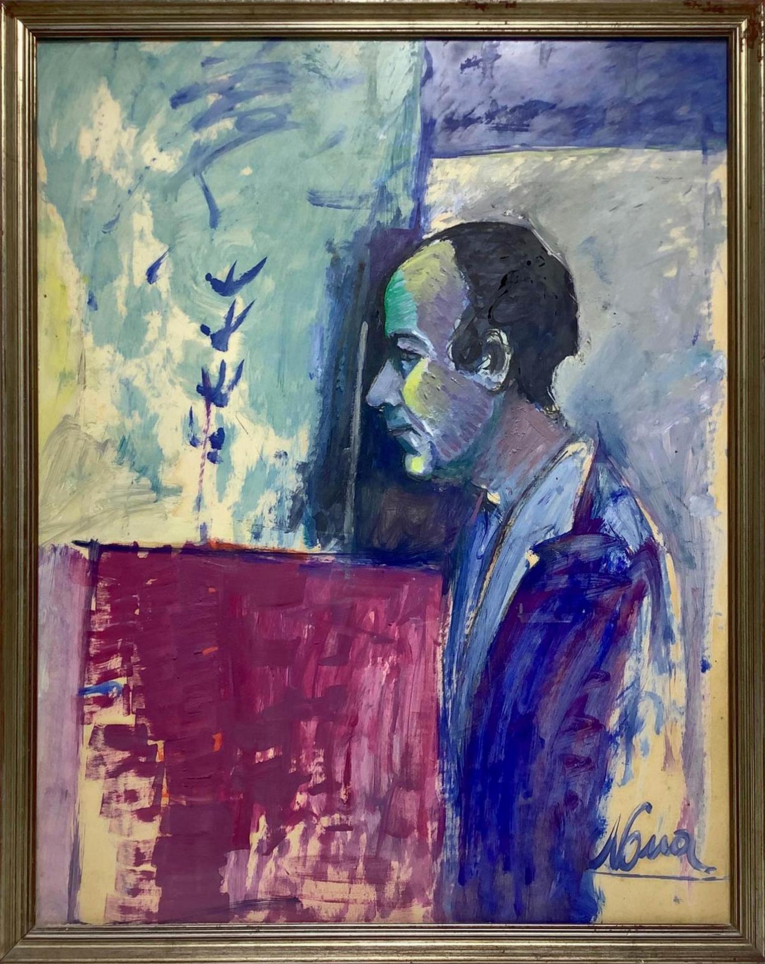 Dipinto ad olio su tela raffigurante profilo di personaggio, Angelo Nona (Favara 1937-1975 Catania). Professore d'arte e di pittura all'Istituto d'arte di Catania.