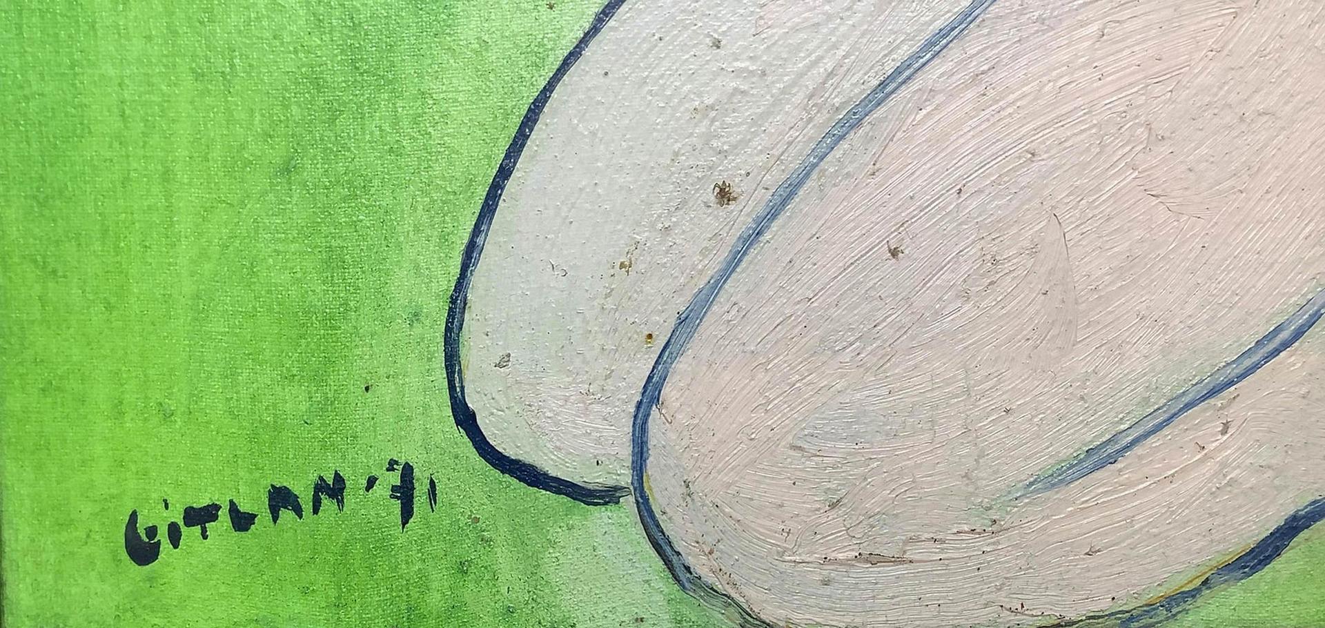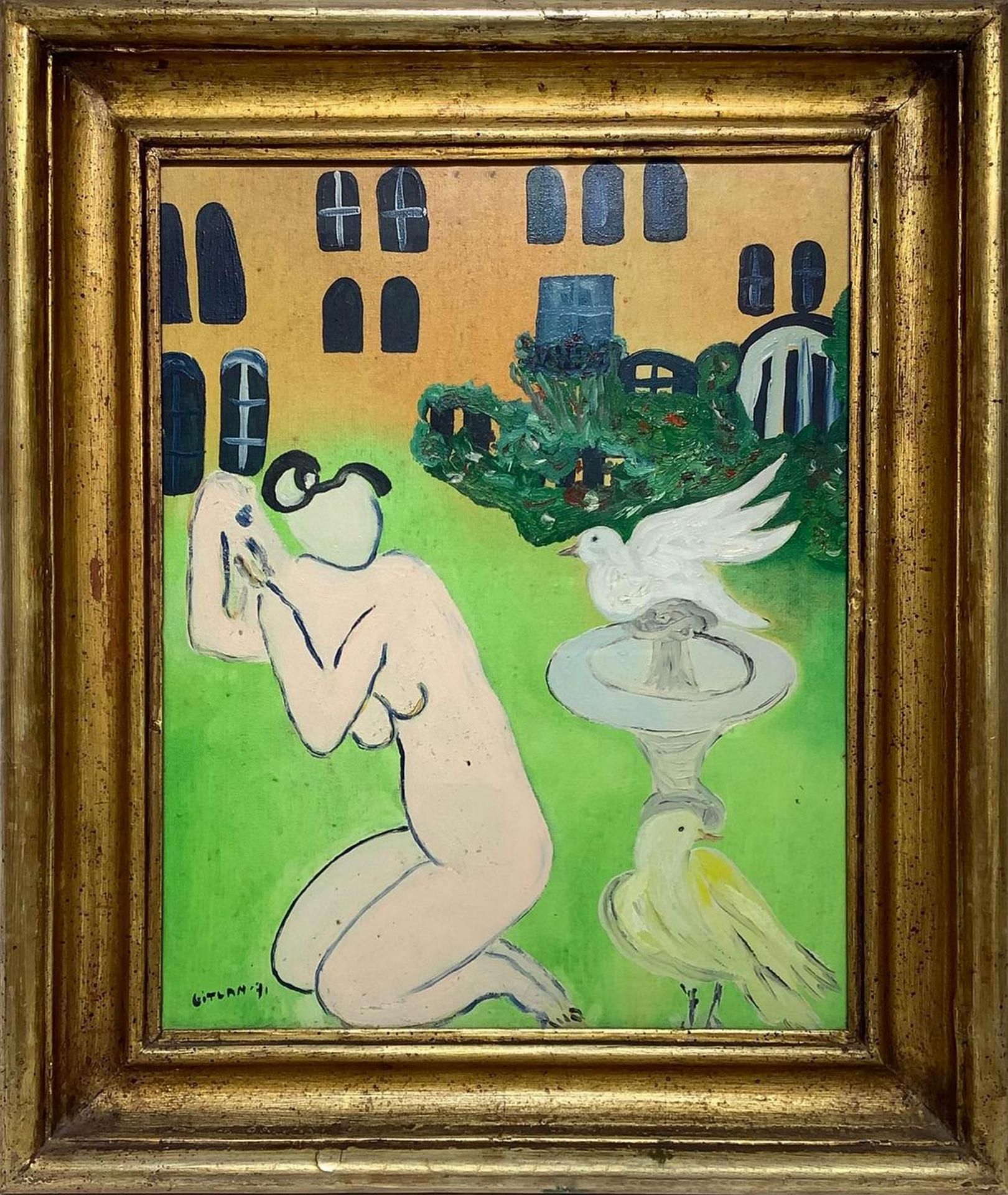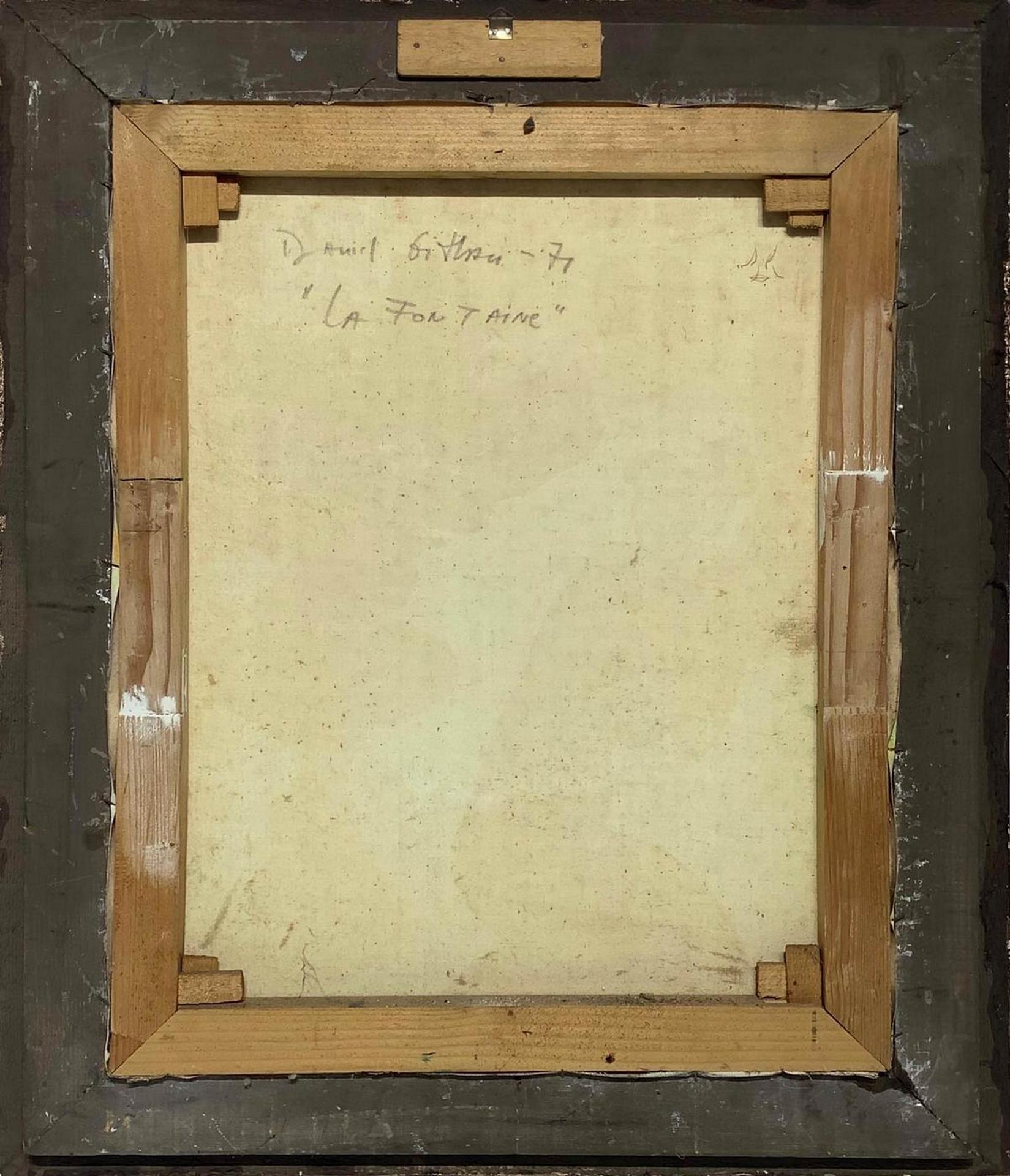 Dipinto ad olio su tela raffigurante "La fontaine" . Firmato e datato in basso a sinistra Gitlan '71 e sul retro Daniel Gitlan. Cm 52x40, con cornice cm 65x 55