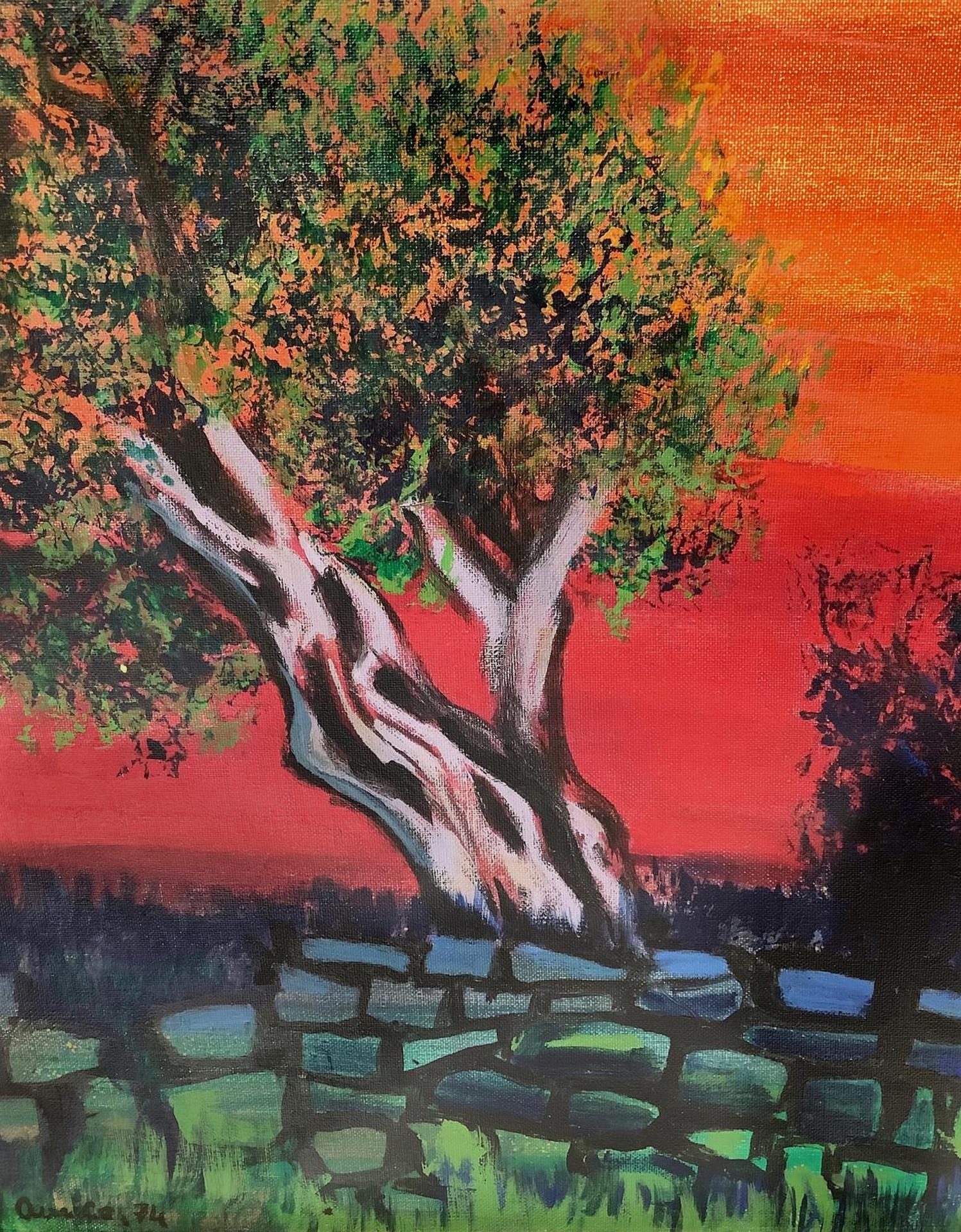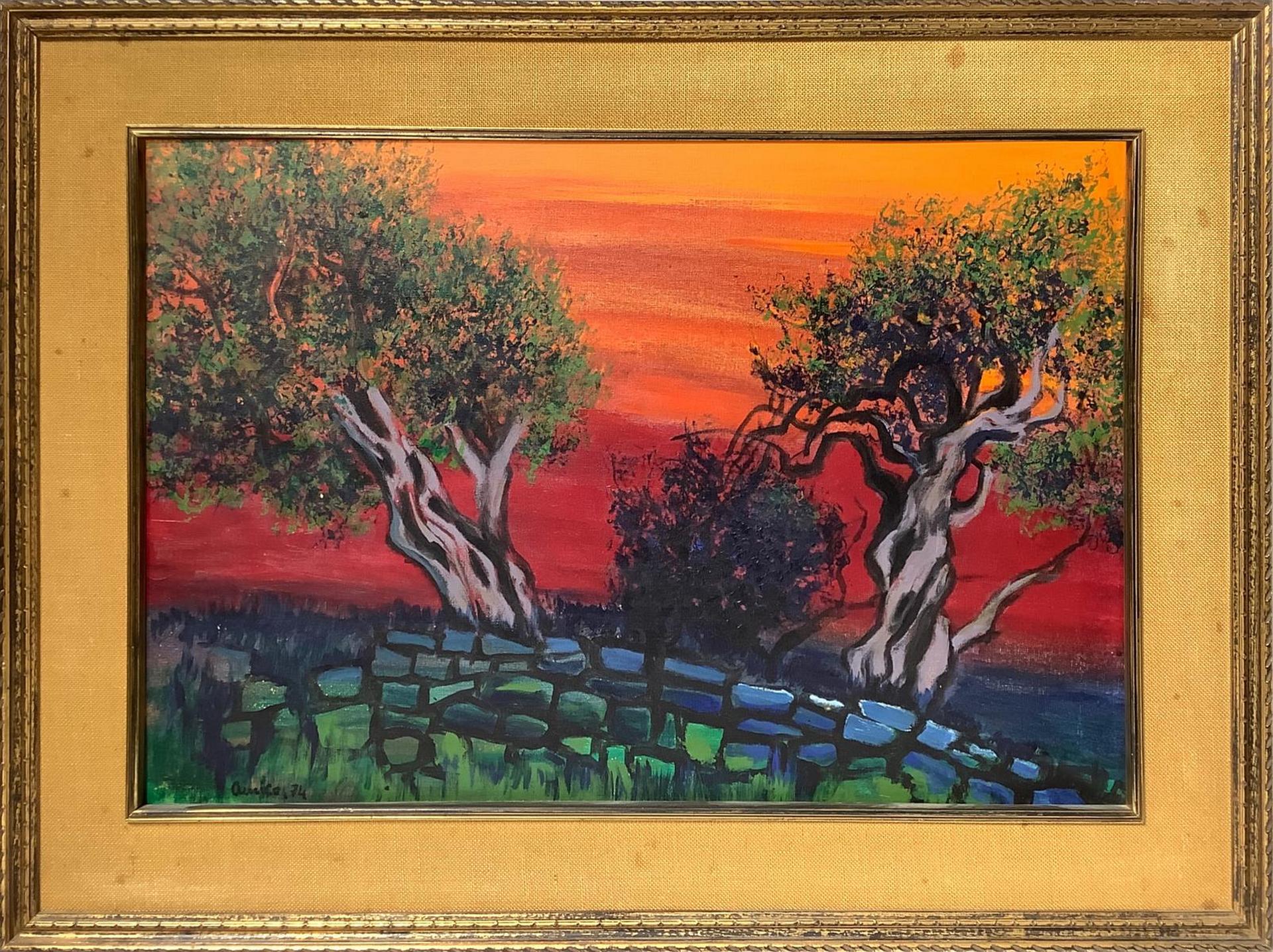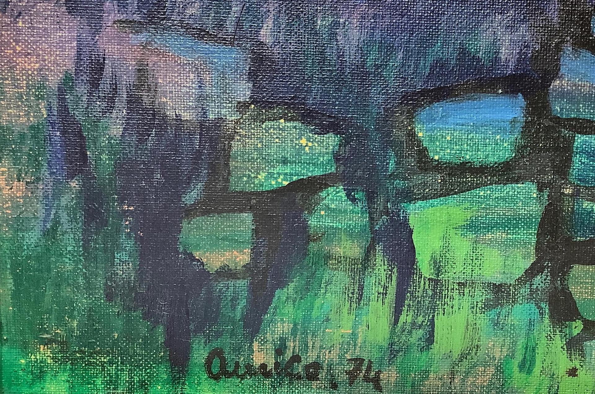 Dipinto ad olio su tela raffigurante paesaggio con alberi. Cm 53x80. Firmato in basso a sinistra Amico 74