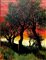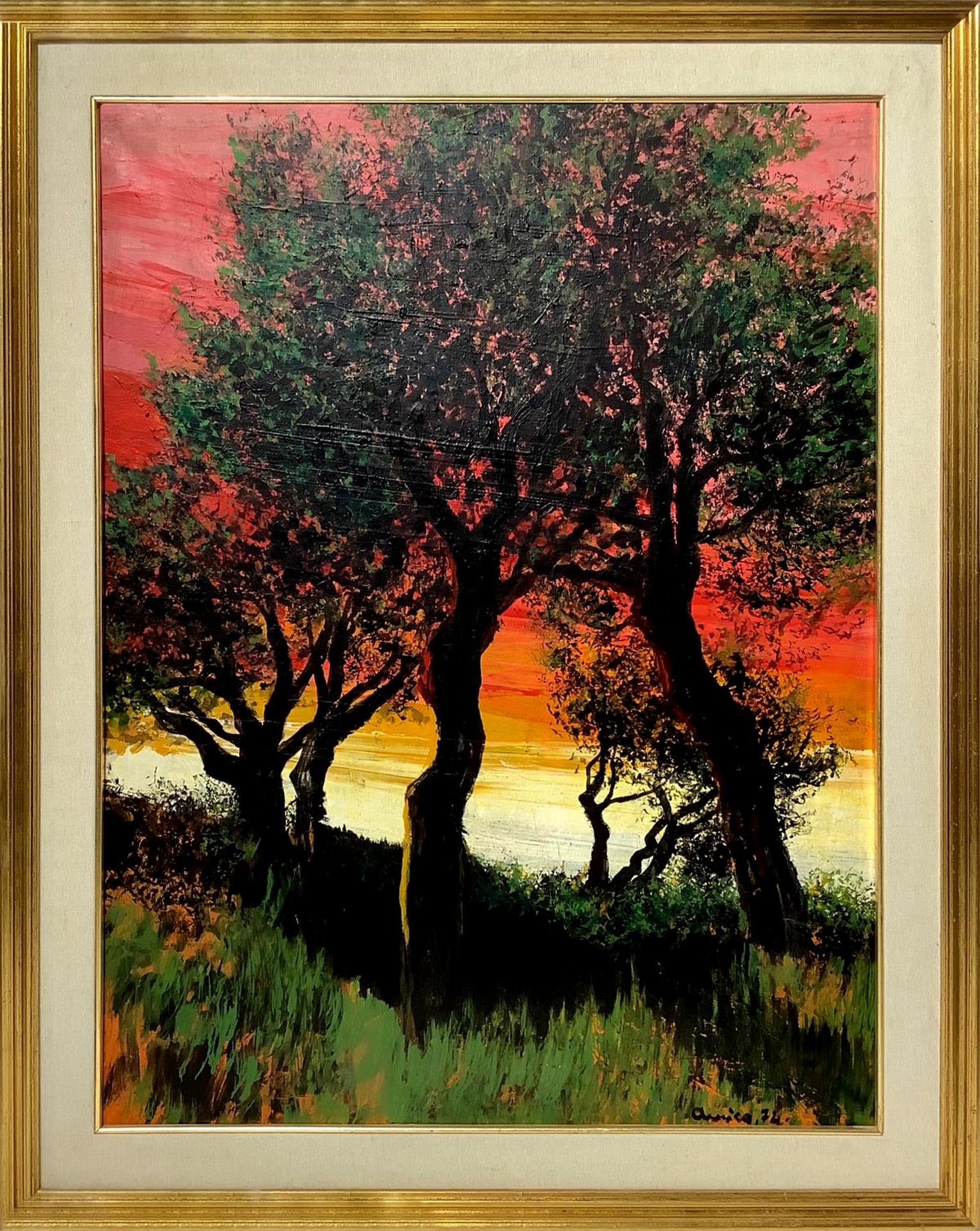 Dipinto ad olio su tela raffigurante paesaggio con alberi al tramonto. Cm 80x60. Firmato in basso a destra Amico 74