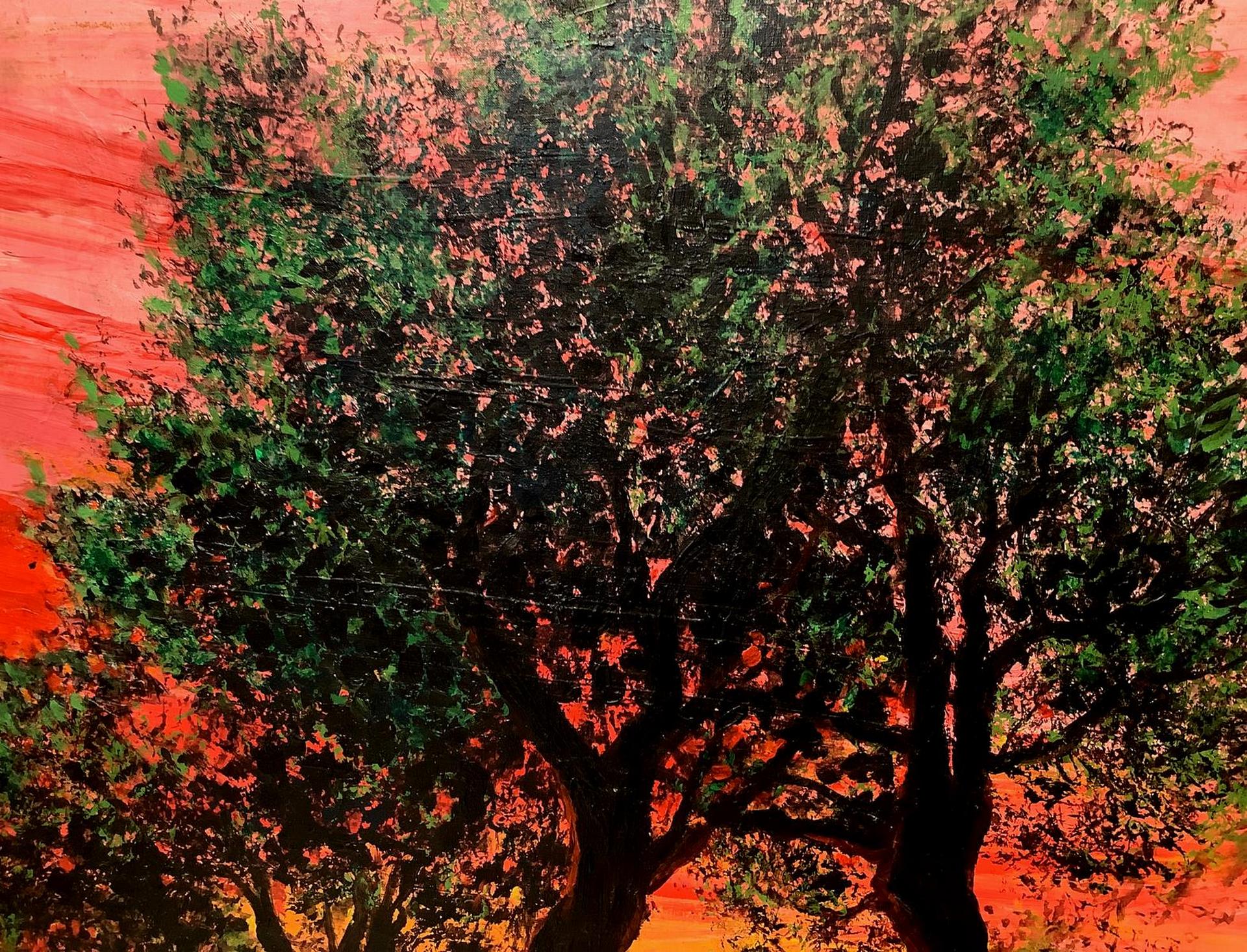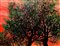 Dipinto ad olio su tela raffigurante paesaggio con alberi al tramonto. Cm...