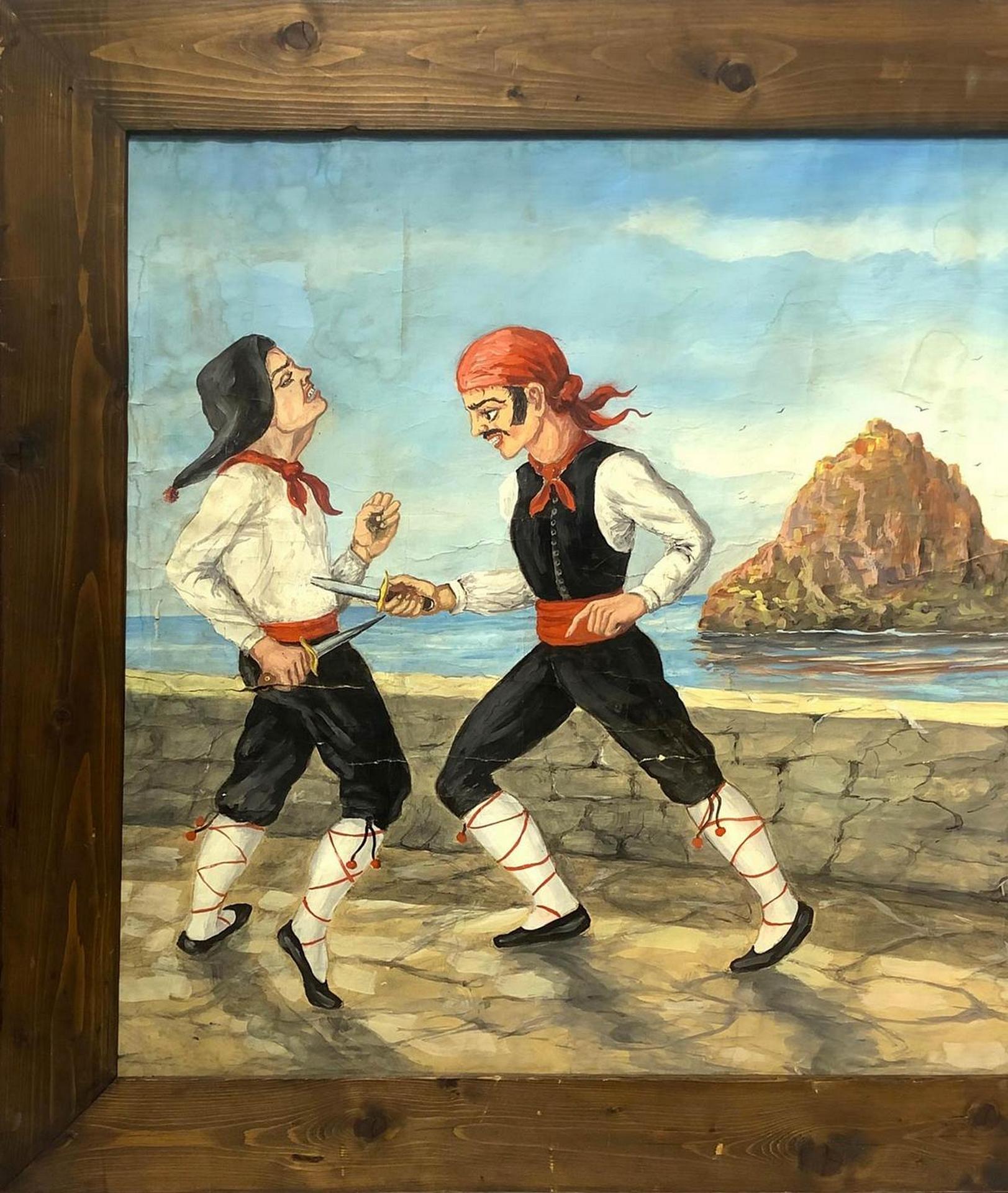 Gouache su carta raffigurante duello rusticano nei pressi di Acitrezza. XX secolo. Cm 120x67.