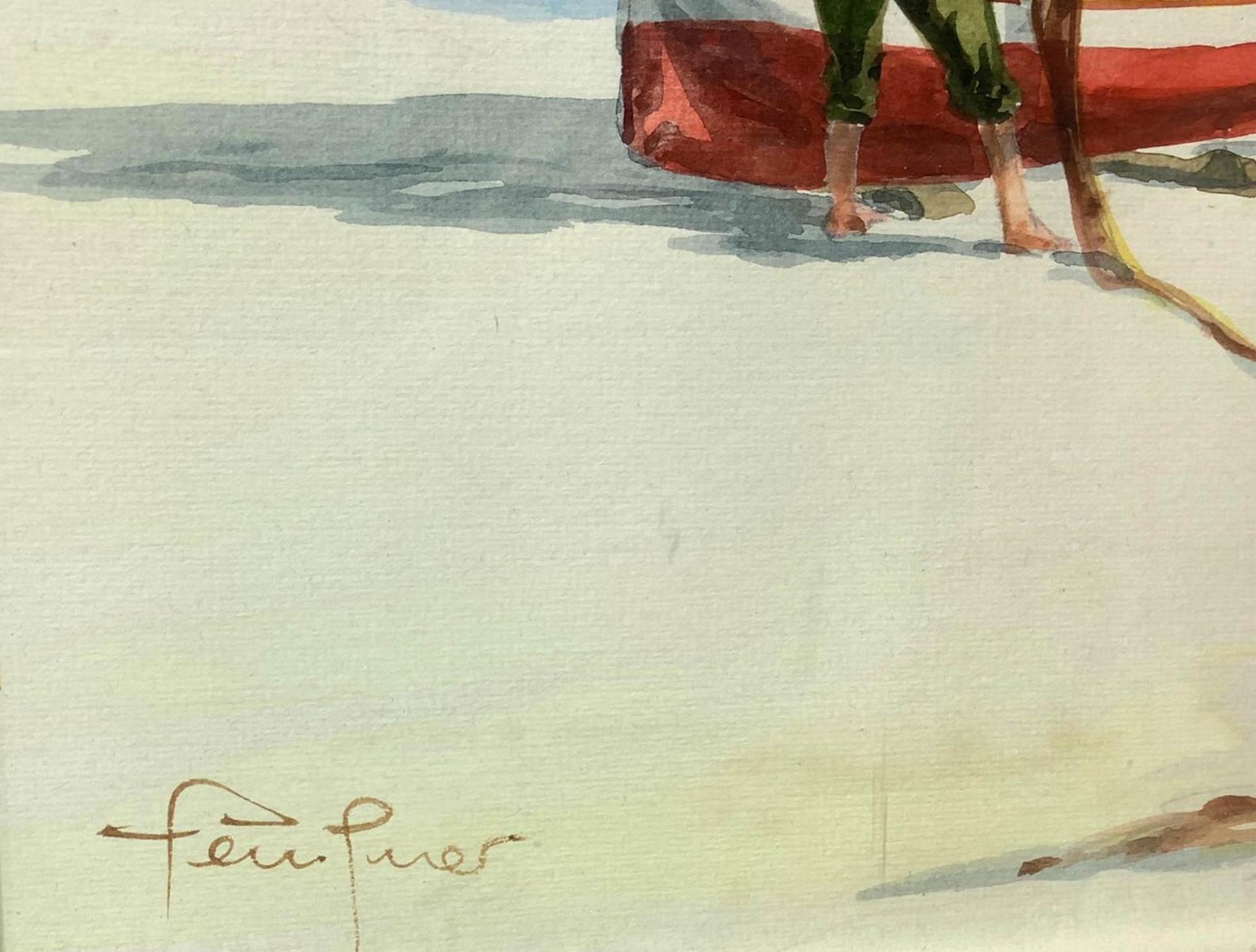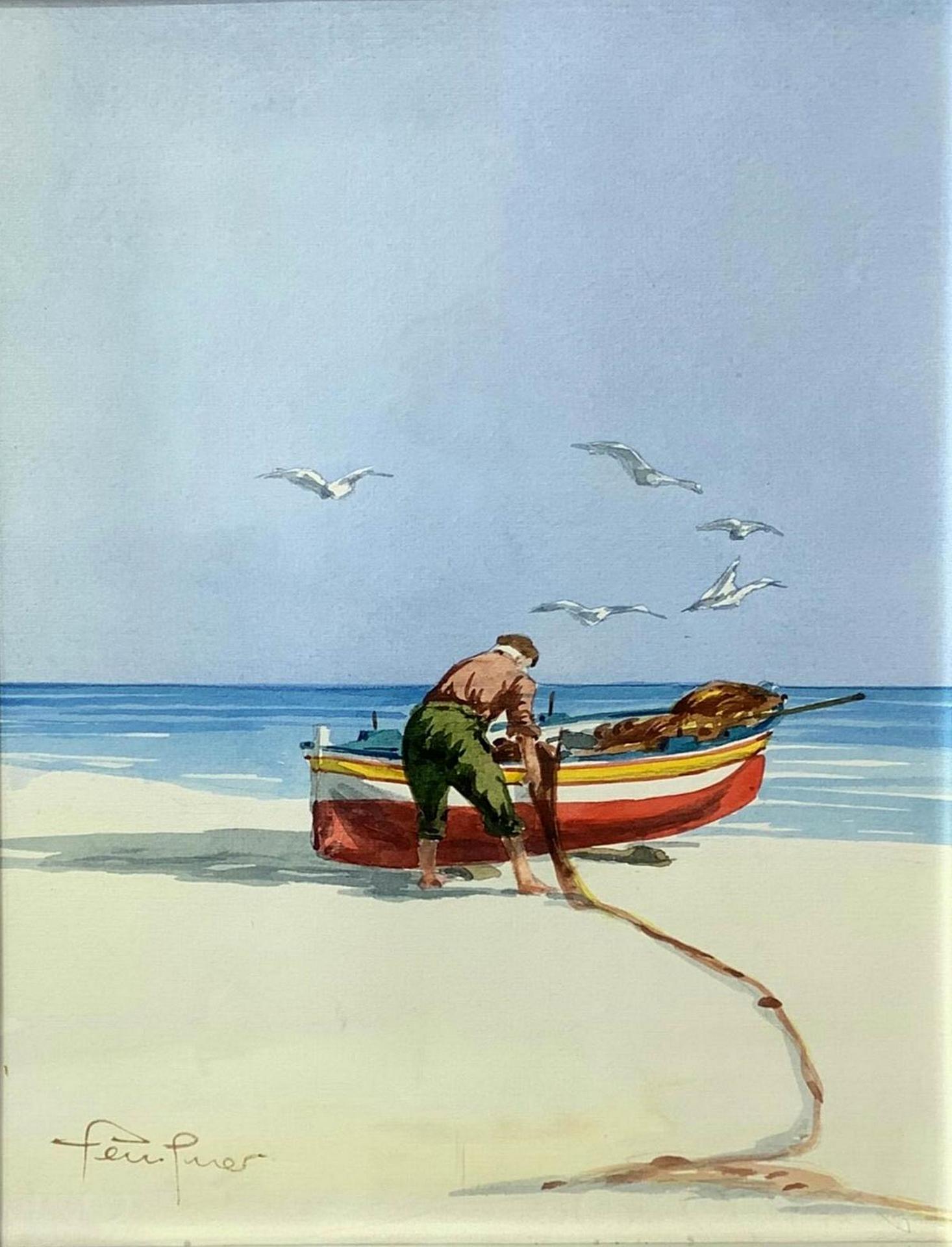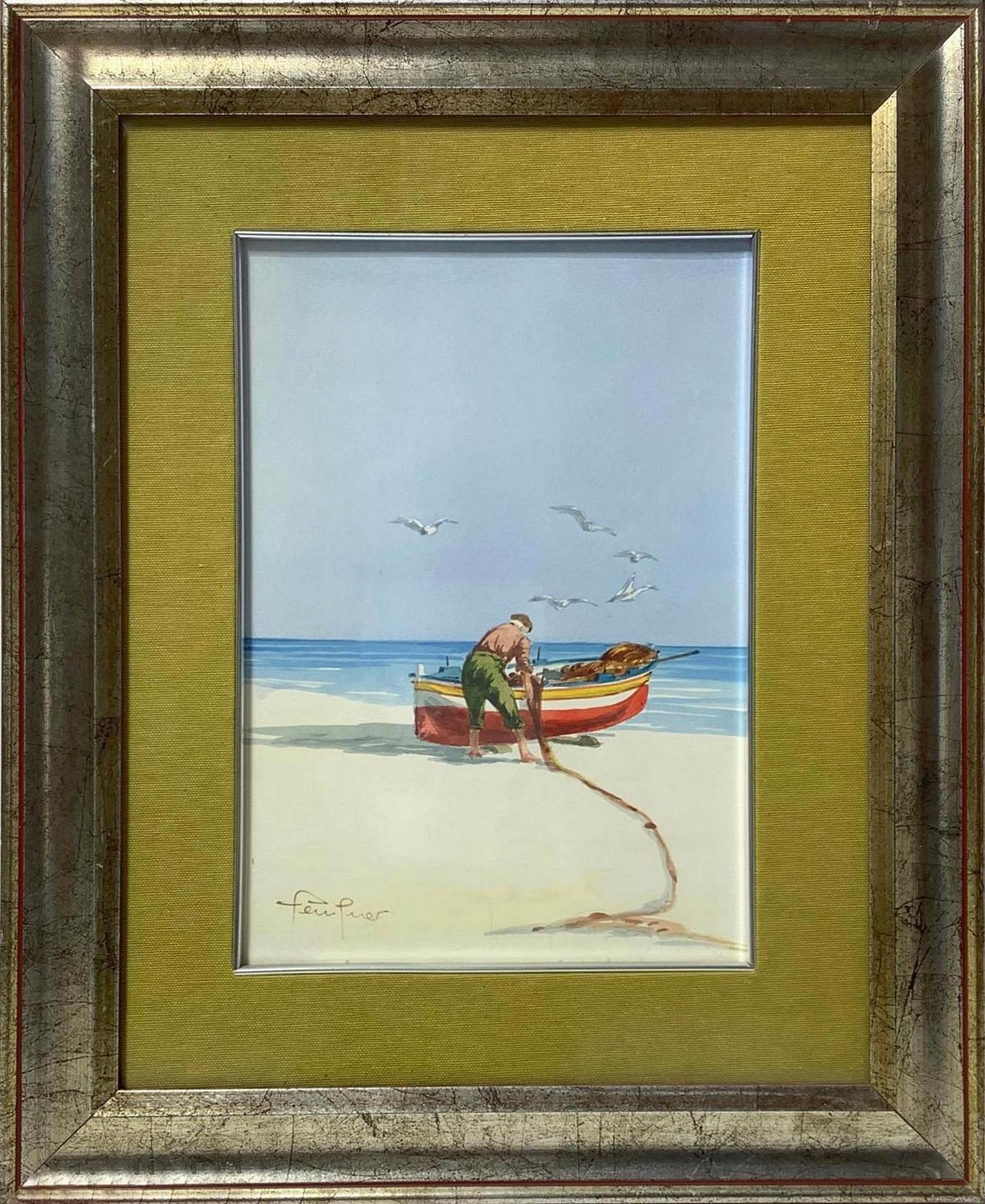 Gouache su cartoncino raffigurante pescatore con barca in riva al mare, cm...