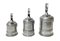 Trittico di antichi versatoi in peltro massiccio 95, XIX secolo. Da importante collezione privata. Di differenti misure. Con stemma e punzone sulla base. 1) H cm 30, diametro cm 14. 2) H cm 24,5, diametro cm 11,8. 3) H cm 20, diametro cm 11. Piccole ammaccature