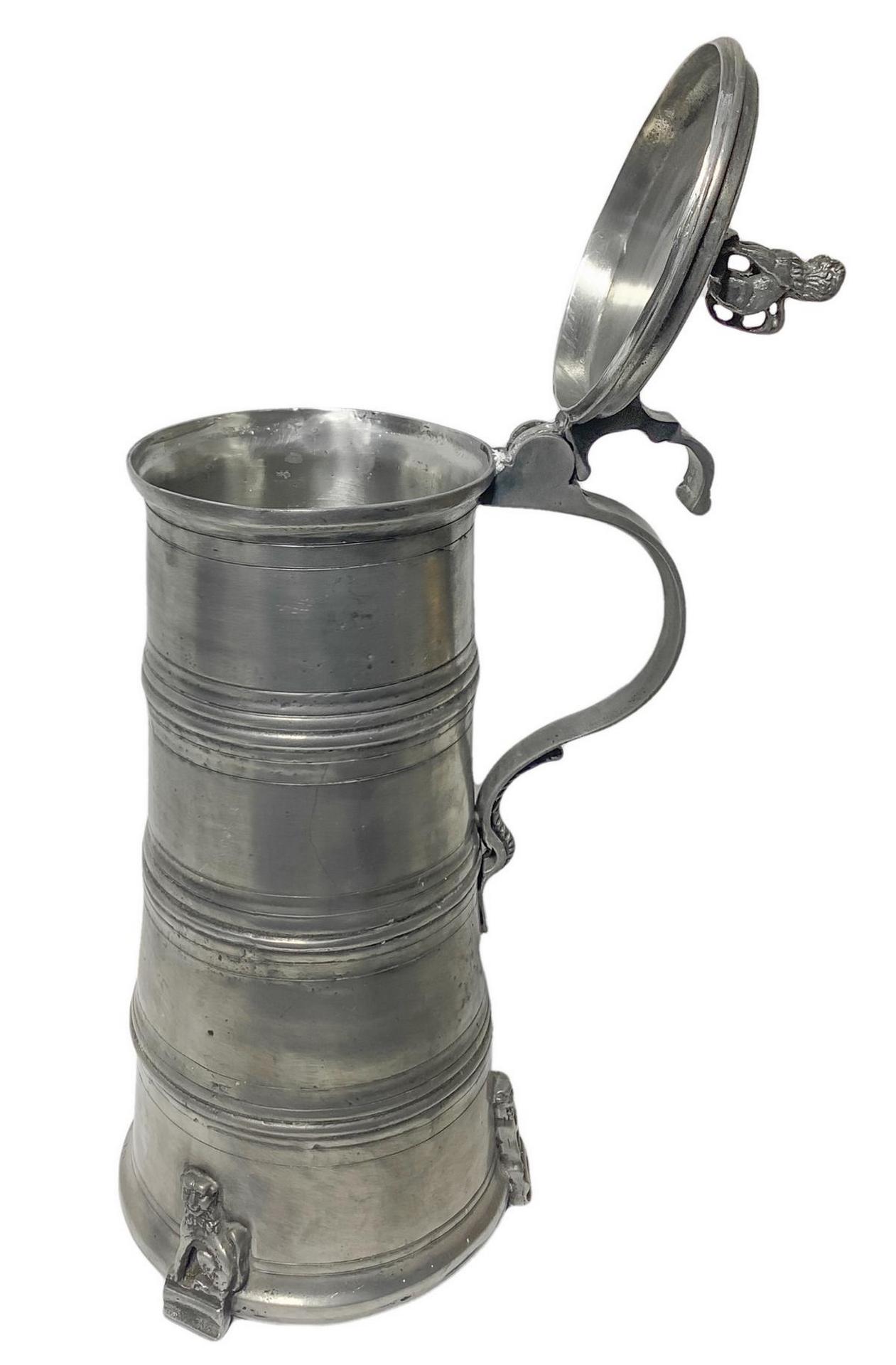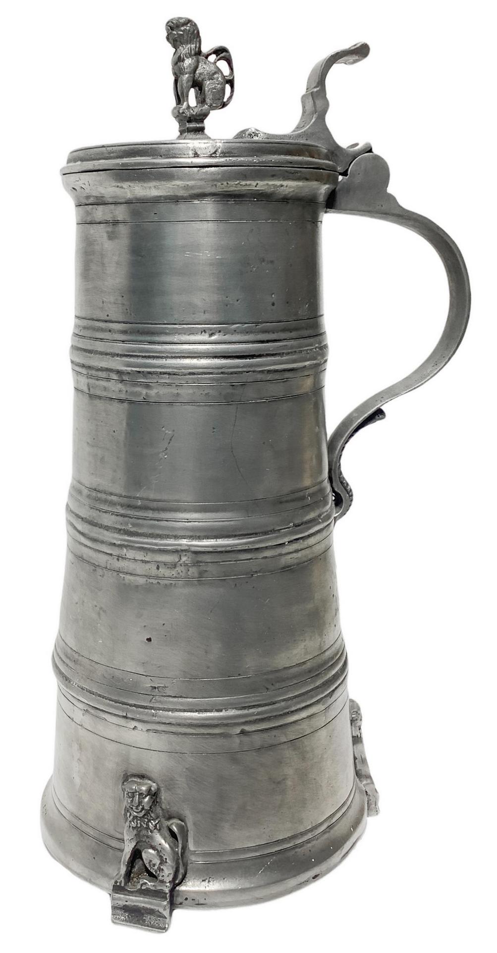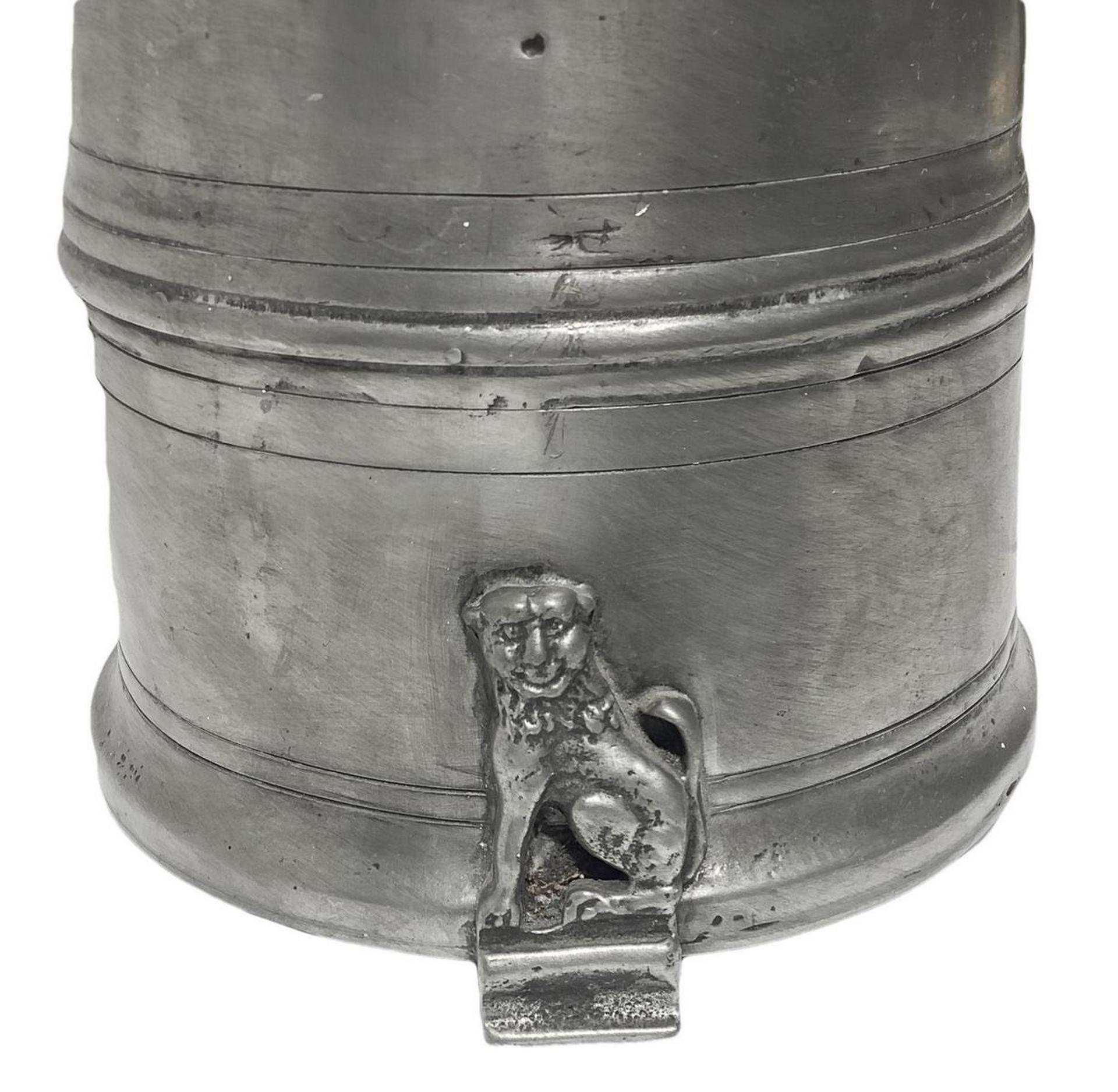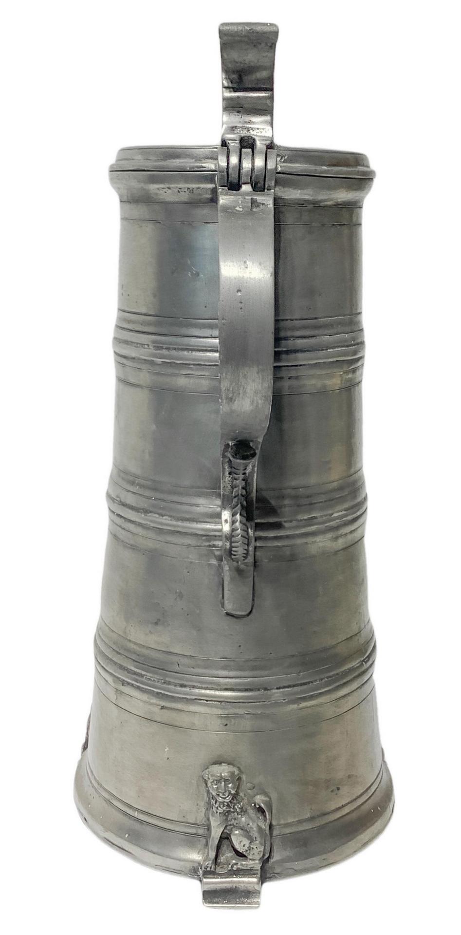 Antica caraffa in peltro. Manico con leone. Piedini con forme canine H cm 43