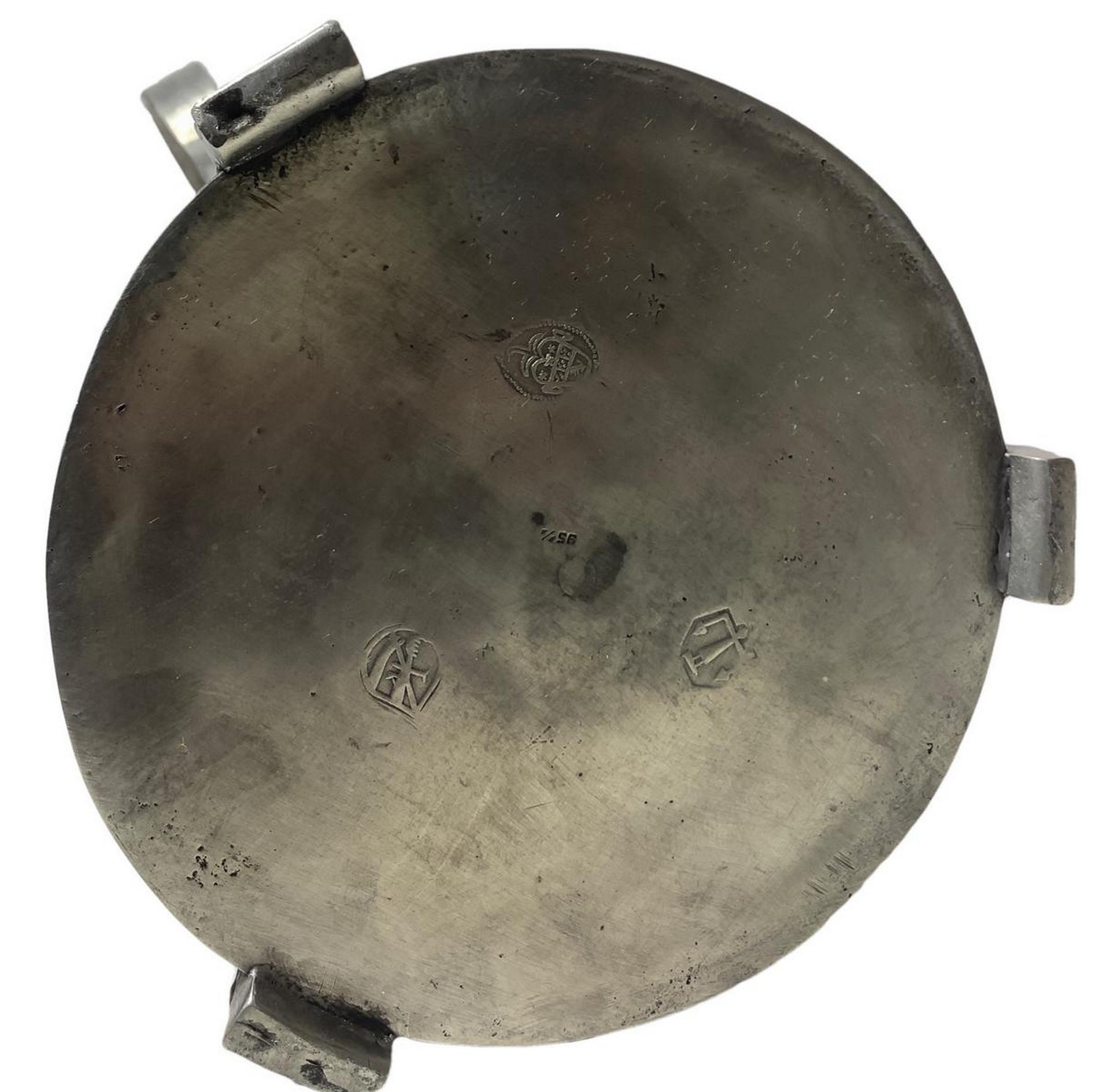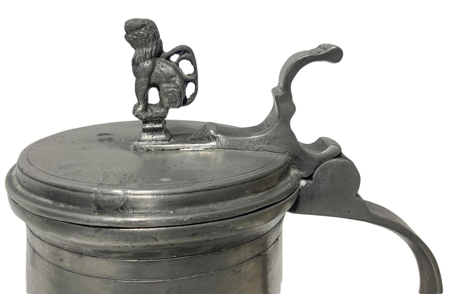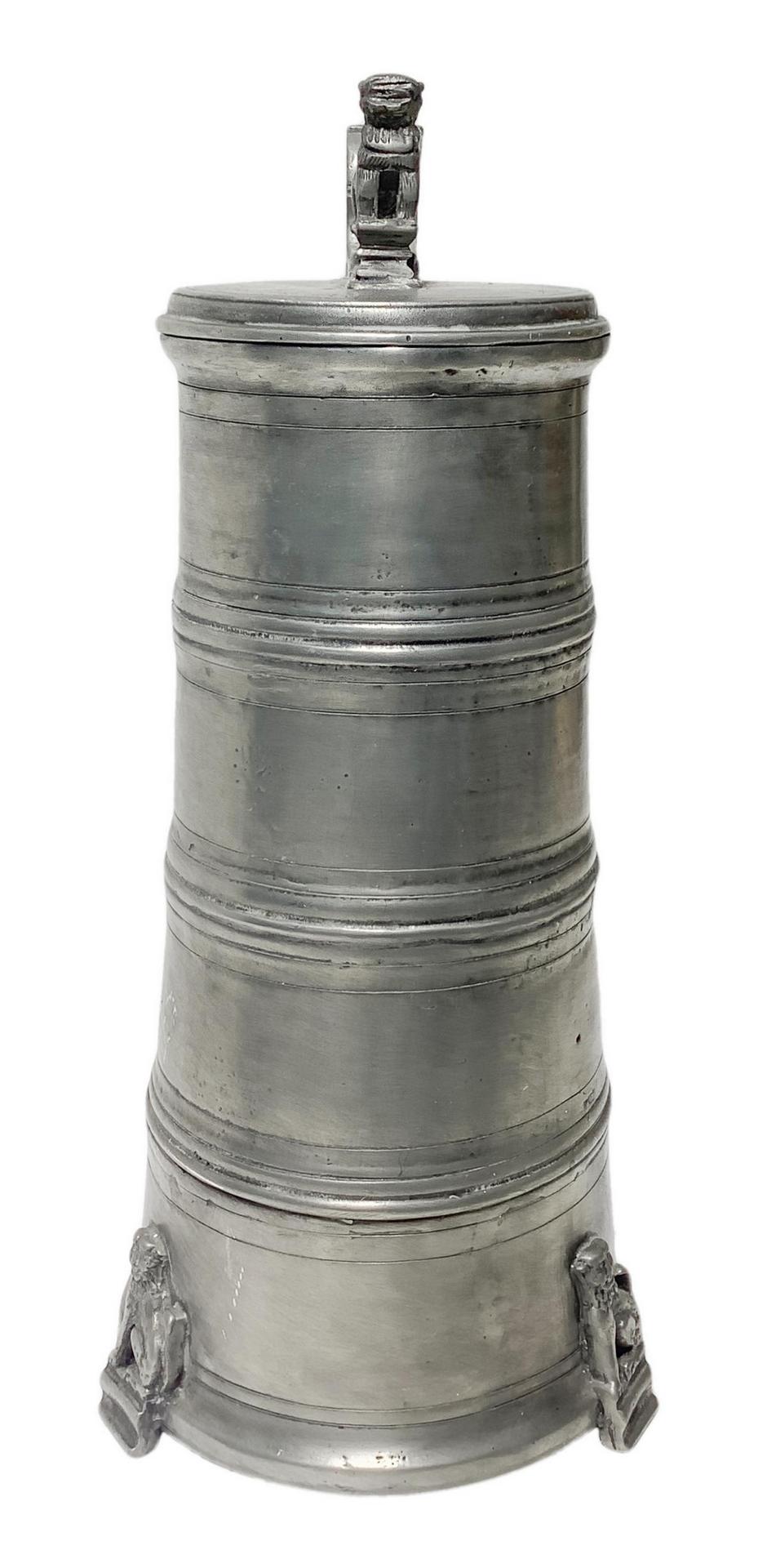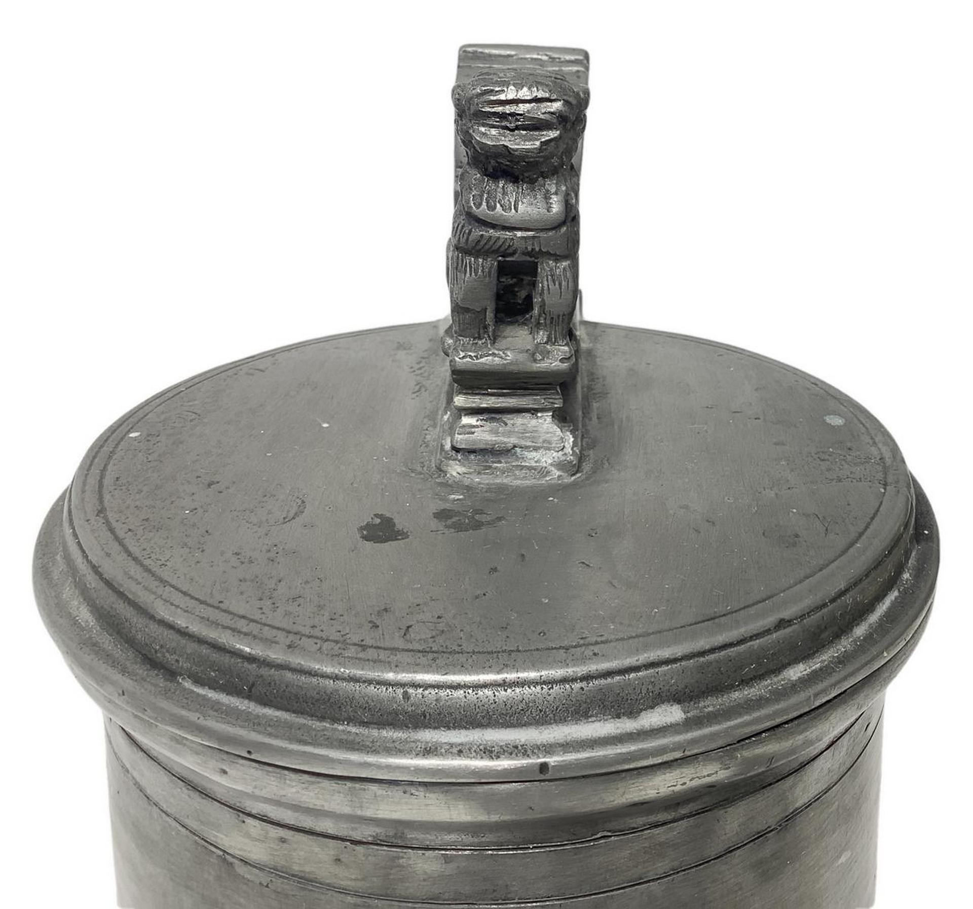 Antica caraffa in peltro. Manico con leone. Piedini con forme canine H cm 43