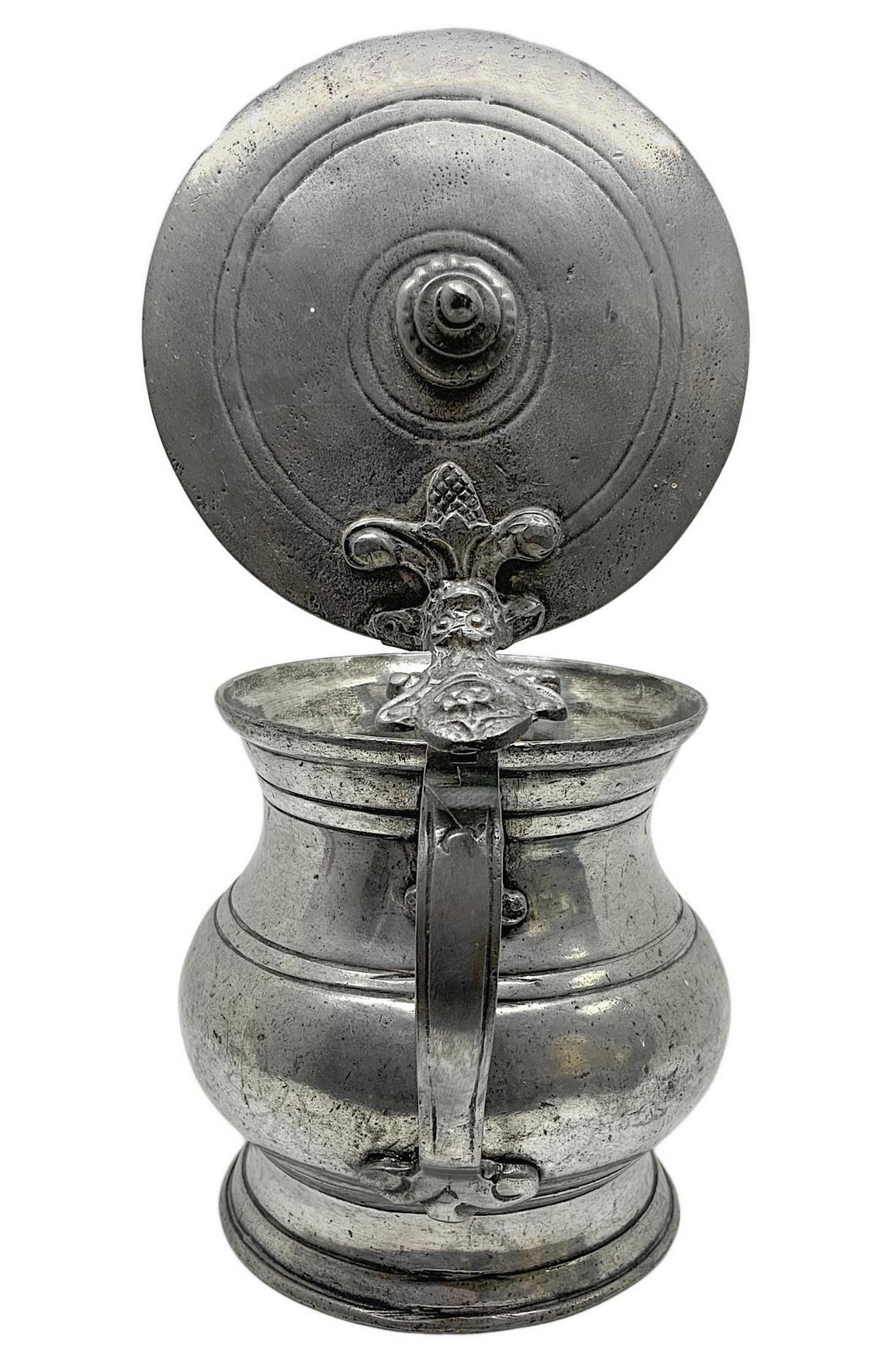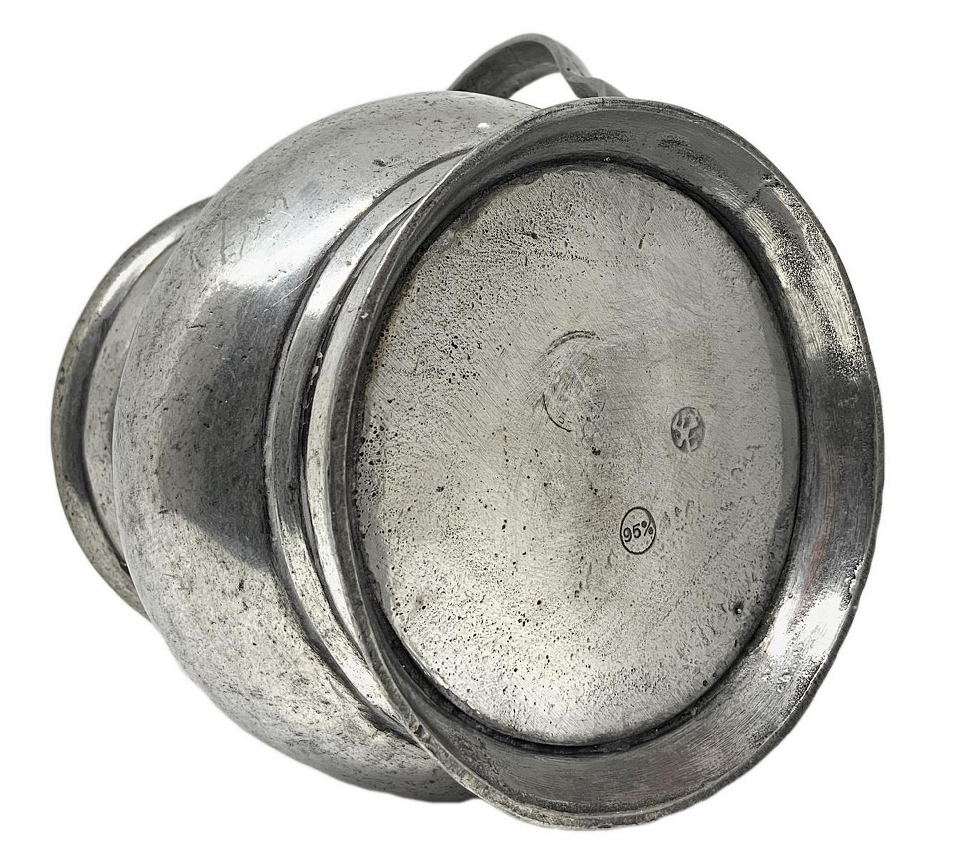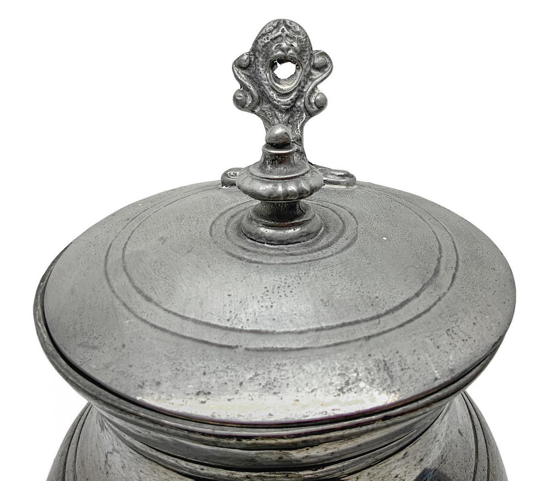 Lotto 522 | Borraccia in peltro con tappo con gancio rotondo 95, vari punzoni. H cm 19