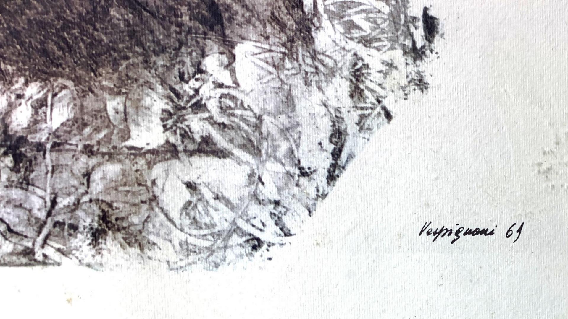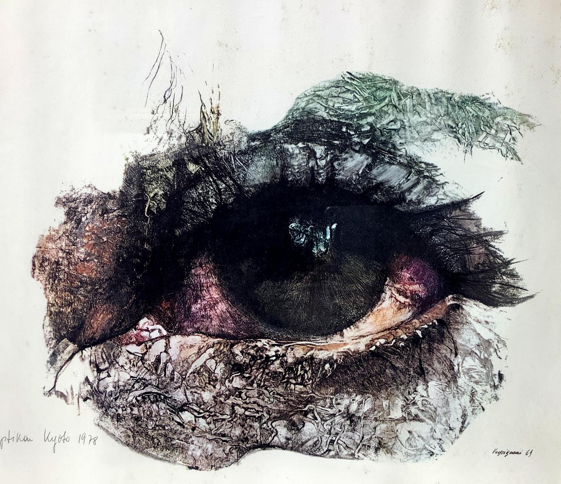 Stampa a colori raffigurante particolare di occhio umano. Firmato in basso a sinistra Optika Kyoto e a destra Vespignani 61. Renzo Vespignani (Roma 1924-2001). Cm 52x74