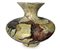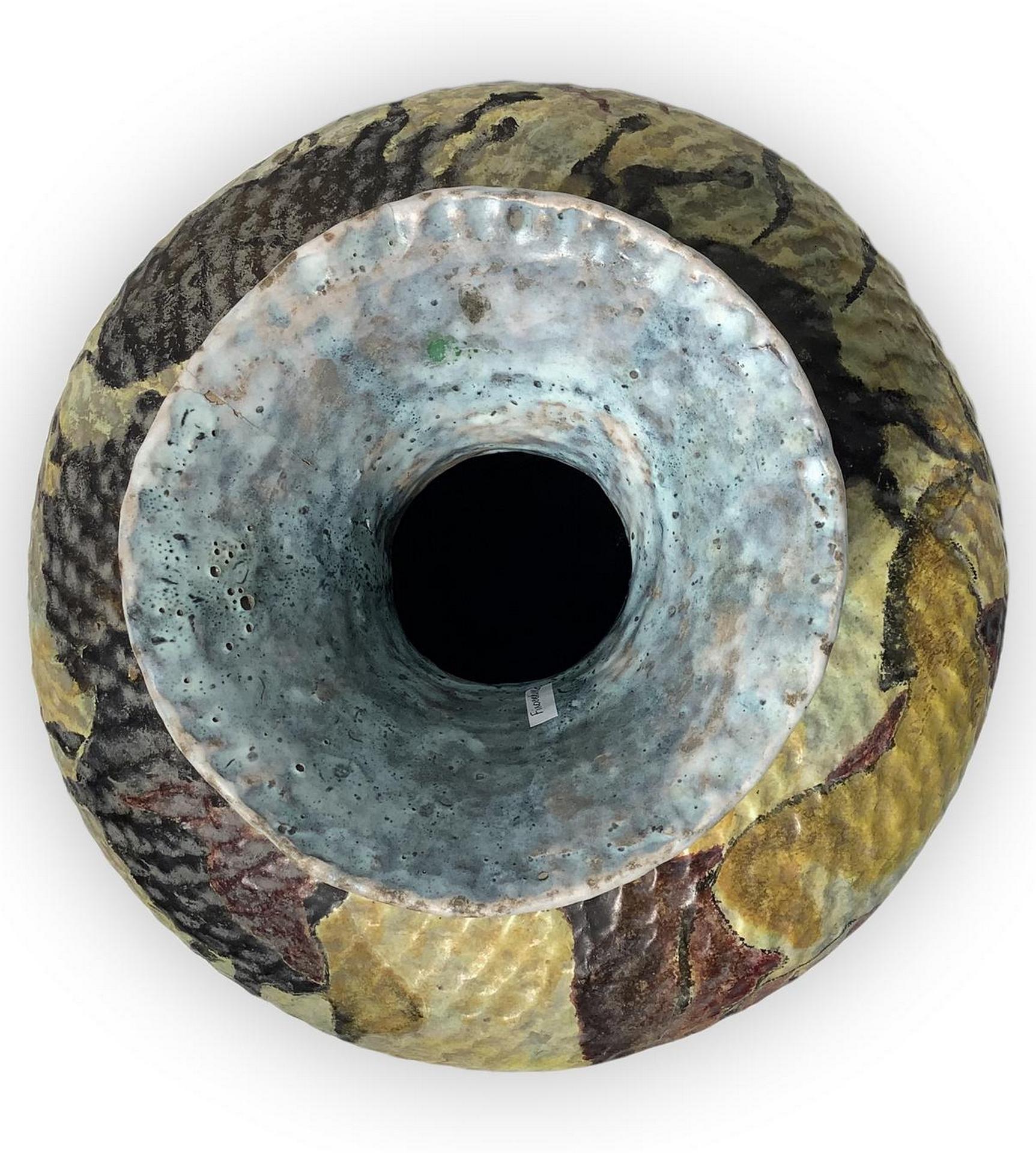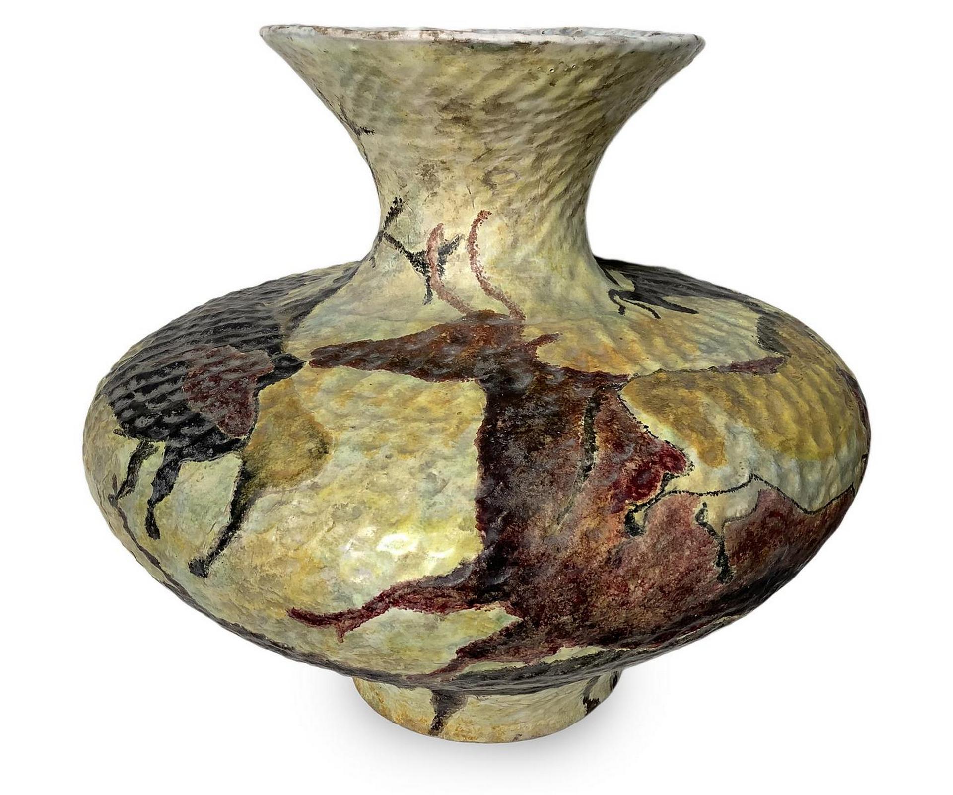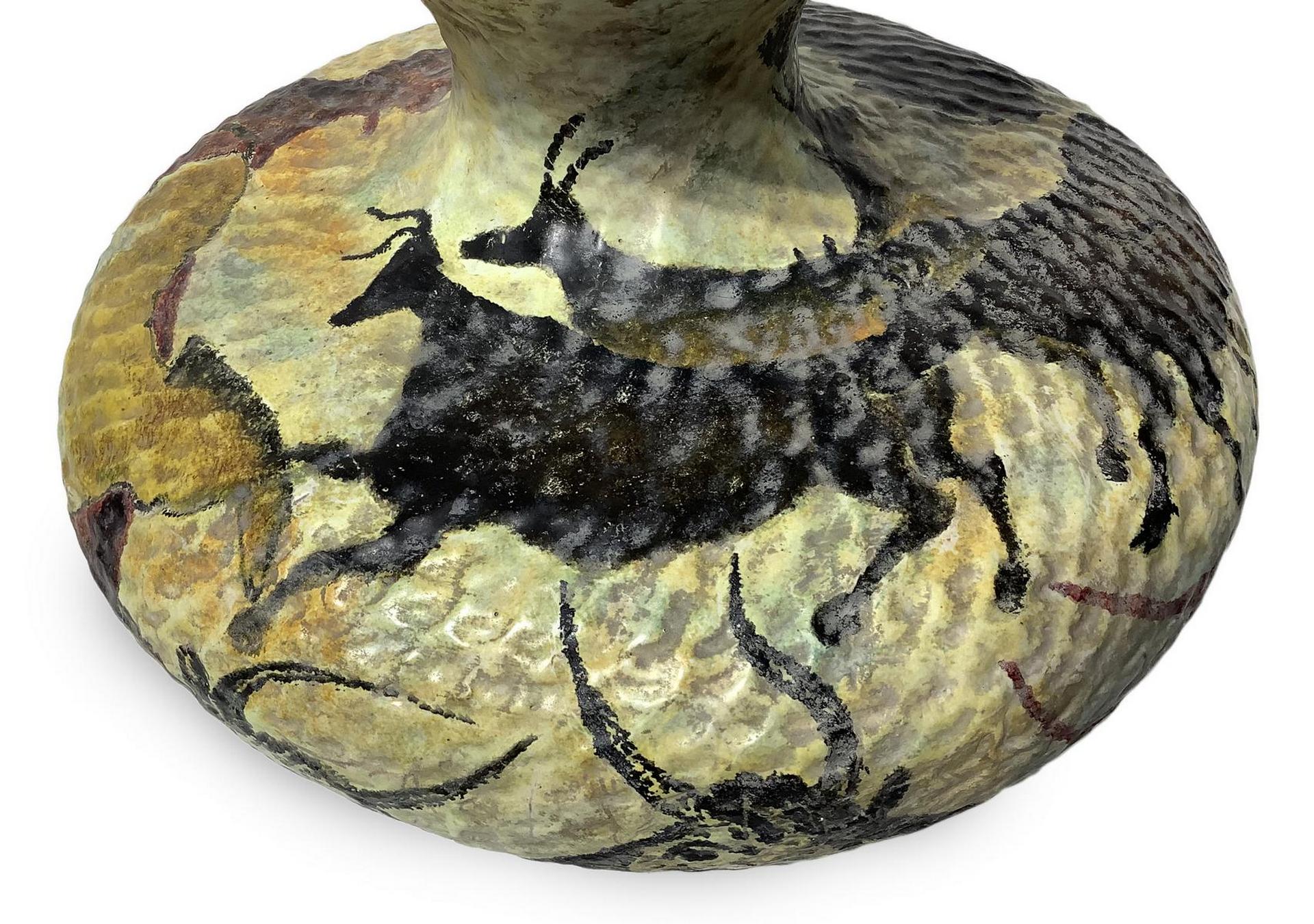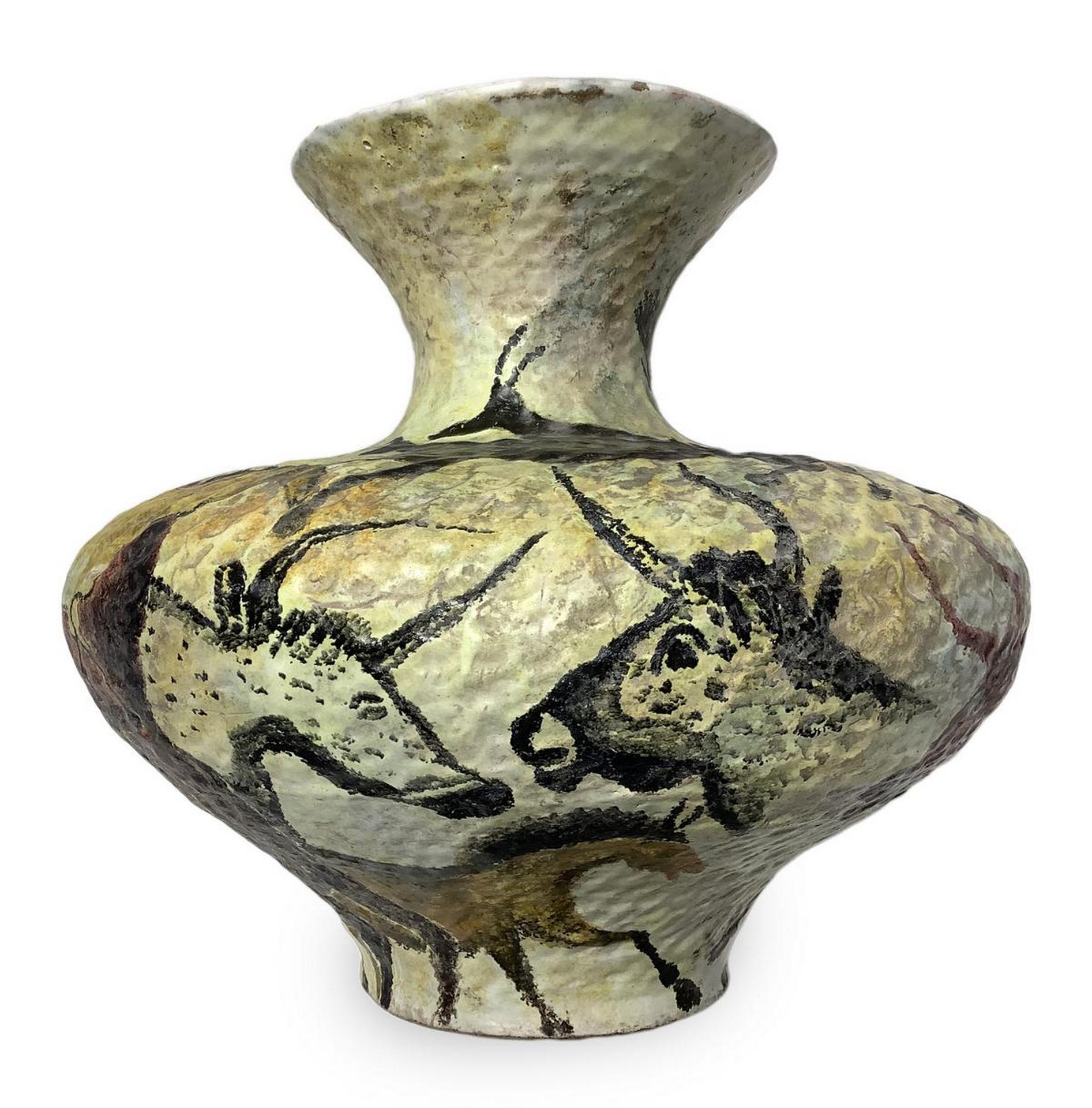 Vaso a balaustro in terracotta decorata in policromia riportante soggetti rupestri, fondo decorato con smalti a colaggio. H cm 36. Diametro massimo cm 40. Firmato alla base Finocchiaro. Esemplare unico.
