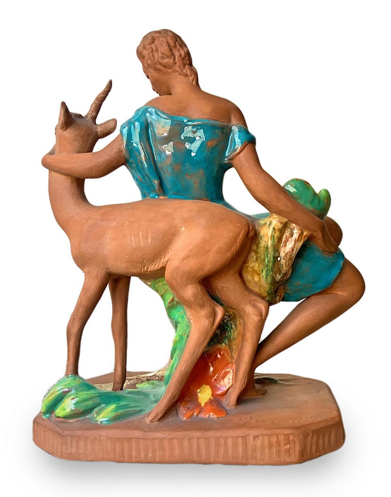 Zaccagnini, statua in terracotta raffigurante Diana e cervo, decorata in policromia. Piccole mancanze. Anni 40. Cm 25x17x9