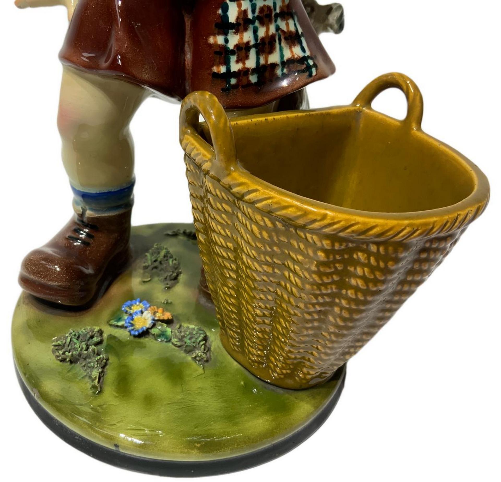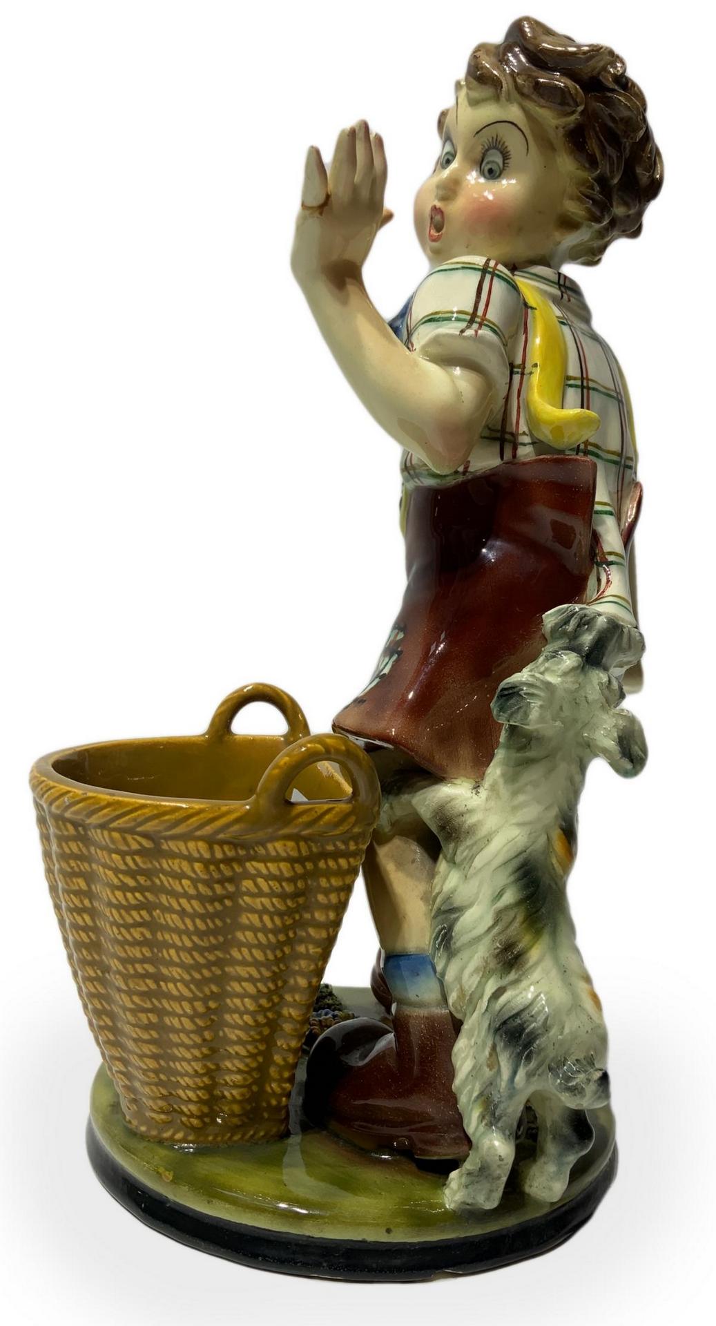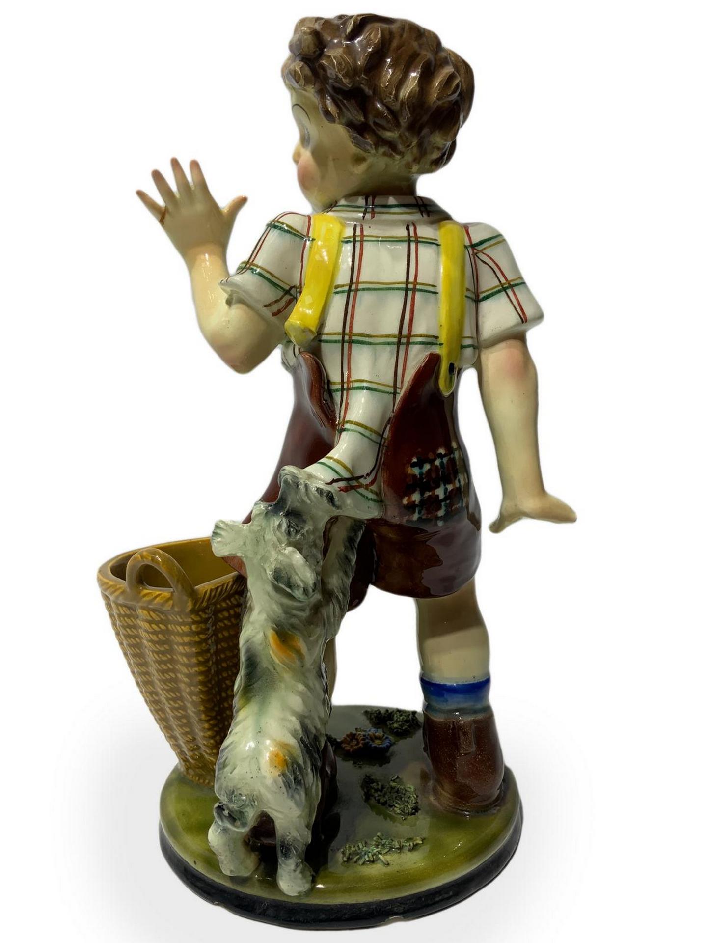 Scultura in terraglia raffigurante bambino con cane e cesto, inizi XX...